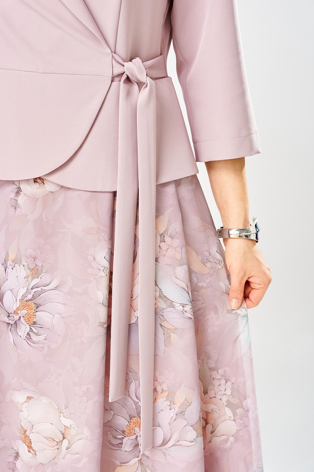 Юбка со складками по линии талии, расширенная к низу, на подкладке. По линии талии вставлен завязывающийся пояс.