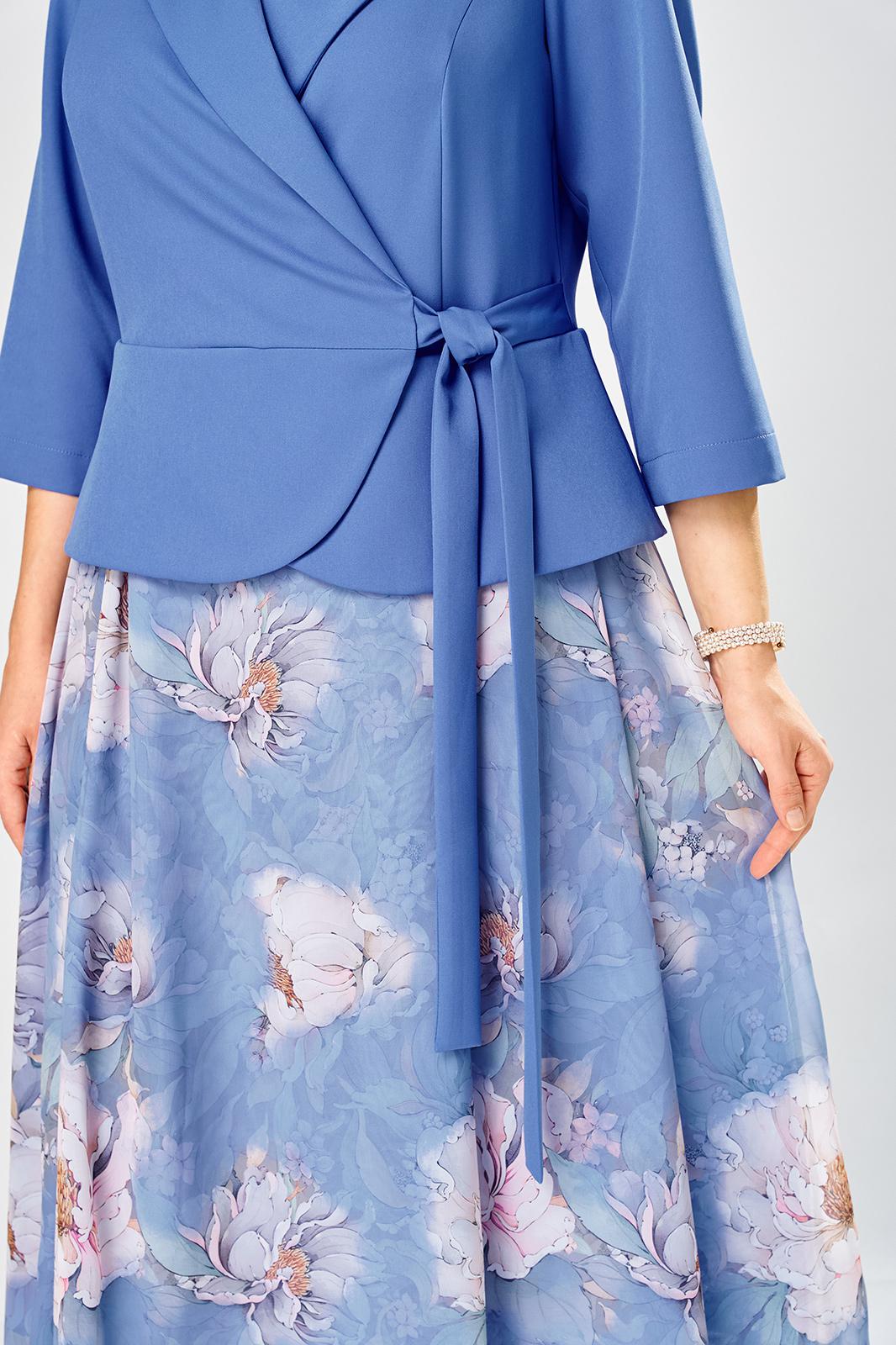 Лиф из плательной ткани, юбка из шифона. Платье с запахом, горловина с воротником пиджачного типа с отложными лацканами. Рукава втачные, длина 3/4.