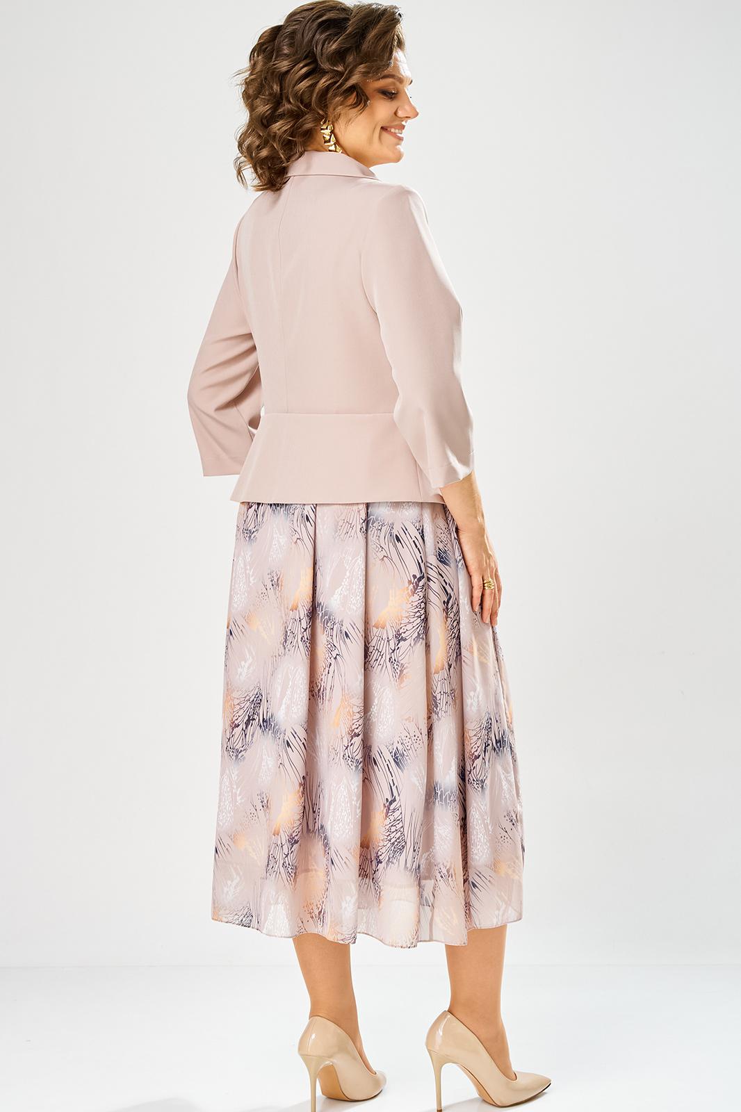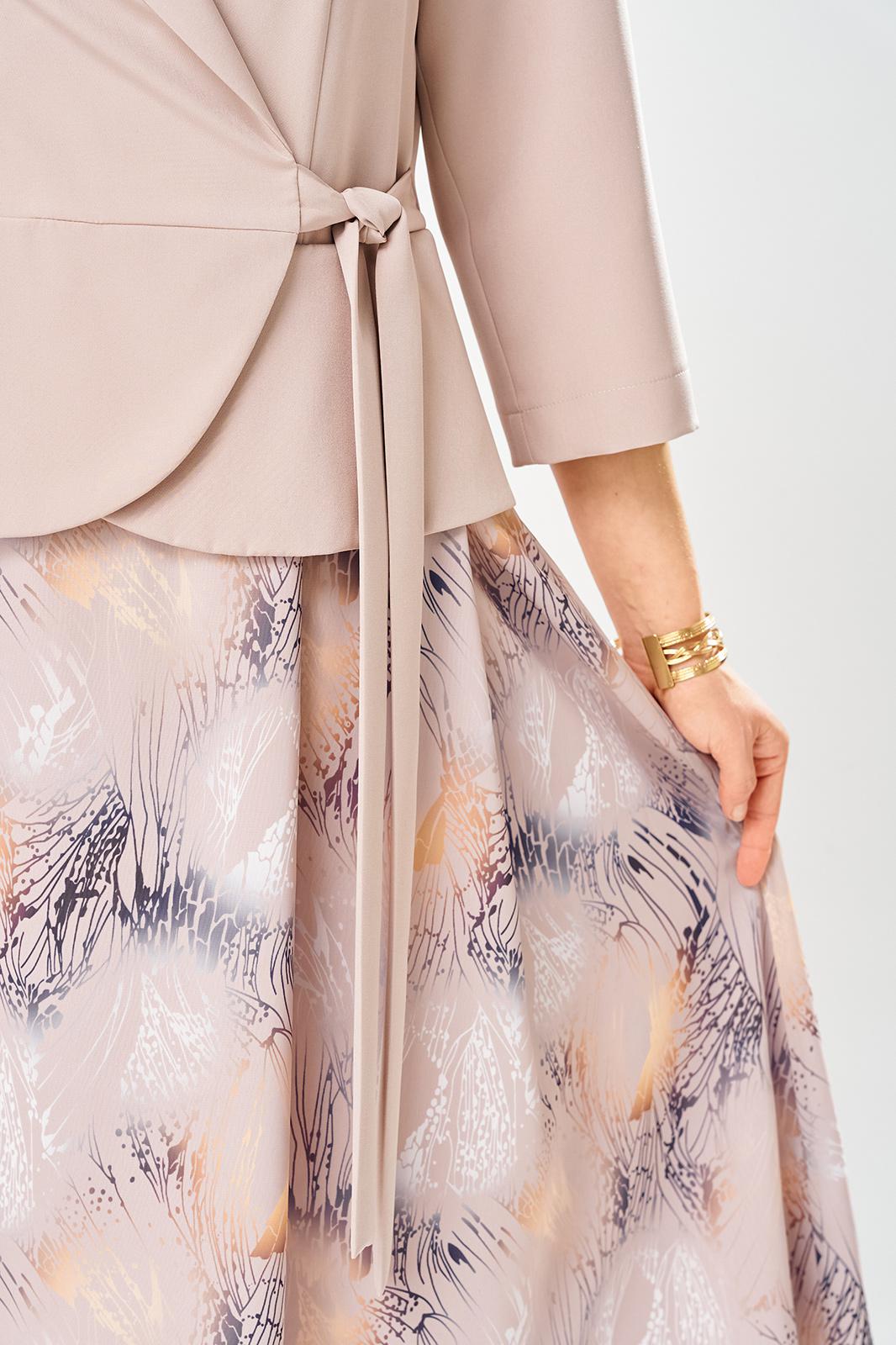 Юбка со складками по линии талии, расширенная к низу, на подкладке. По линии талии вставлен завязывающийся пояс.