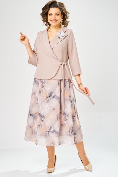 Лиф из плательной ткани, юбка из шифона. Платье с запахом, горловина с воротником пиджачного типа с отложными лацканами. Рукава втачные, длина 3/4.