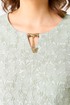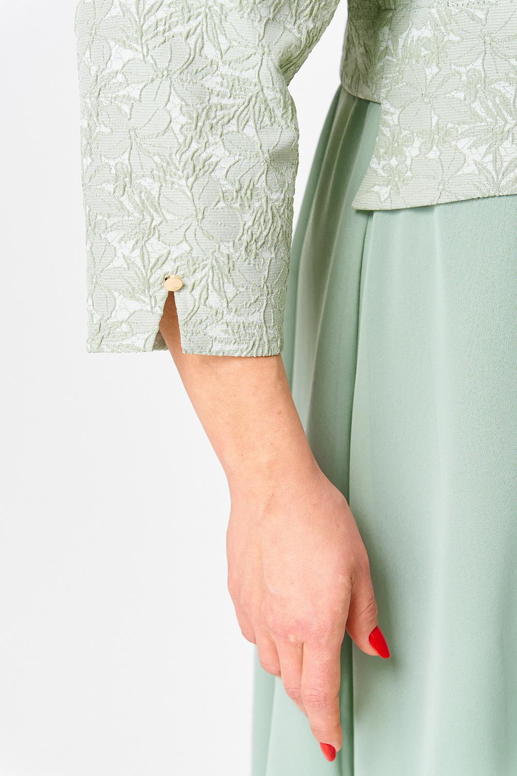 Лиф из жаккарда, горловина круглая с декоративным элементом по центру, по низу лифа ответная складка, по переду низ асимметричный, рукава втачные, по низу декоративный элемент с пуговицей.