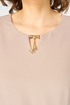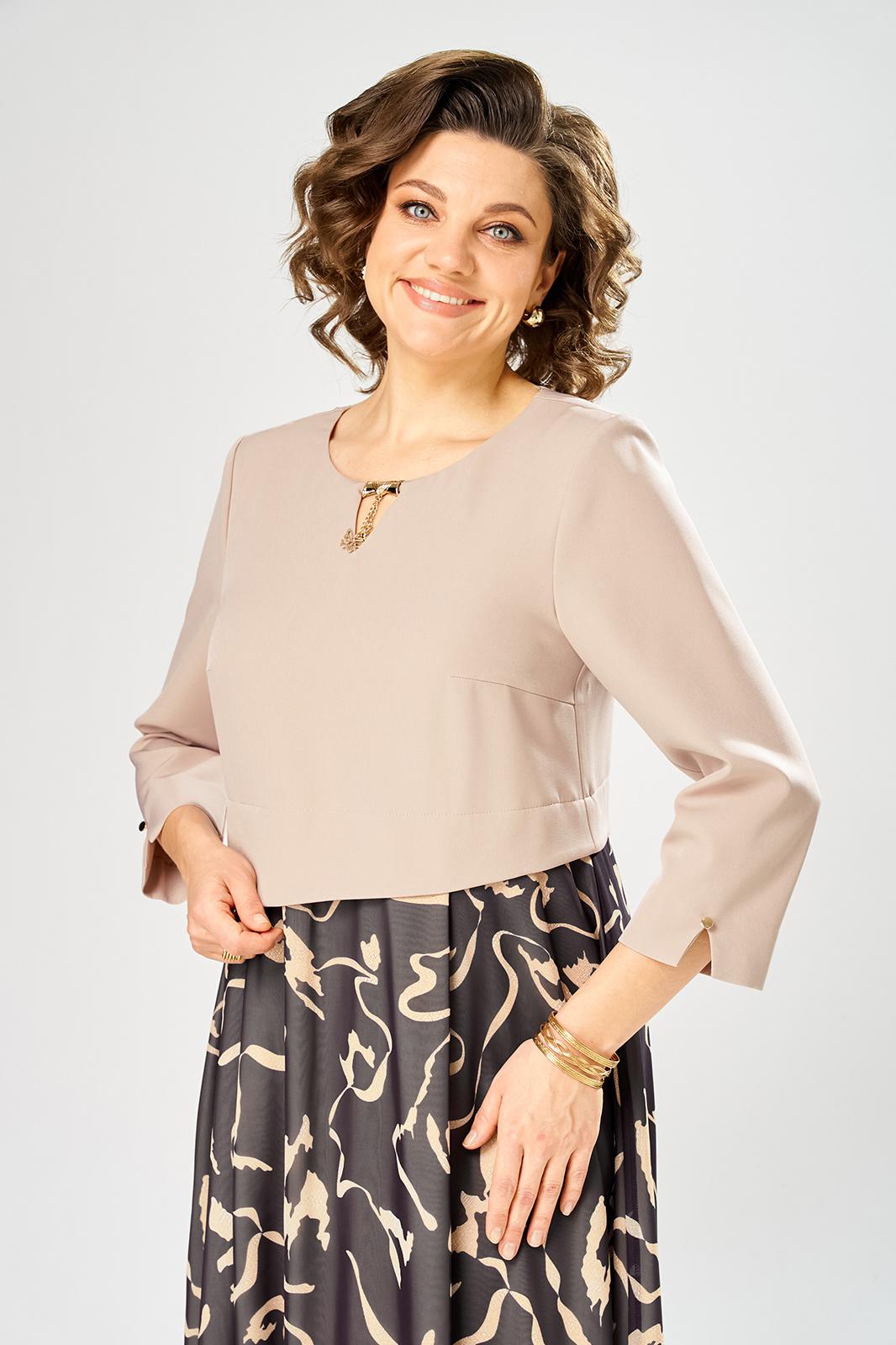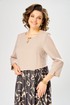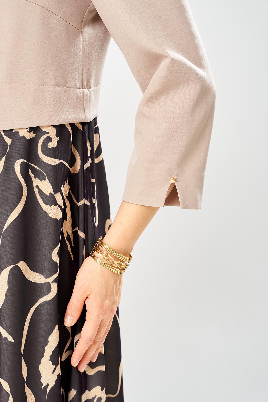 Лиф из плательной ткани, горловина круглая с декоративным элементом по центру, по низу лифа ответная складка, по переду низ асимметричный, рукава втачные, по низу декоративный элемент с пуговицей.