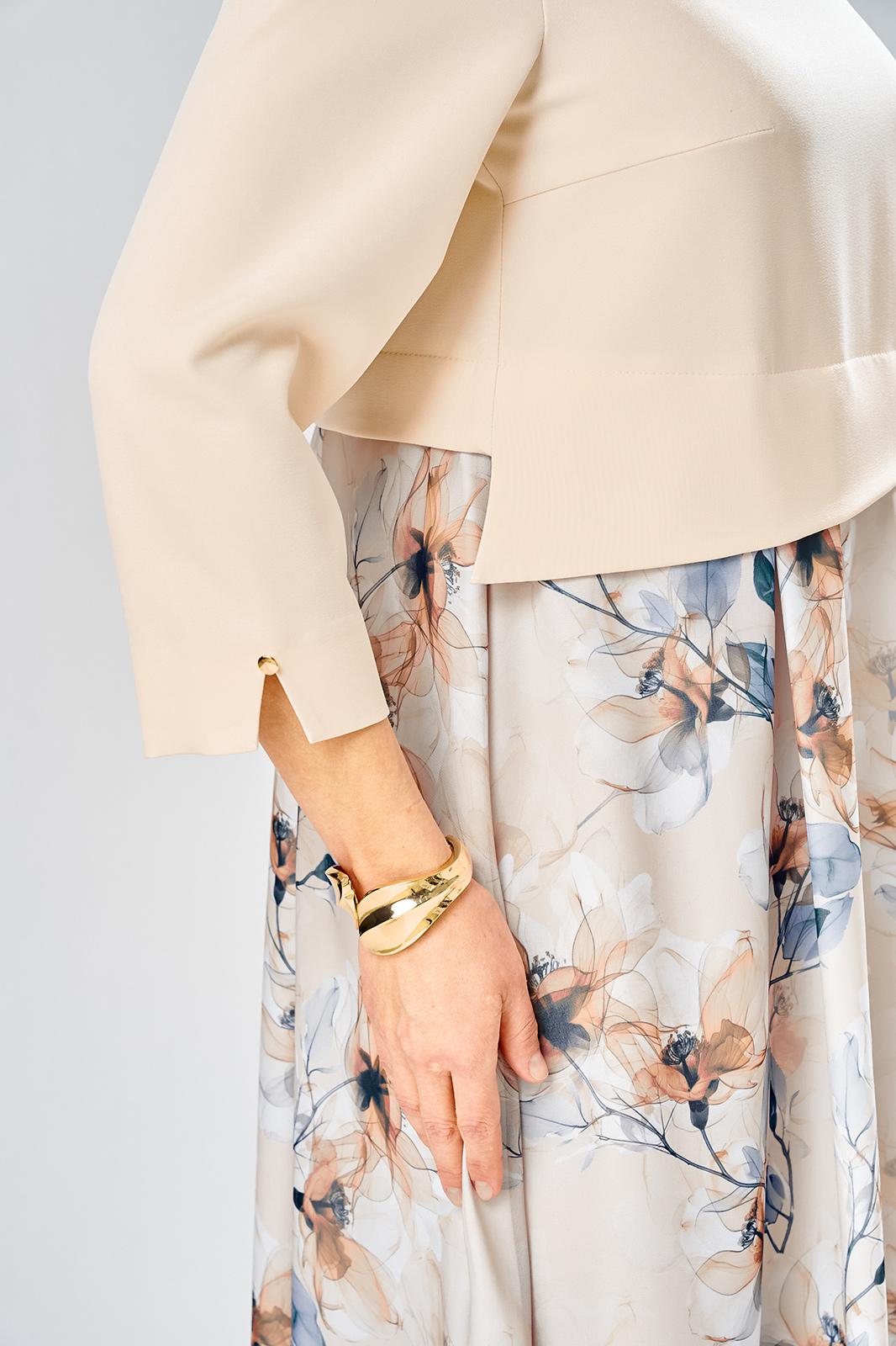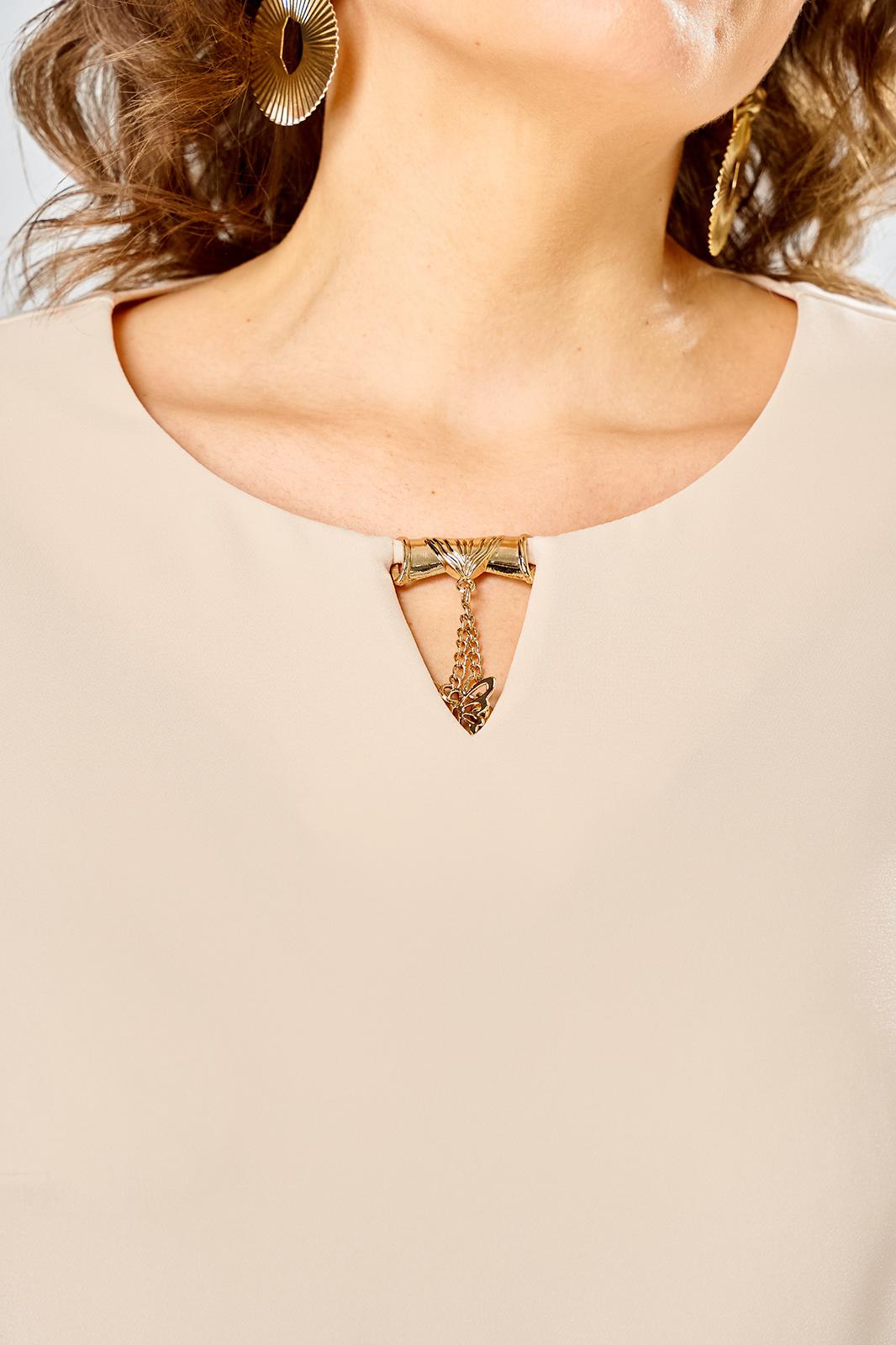 Лиф из плательной ткани, горловина круглая с декоративным элементом по центру, по низу лифа ответная складка, по переду низ асимметричный, рукава втачные, по низу декоративный элемент с пуговицей.
