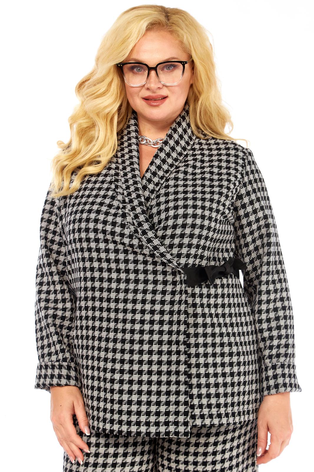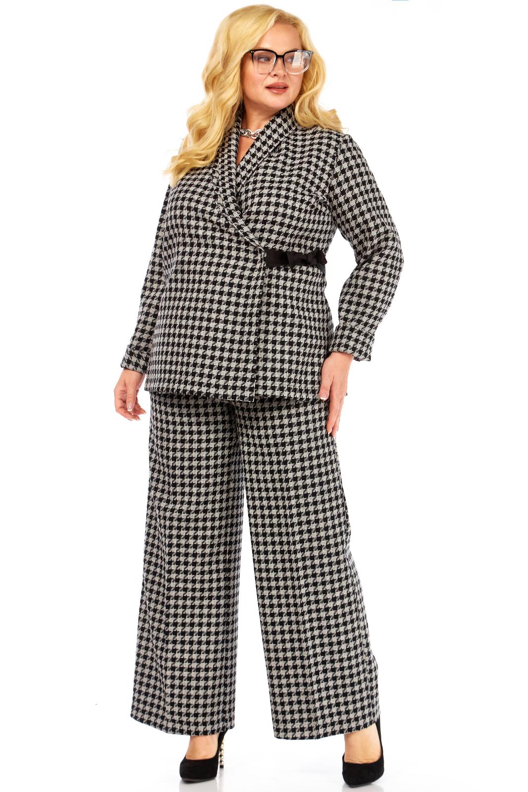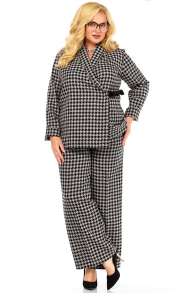 Длина жакета 72 см, рукав с учетом манжеты 62 см, манжета 12 см. Длина брюк по боковому шву с учетом пояса 106 см.