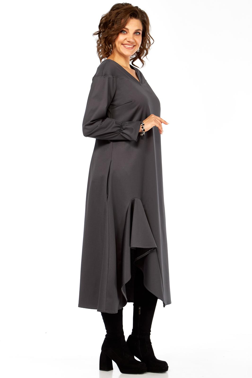 • Основная особенность: Асимметричная объемная драпировка (волан) в левой нижней части подола. Эта деталь выполнена из того же материала, создавая эффект динамичного, сложенного элемента, который придает платью уникальный архитектурный вид.