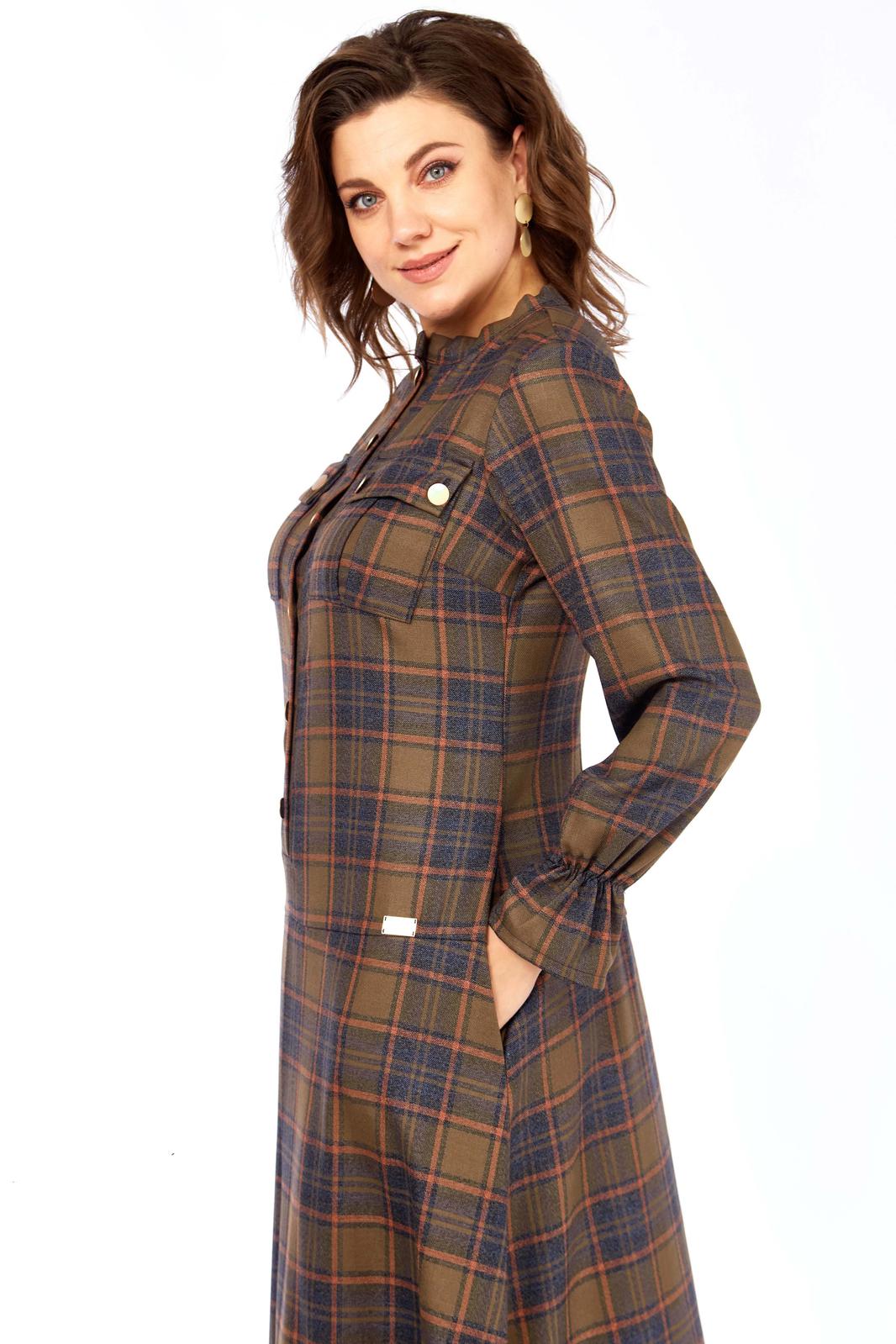 Фасон платья сочетает элегантность и функциональность: строгий воротник-стойка и золотистые кнопки на накладных карманах придают образу решительности и характера, в то время как расклешенная юбка и мягкие, собранные манжеты добавляют игривости, женственности и легкости в движении. Это платье для женщины, которая не боится выделяться, любит эксперименты со стилем и ценит комфорт, не жертвуя элегантностью.