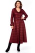 Платье миди, силуэт полуприлегающий в верхней части, переходящий в расклешенный А-силуэт к низу, создающий эффект удлиненной и струящейся фигуры. Воротник широкий, плоский, отложной, с закругленными краями. Лиф с застежкой на петли пуговицы. Декоративный ряд контрастных пуговиц, подчеркивает V-образный вырез и утончает силуэт. Для лучшего прилегания в платье выполнены нагрудные выточки и выточки по спинке, для большего удобства обработаны карманы-хулиганы. Рукава длинные, втачные, с легкой сборкой на манжетах, что добавляет мягкости и женственности. По полочке и спинке идет подрез чуть ниже линии талии, от которого по полочке юбки выполнена встречная складка. Длина изделия по спинке 120 см., длина рукава 62 см.