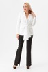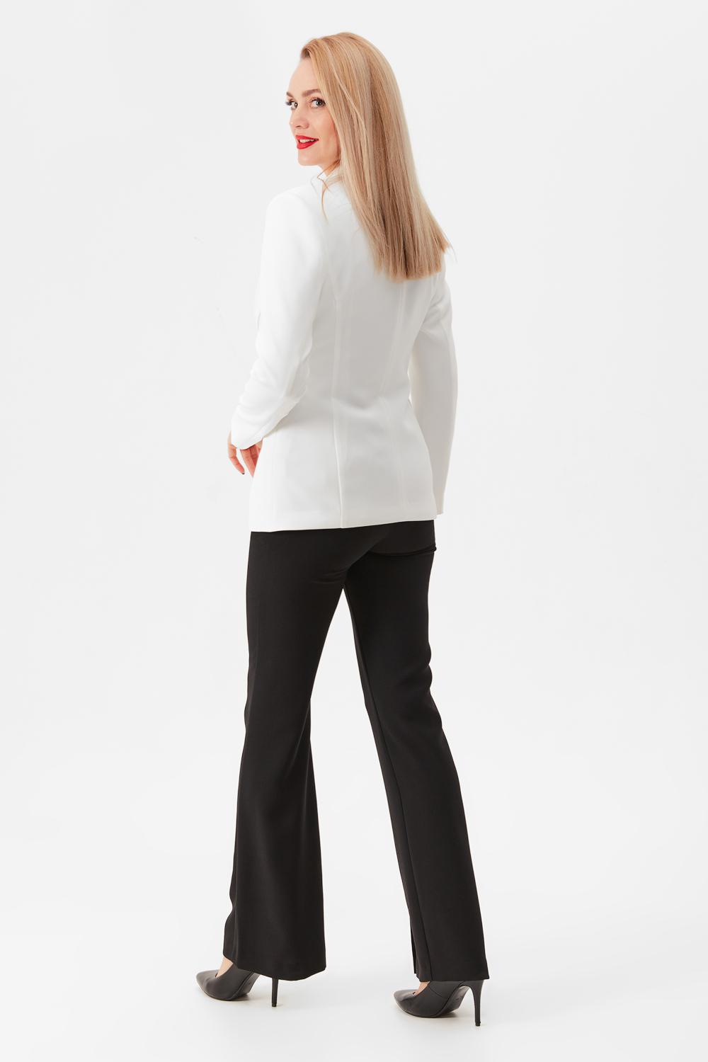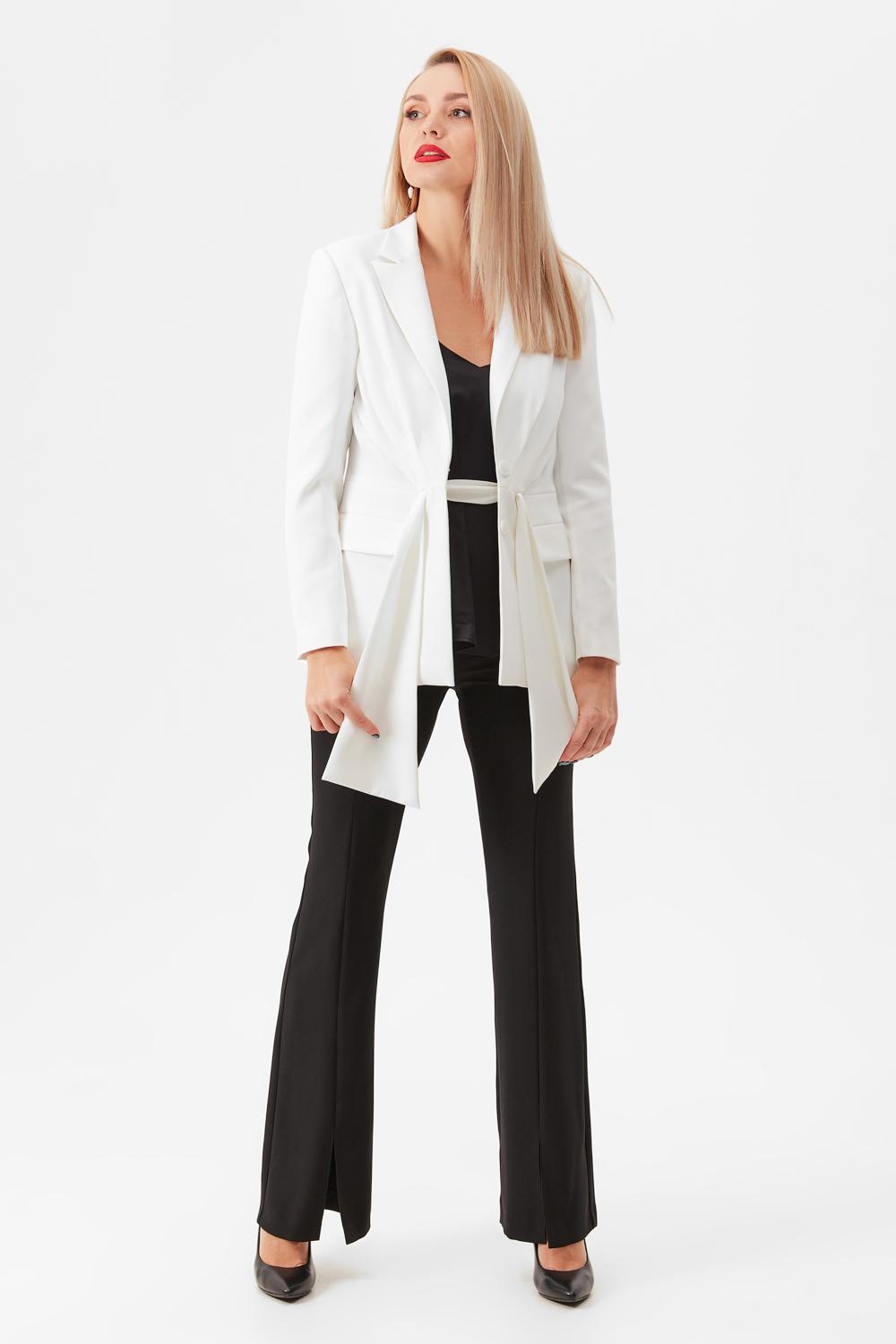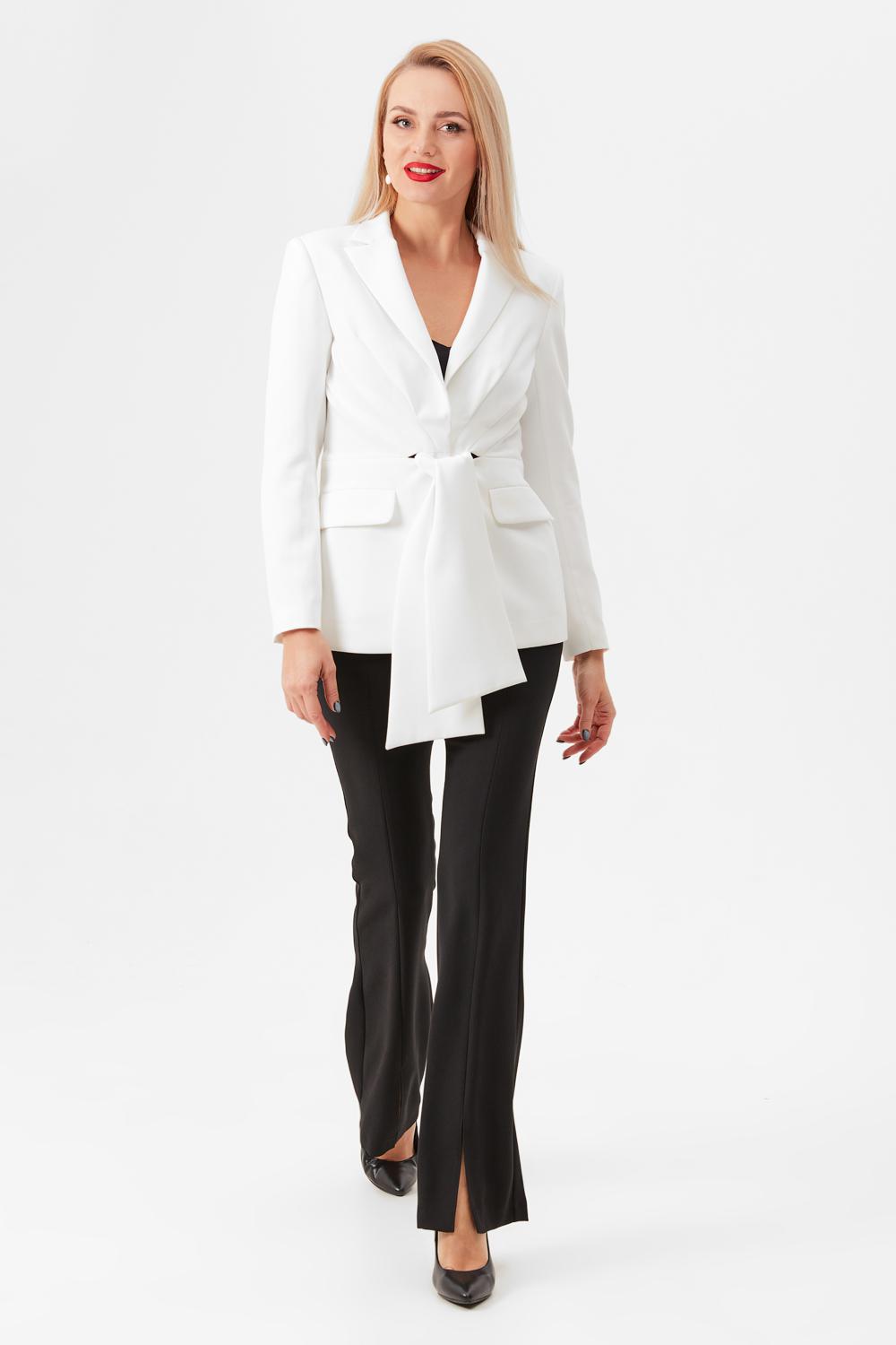 Жакет из костюмной ткани полуприлегающего силуэта. По переду от талии вверх идут складки. Воротник отложной с лацканами, по борту жакет застегивается на потайные петли. По талии протягивается пояс-бант. Жакет на подкладке.