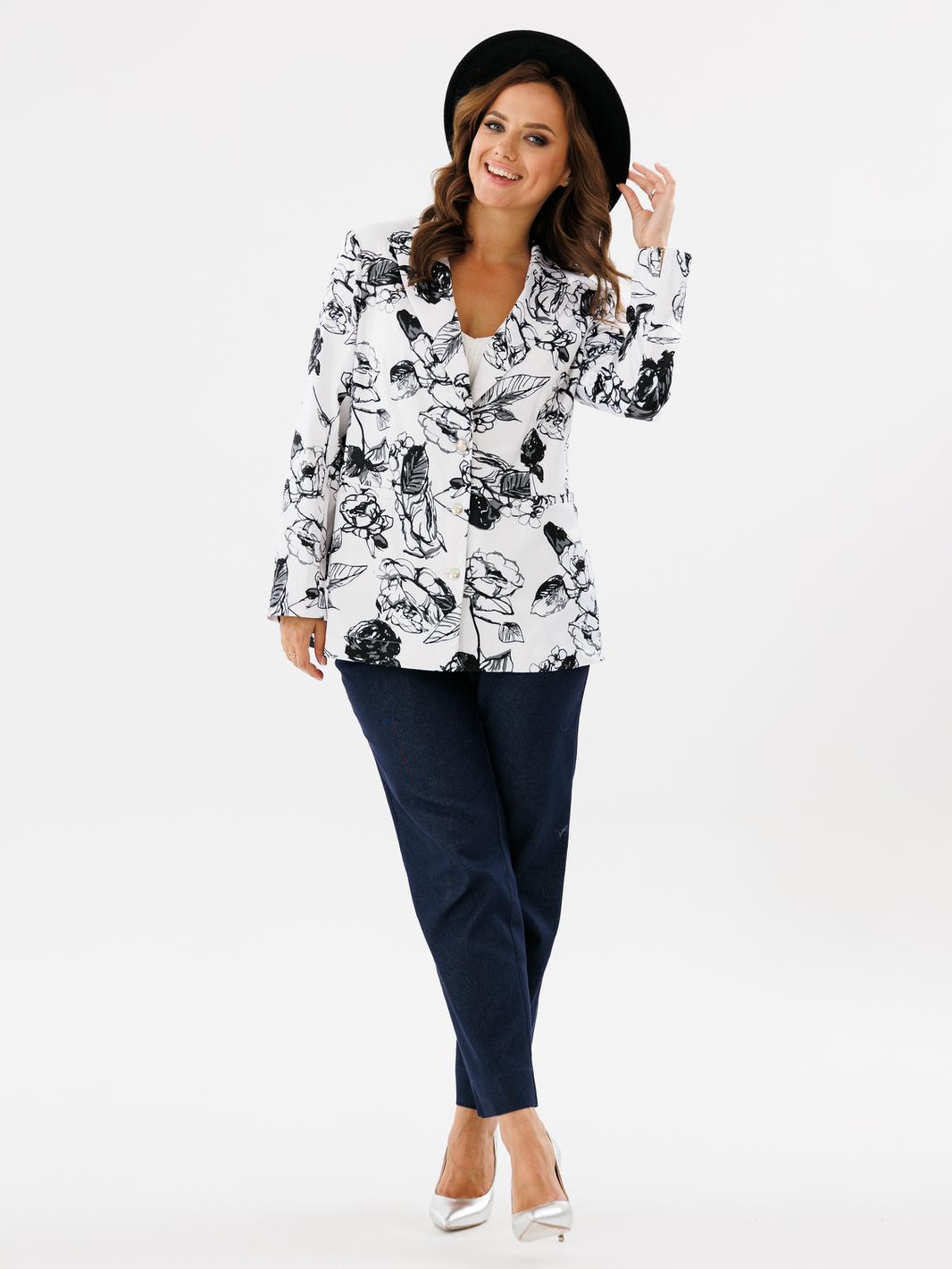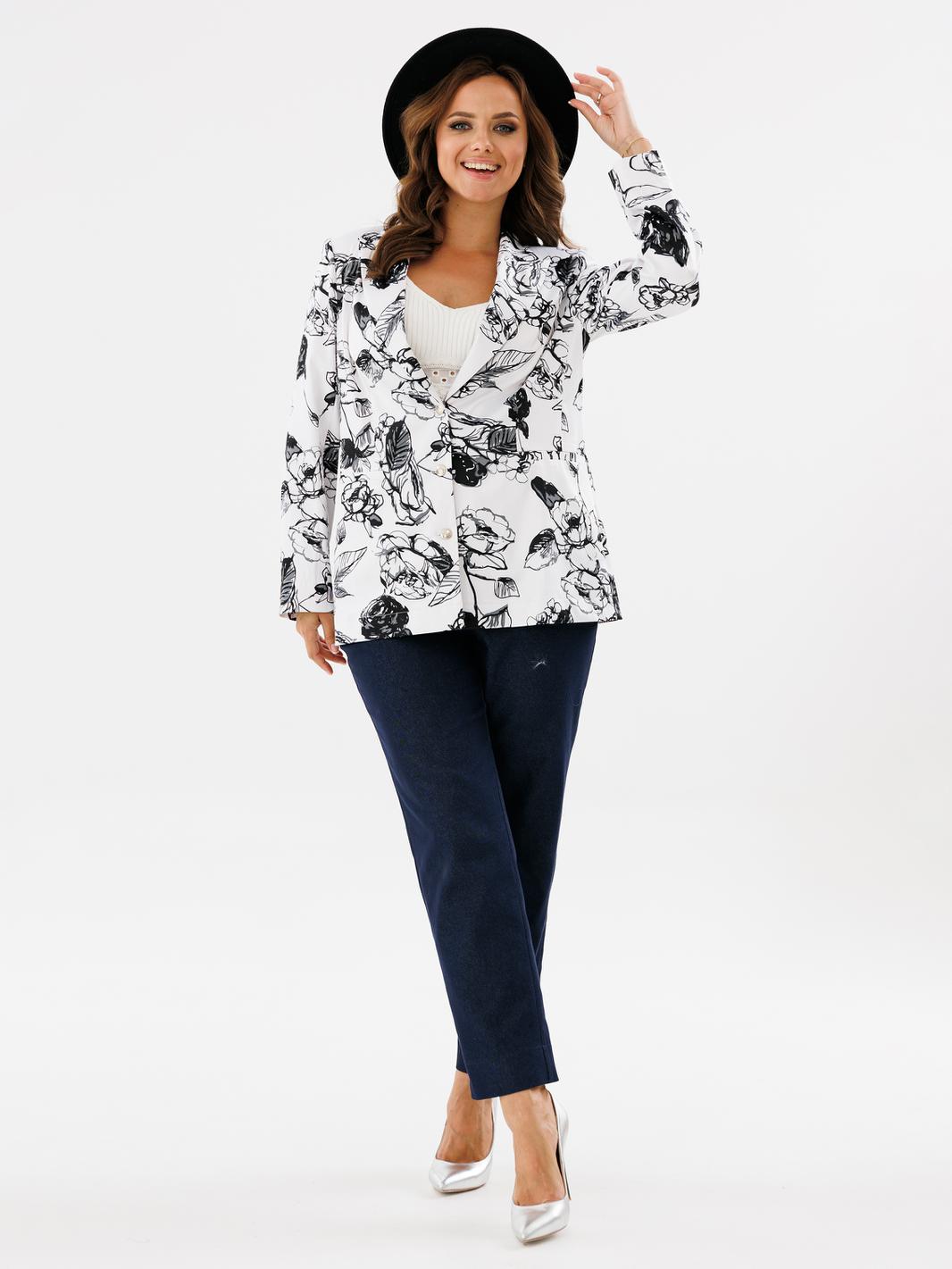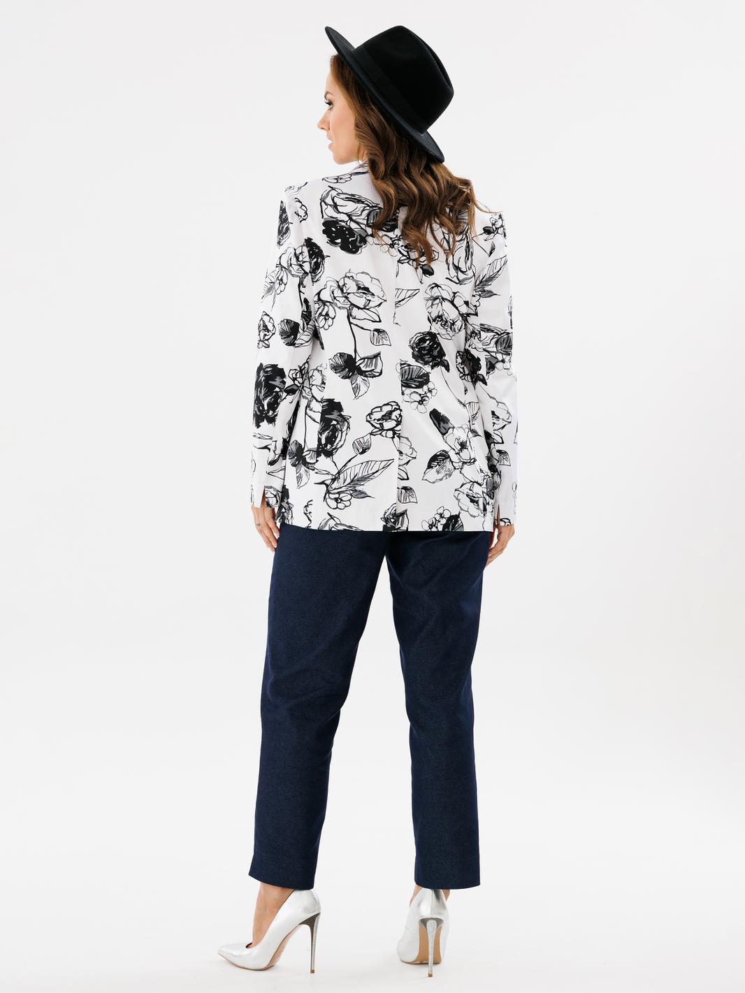 Двубортный жакет полуприлегающего силуэта, ткань хлопок сатин. По переду обработаны прорезные карманы с листочкой. Отложной воротник с лацканами. Рукав втачной длинный с разрезами по низу рукава. Спинка жакета со шлицой. Жакет без подкладки. Украшением данной модели являются стильные пуговицы. Длина жакета по спинке 67см., длина рукава 61,5см.