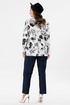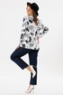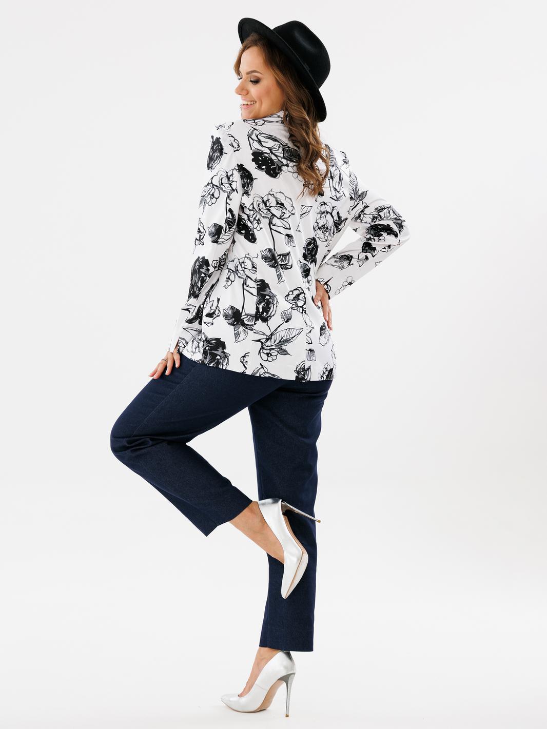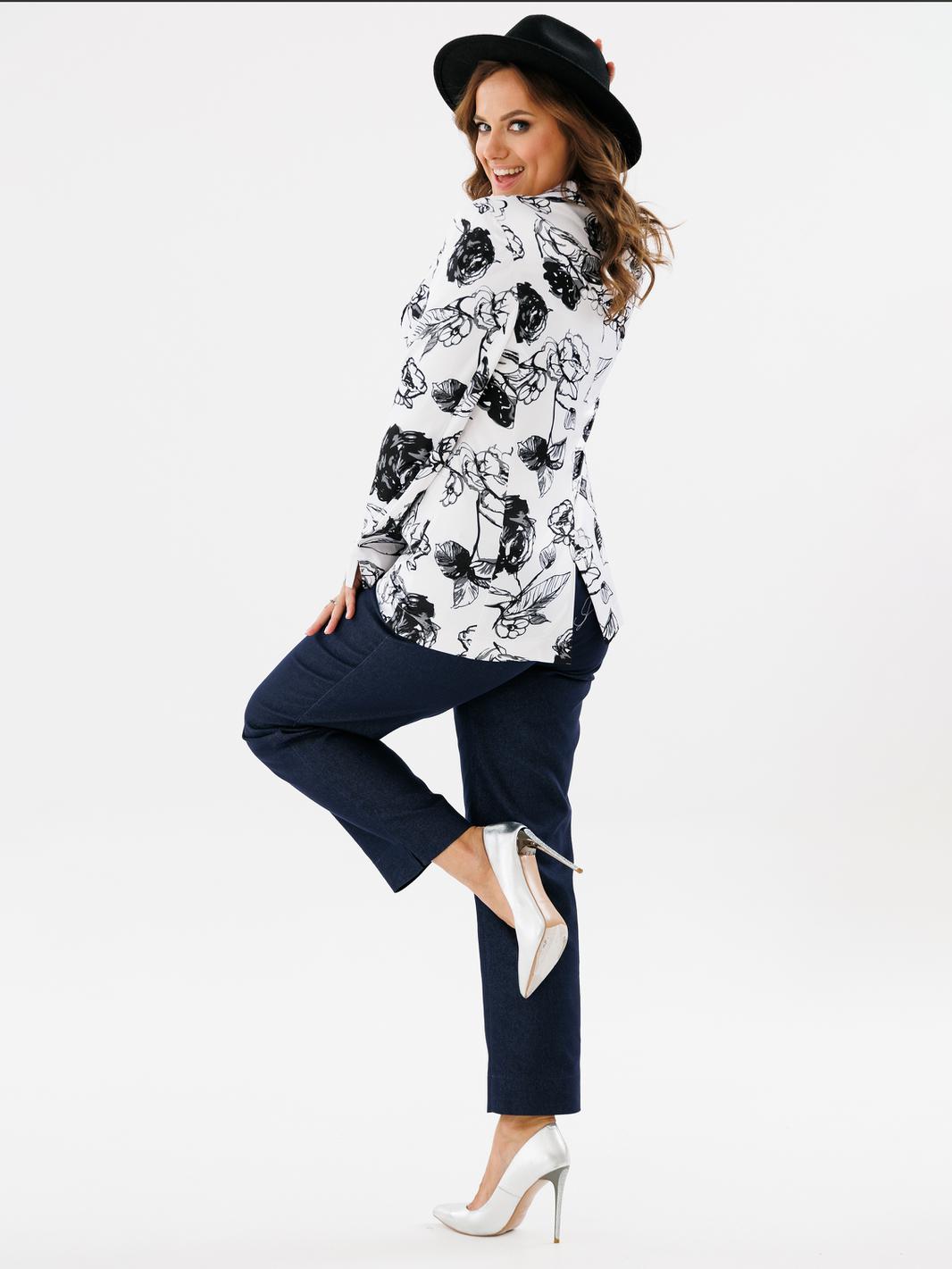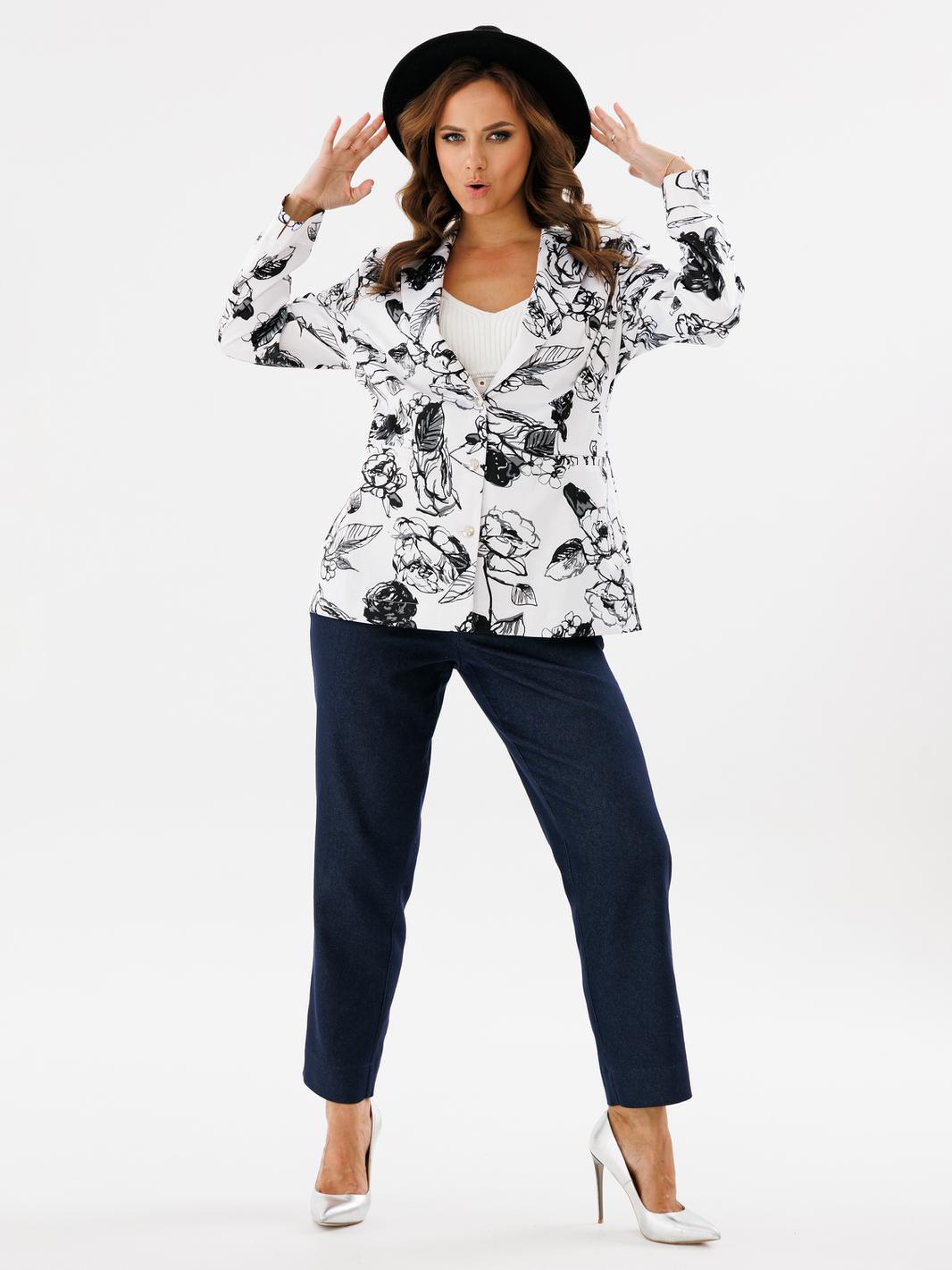 Двубортный жакет полуприлегающего силуэта, ткань хлопок сатин. По переду обработаны прорезные карманы с листочкой. Отложной воротник с лацканами. Рукав втачной длинный с разрезами по низу рукава. Спинка жакета со шлицой. Жакет без подкладки. Украшением данной модели являются стильные пуговицы. Длина жакета по спинке 67см., длина рукава 61,5см.