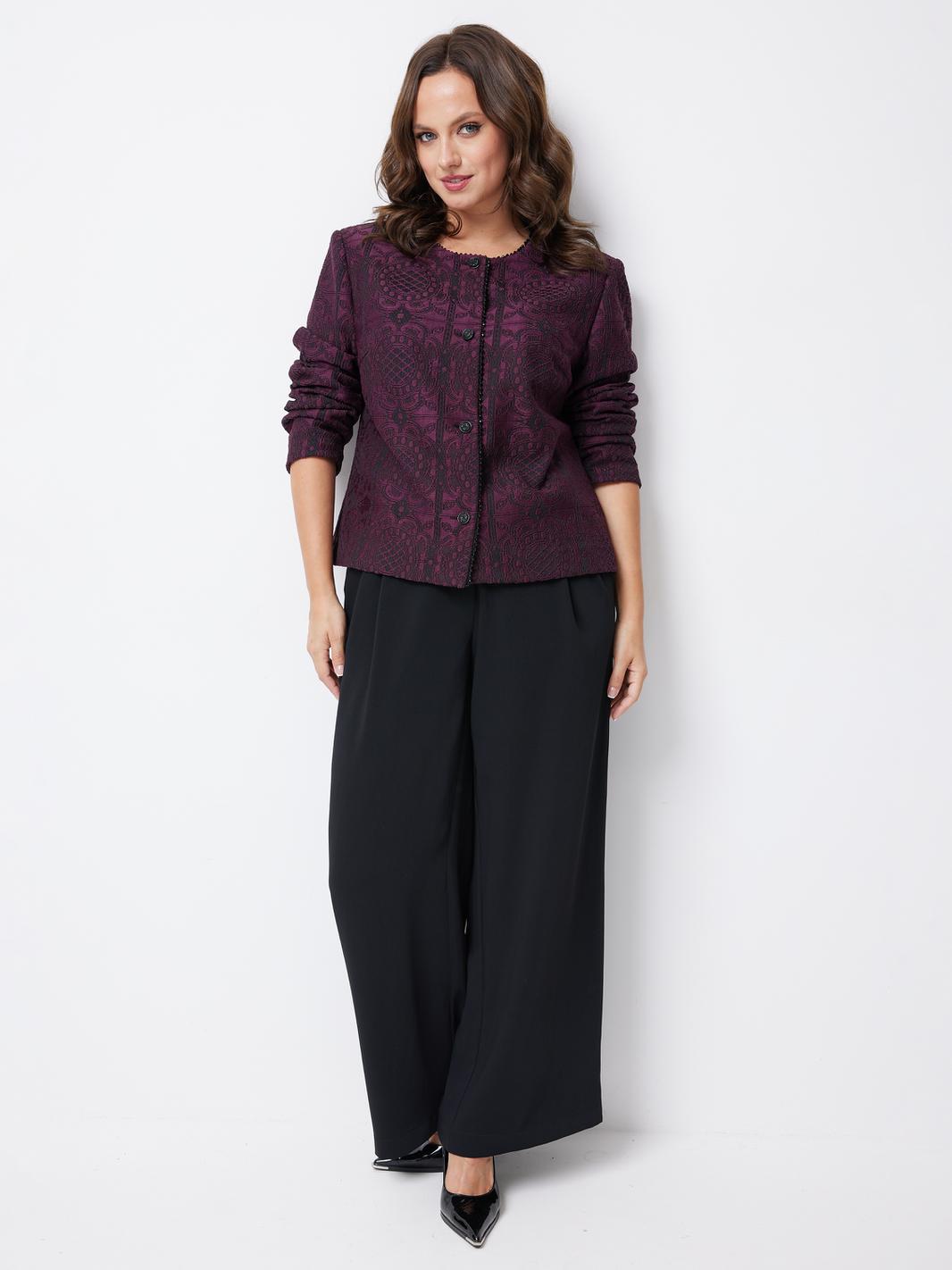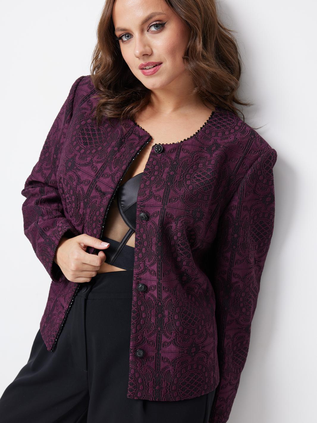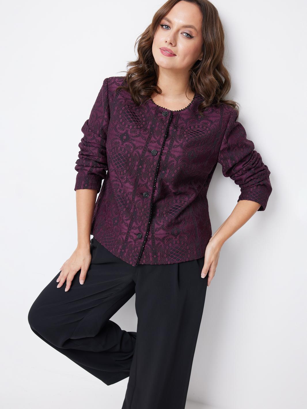 Особое внимание привлекает отделочная тесьма с жемчужинами, которая украшает край правого борта и горловину жакета. Это изысканное дополнение придает изделию роскошный и росшар, делая его настоящим украшением гардероба.