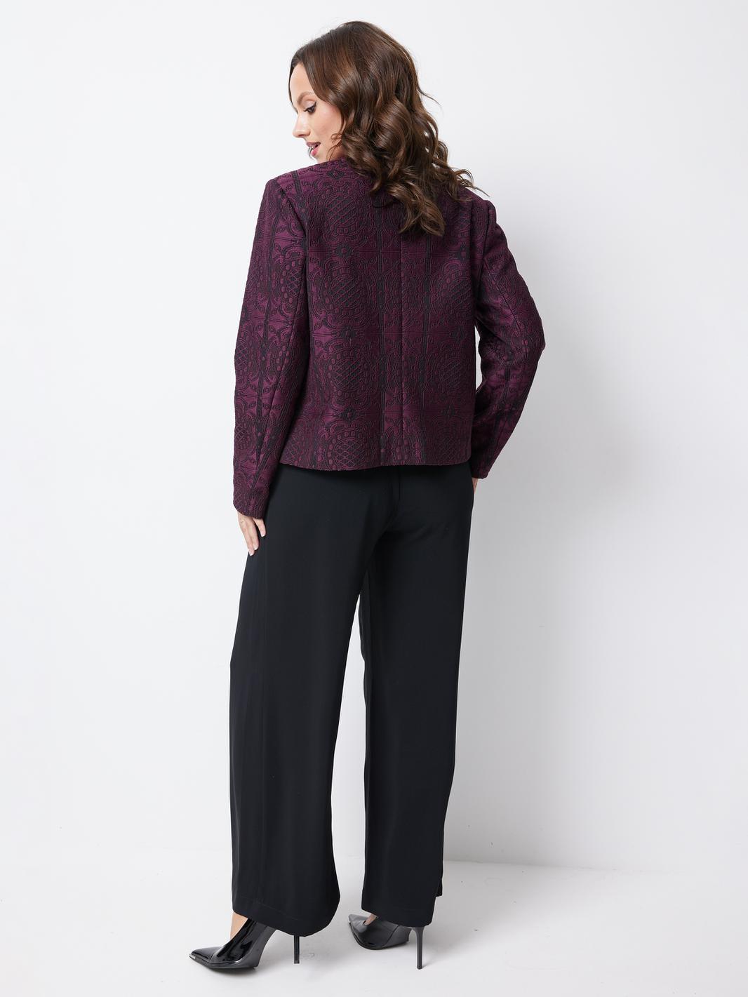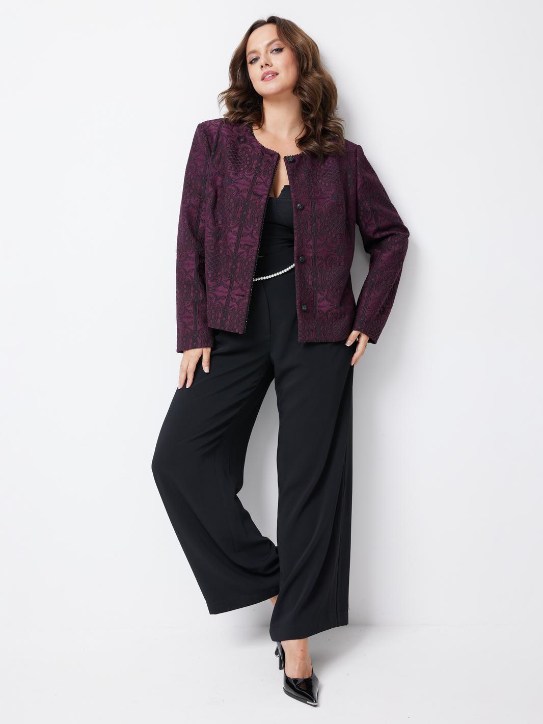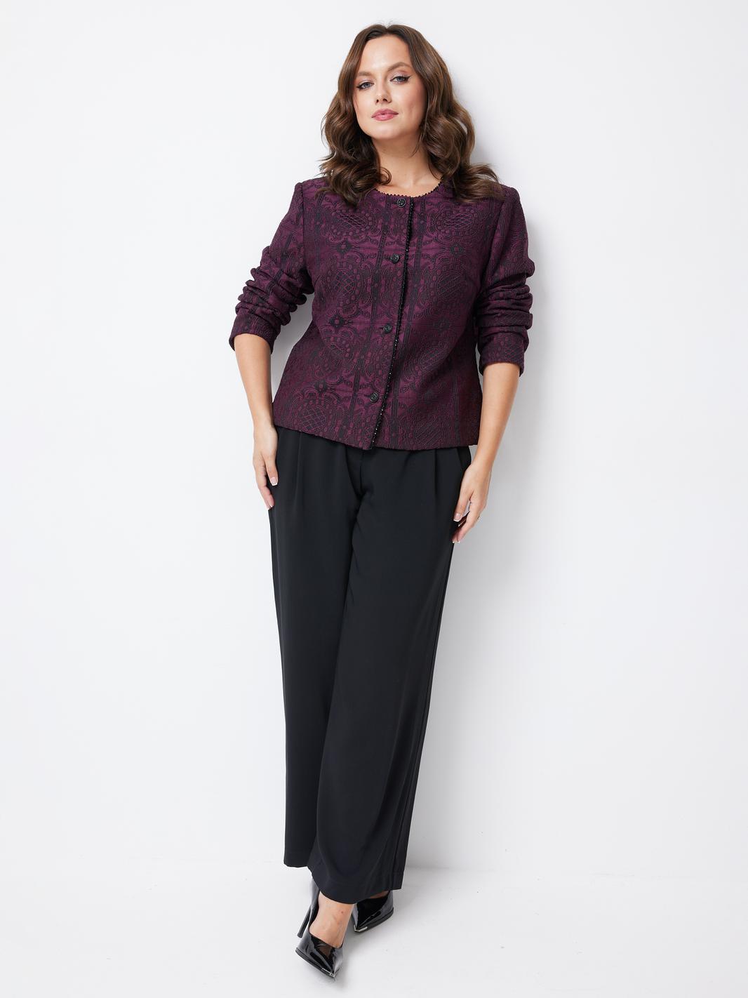 Особое внимание привлекает отделочная тесьма с жемчужинами, которая украшает край правого борта и горловину жакета. Это изысканное дополнение придает изделию роскошный и росшар, делая его настоящим украшением гардероба.