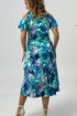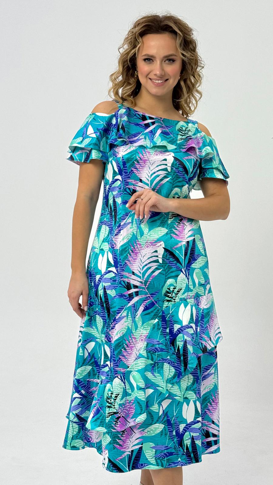 Платье из ткани яркого летнего дизайна подойдет на все случаи жизни: в отпуск, на прогулку, в гости и да же в офисе Вы не будете выглядеть скучно. Открытые плечи и прикрытые воланами руки обеспечат Вам комфорт и уверенность даже жарким летним днем. Полуприлегающий силуэт и расширение к низу выигрышно подчеркнет Вашу фигуру.