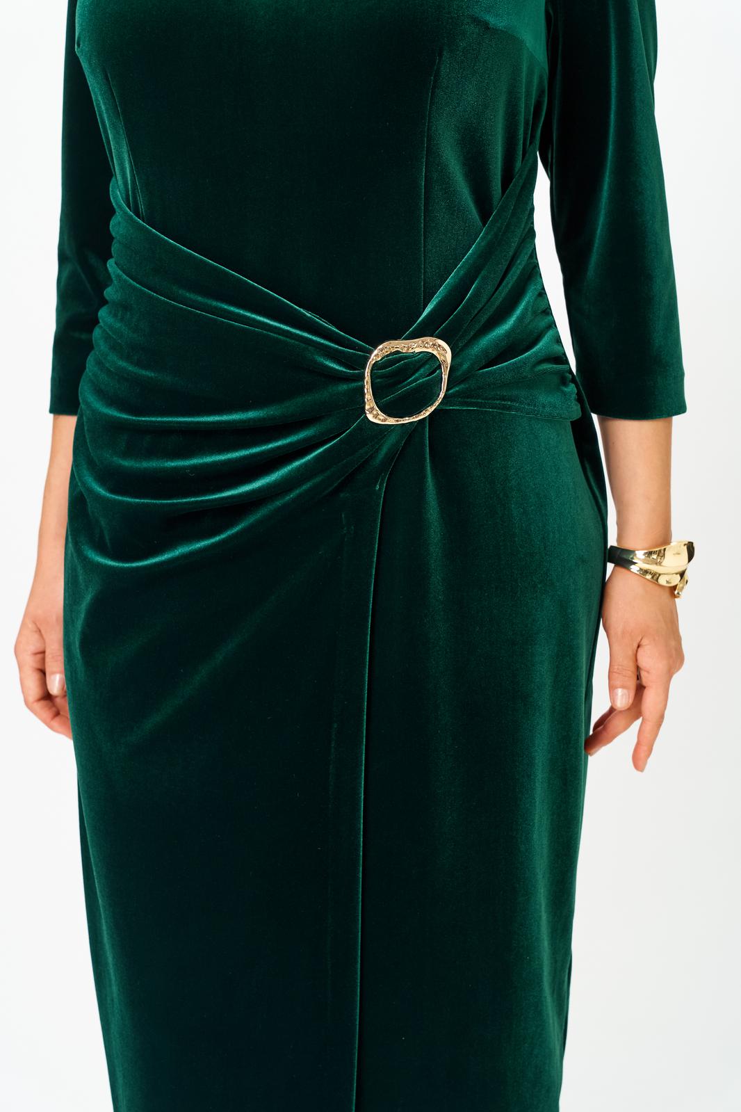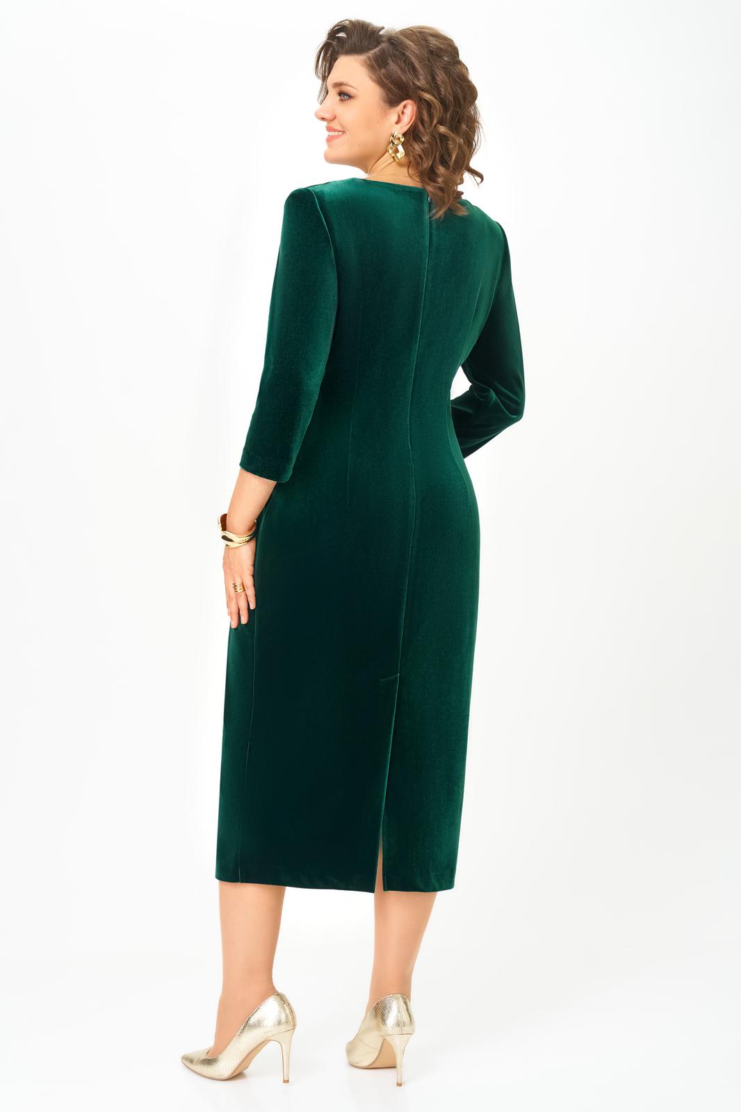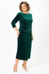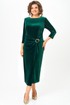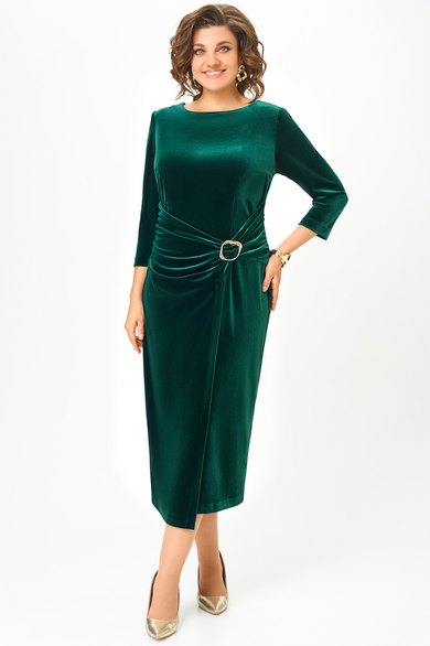 Платье женское прилегающего силуэта, длиной до середины икры, зауженное к низу. По переду: таллиевые и нагрудные вытачки, отделочная отлетная деталь в области талии и бедер, декорированная пряжкой . По спинке: центральный шов с потайной молнией в верху и высокой шлицей внизу, таллиевые выточки вырез горловины в виде «лодочки»