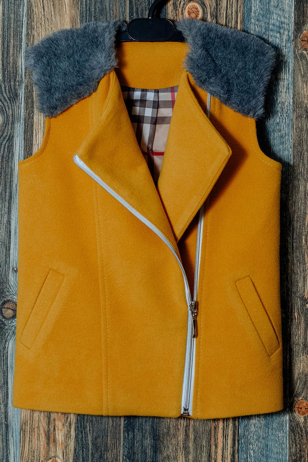 Жилет для маленькой модницы. Выполнено из пальтовой ткани, на подкладке, без утеплителя. Без воротника, с ассиметричной застежкой на молнию. Прорезные действующие карманы. По переду и спинке меховая отделка. Совсем как взрослые, стильно и тепло. Длина по спинке: рост 74, длина 36; рост 80, длина 38 см, рост 86 длина 40 см; рост 92 см, длина 43 см; рост 98 см, длина 45 см; рост 104 см, длина 47 см.