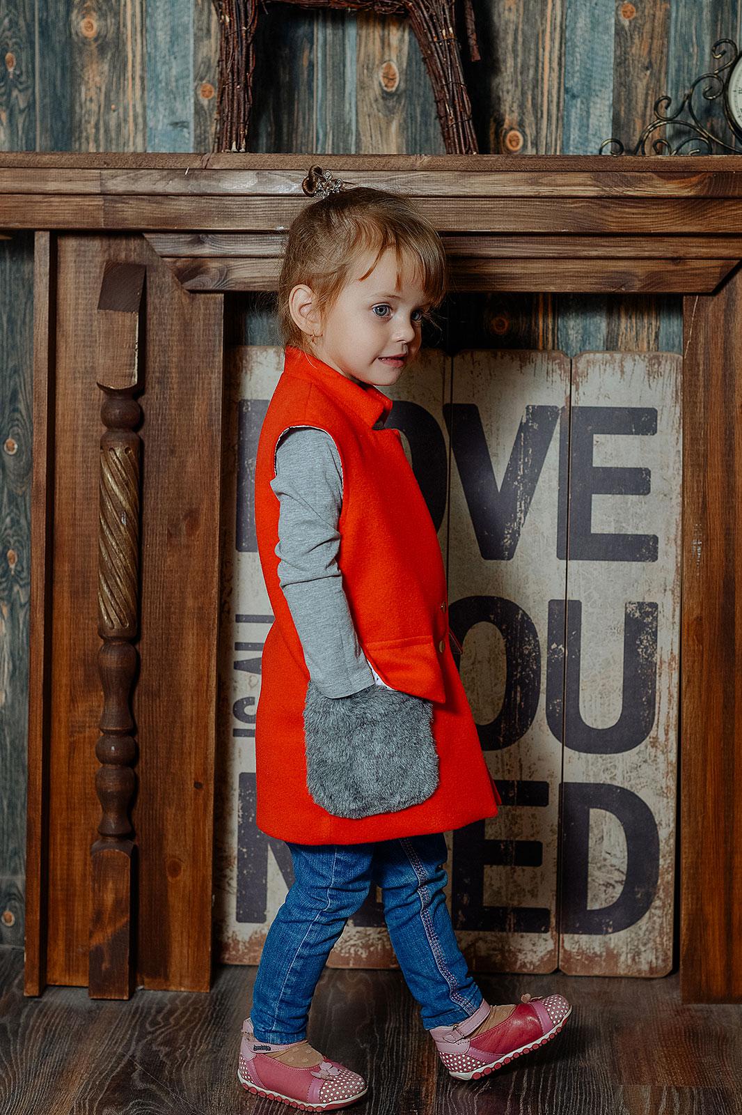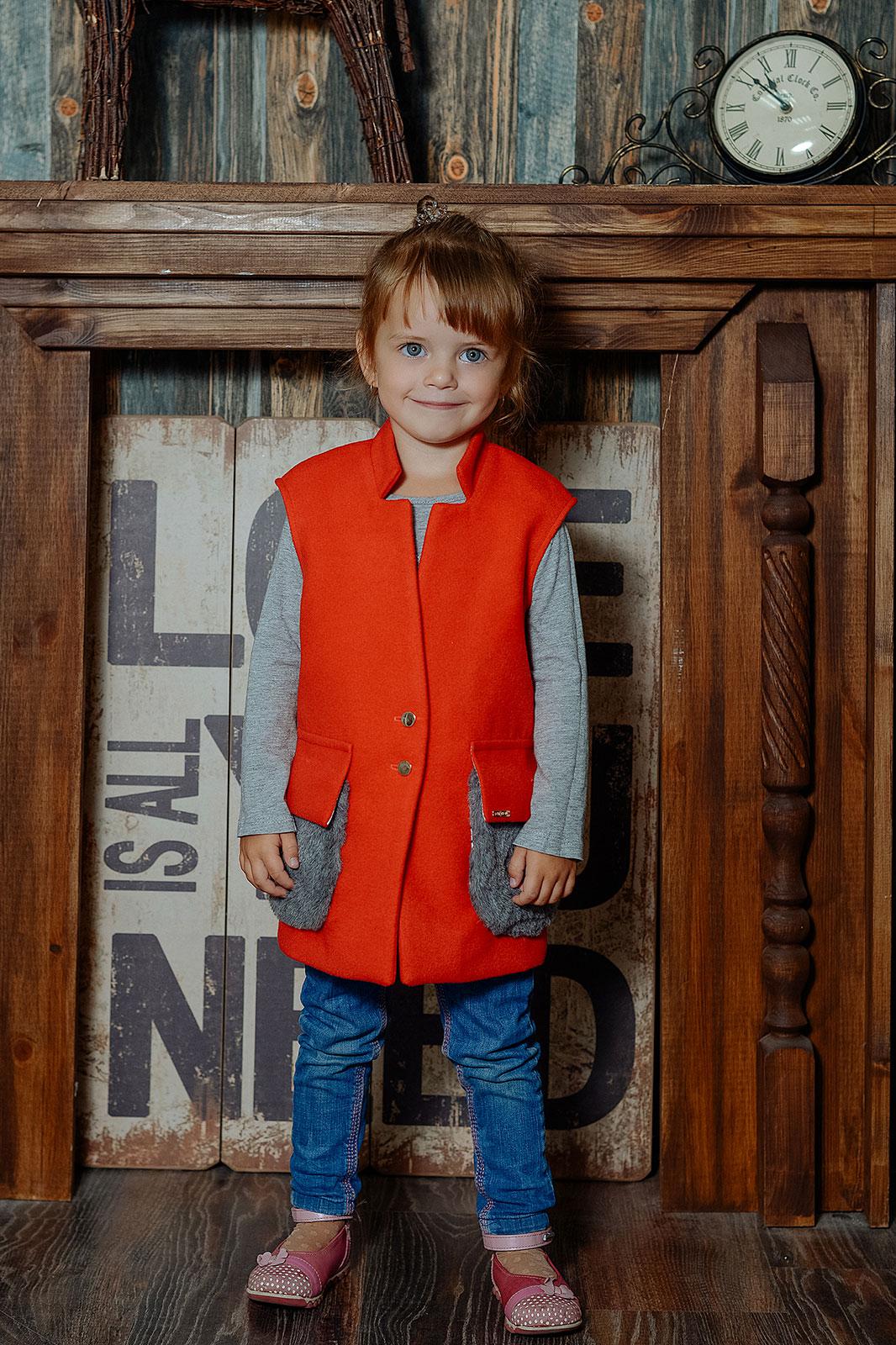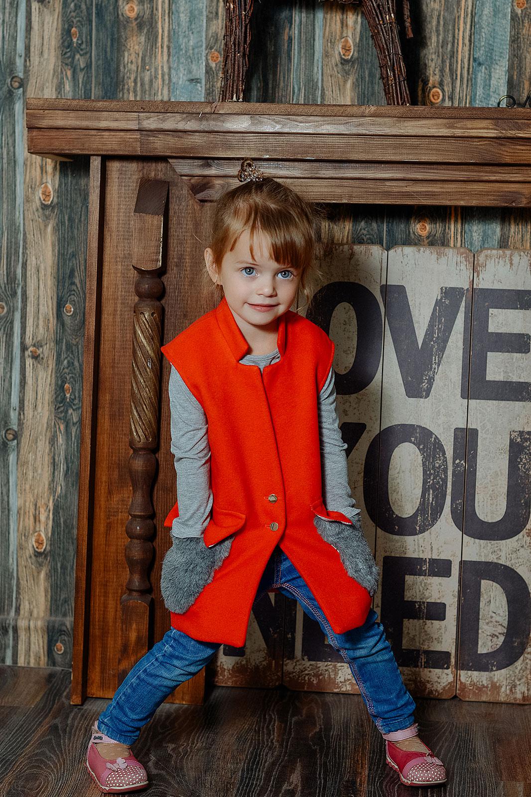 Жилет для маленькой модницы. Выполнено из пальтовой ткани, на подкладке, без утеплителя. Застежка на петли и пуговицы. С большими меховыми накладными карманами. Воротник стойка. Совсем как взрослые, стильно и тепло. Длина по спинке: рост 74, длина 38; рост 80, длина 40 см, рост 86 длина 42 см; рост 92 см, длина 47 см; рост 98 см, длина 49 см; рост 104 см, длина 51 см.