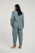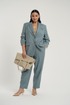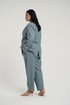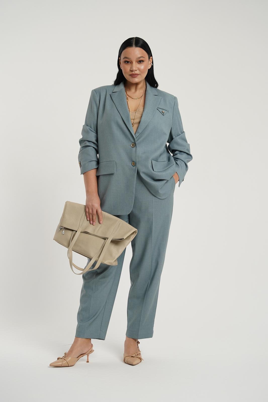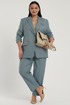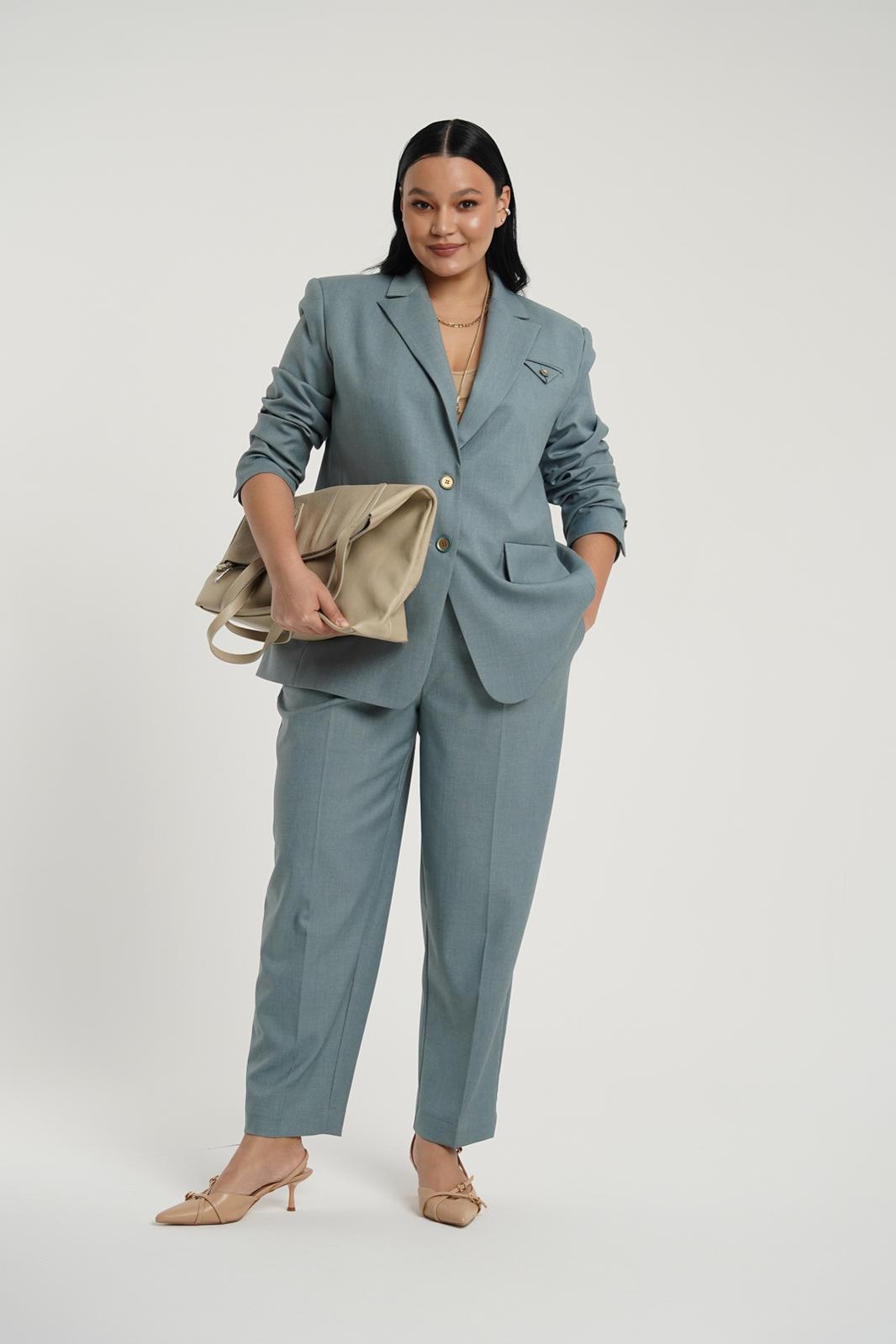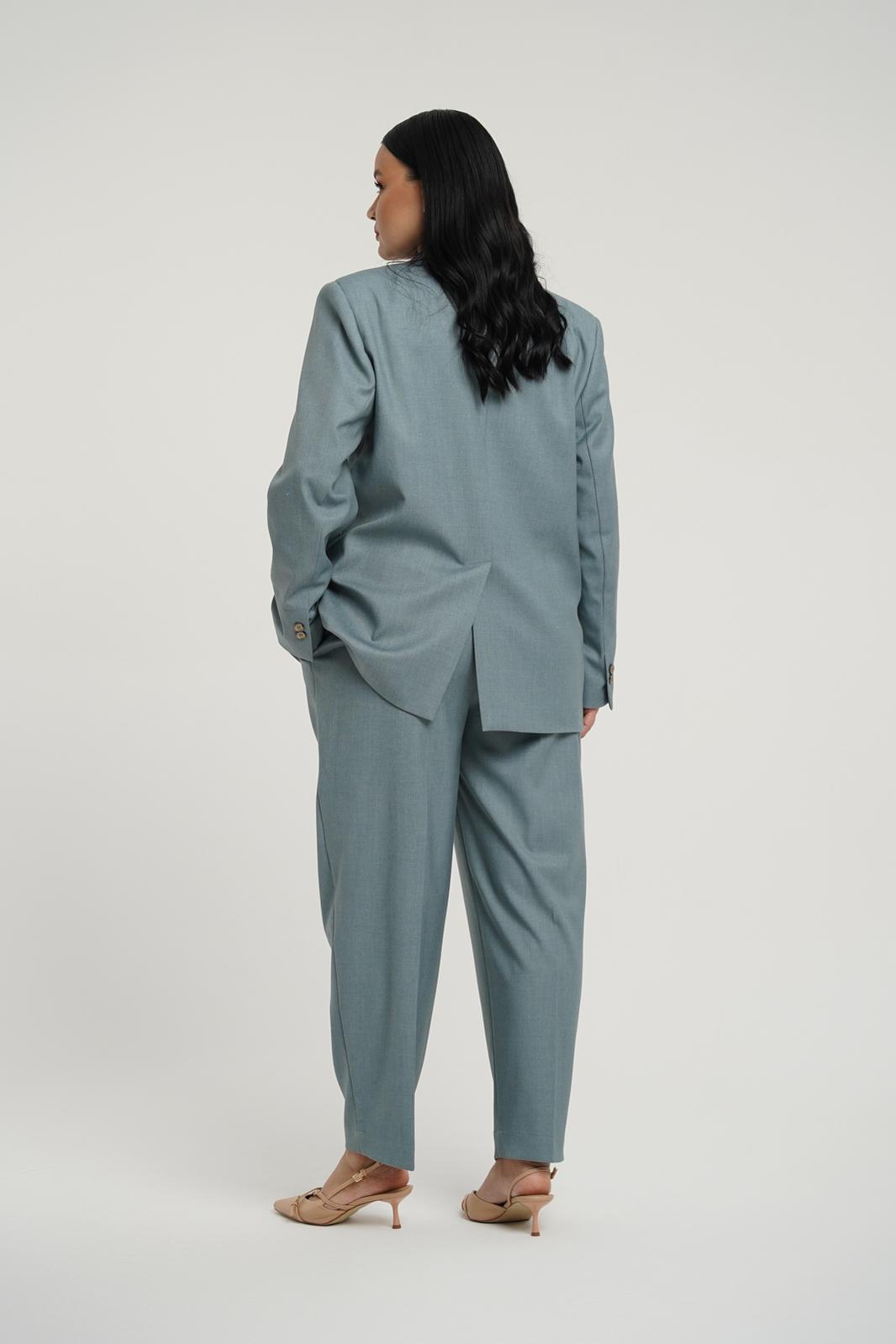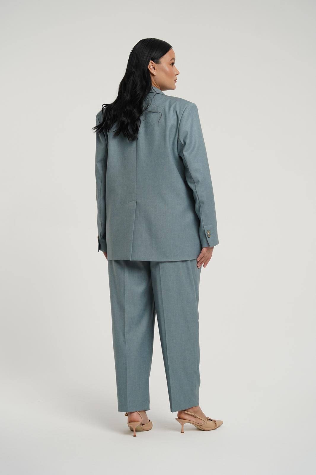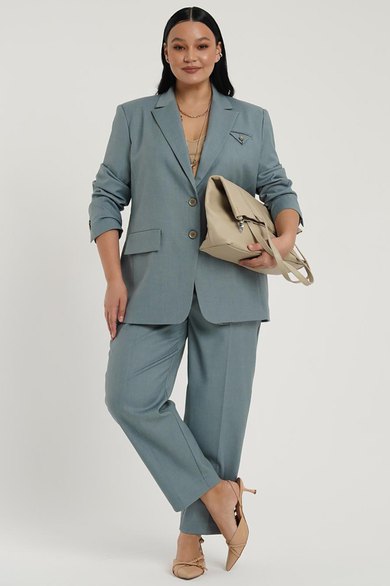 Комплект женский двухпредметный. Жакет на подкладке прямого силуэта. Воротник пиджачного типа, застежка на петли и пуговицы. По переду прорезные карманы с клапаном, имитация кармана с листочкой и декоративным элементом. На спинке шлица. Рукав втачной с шлицей и пуговицами. Брюки классические с стрелками слегка зауженные к низу. В боковых швах карманы с отрезным бочком. Застежка на молнию и петлю с пуговицей. Пояс отрезной с вставками эластичной тесьмы.