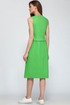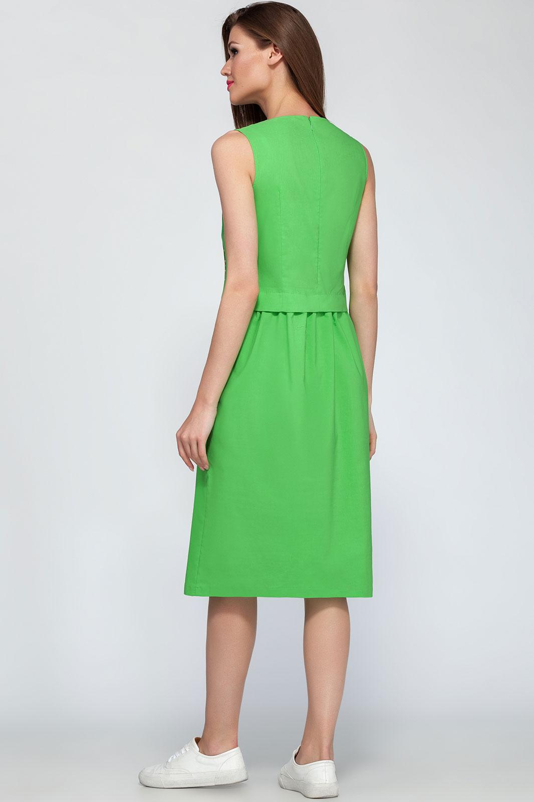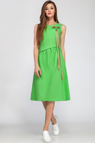 Платье полупрелигающего силуэта, без рукава с округлой горловиной и длиной миди. В комплекте идет брошь.