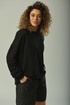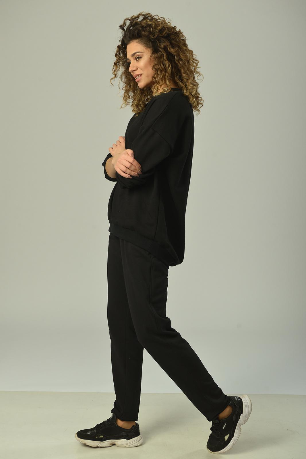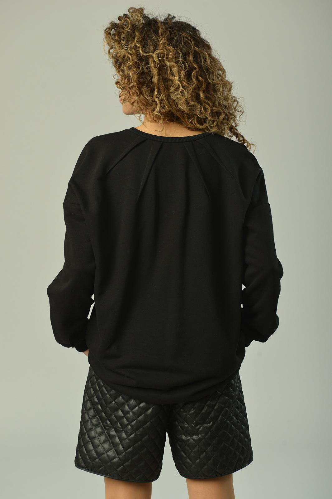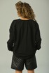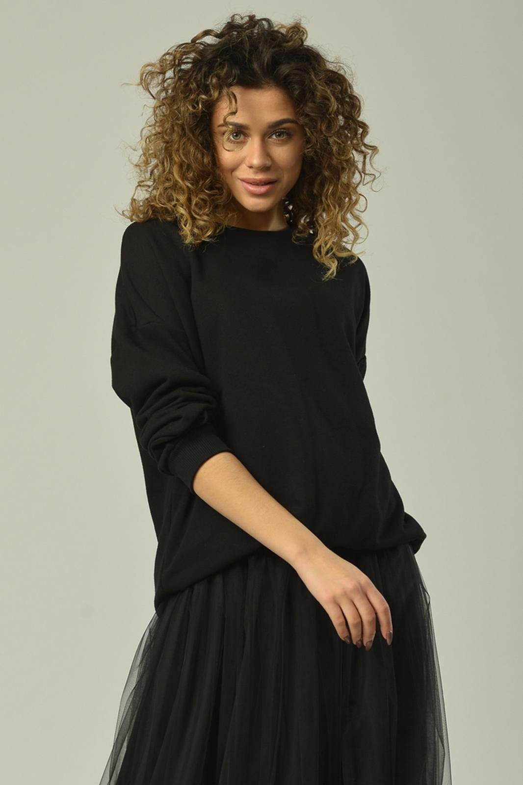 джемпер женский, со спущенным плечом, свободного кроя. Рукав втачной одношовный с притачным манжетом по низу. По спинке, по горловине заложены односторонние складки. Горловина обработана ртделочной планкой(довяз). Низ изделия обработан отделочным поясом(довяз). В качестве отделки используется вышивка. Длина по спинке 74 см, длина рукава 48 см.
