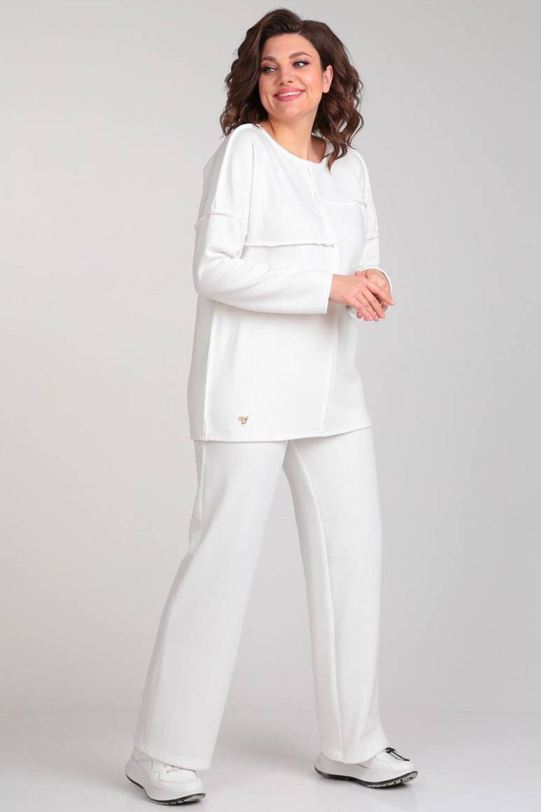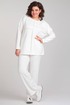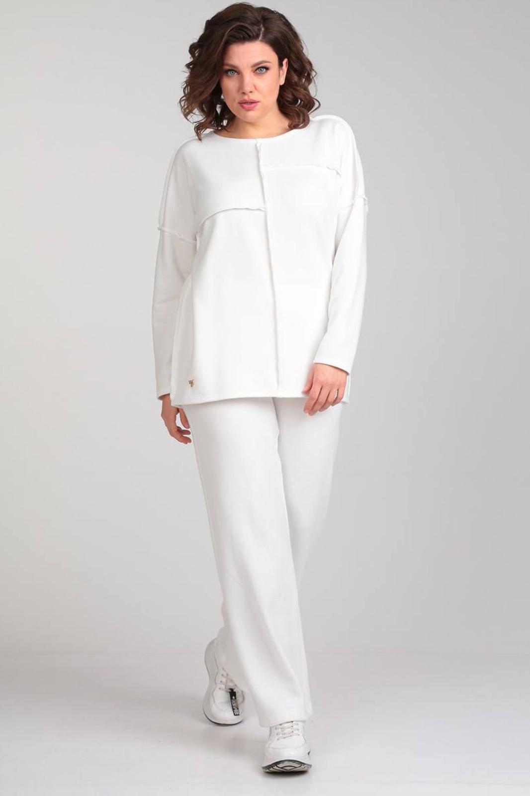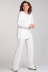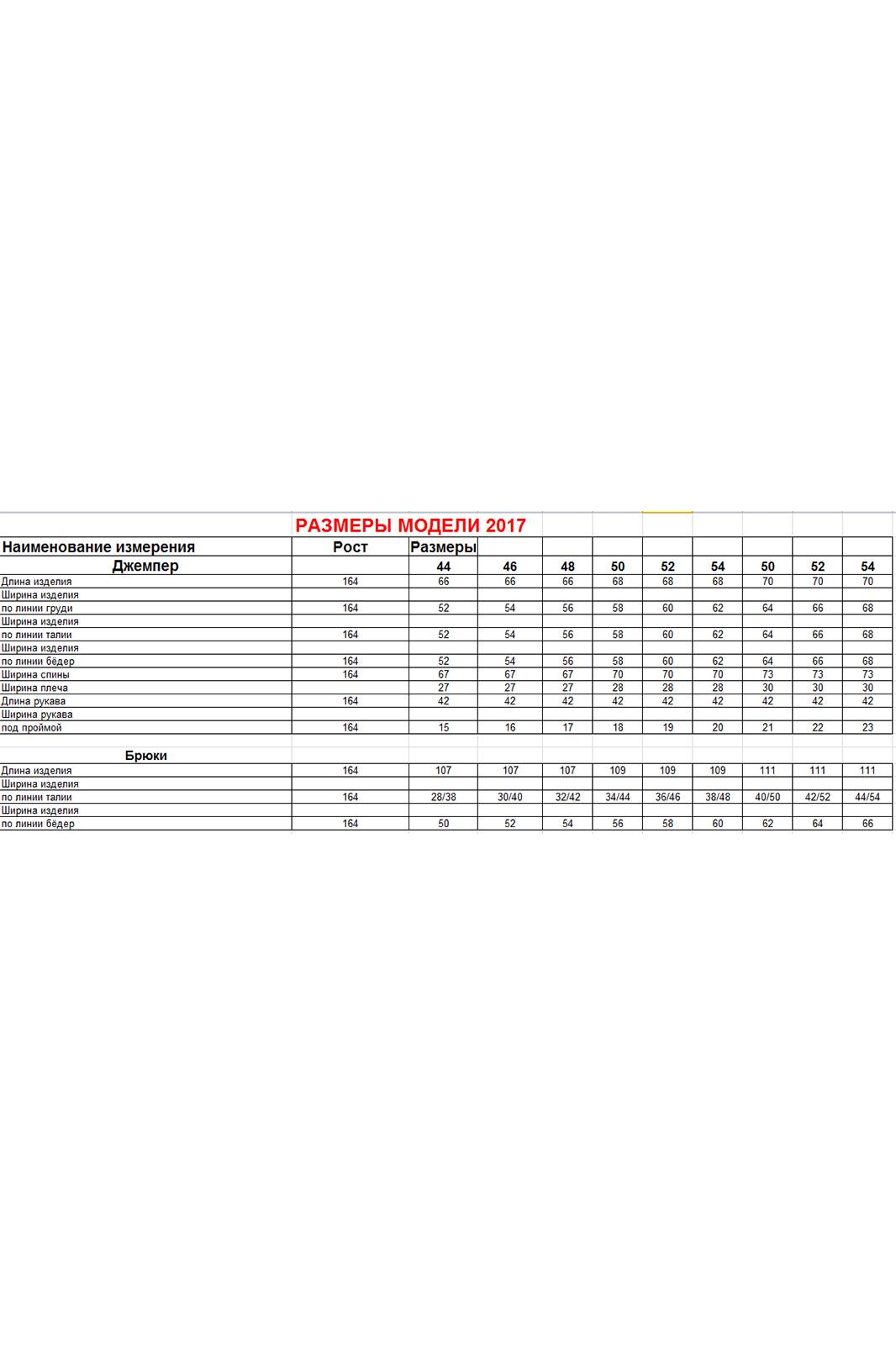 Комплект брючный : джемпер и брюки из трикотажного полотна. Джемпер с разрезными на 4 части передом и спинкой,швы обработаны припусками на лицо. Горловина округллой формы обработана распошивочным швом. Низ рукава и изделия тоже обработаны распошивочным швом. Брюки прямые. Цельнокроенный пояс на резинке.
