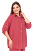 Комплект брючный состоит из рубашки и брюк. Рубашка свободного кроя со спущенным плечом, с центральной застежкой на петли и пуговицы. По переду кокетка, отрезная планка. По спинке кокетка, встрочная складка на нижнейцентральной части спинки. Рукав втачной, одношовный, по низу отделан хлястиком для регулировки длины. Воротник стояче-отложной с отрезной стойкой. Брюки широкие, прямые. Верхний рсез обработан поясом с резинкой, в боковых швах обработаны карманы. В качестве отделки используеься отделочная бирочка и фурнитура.