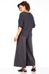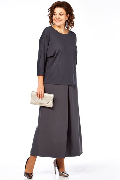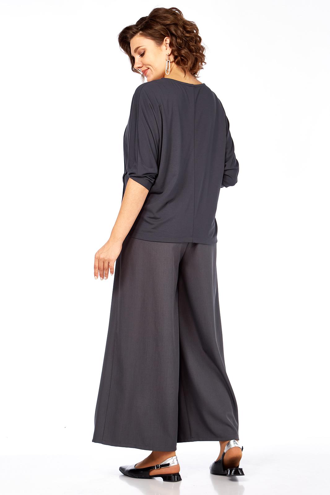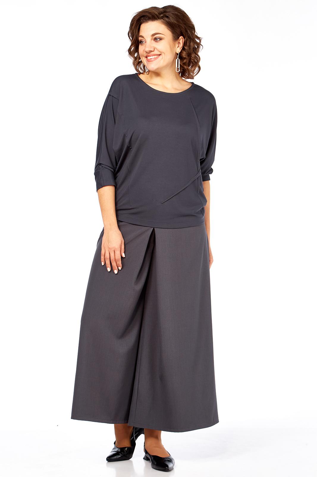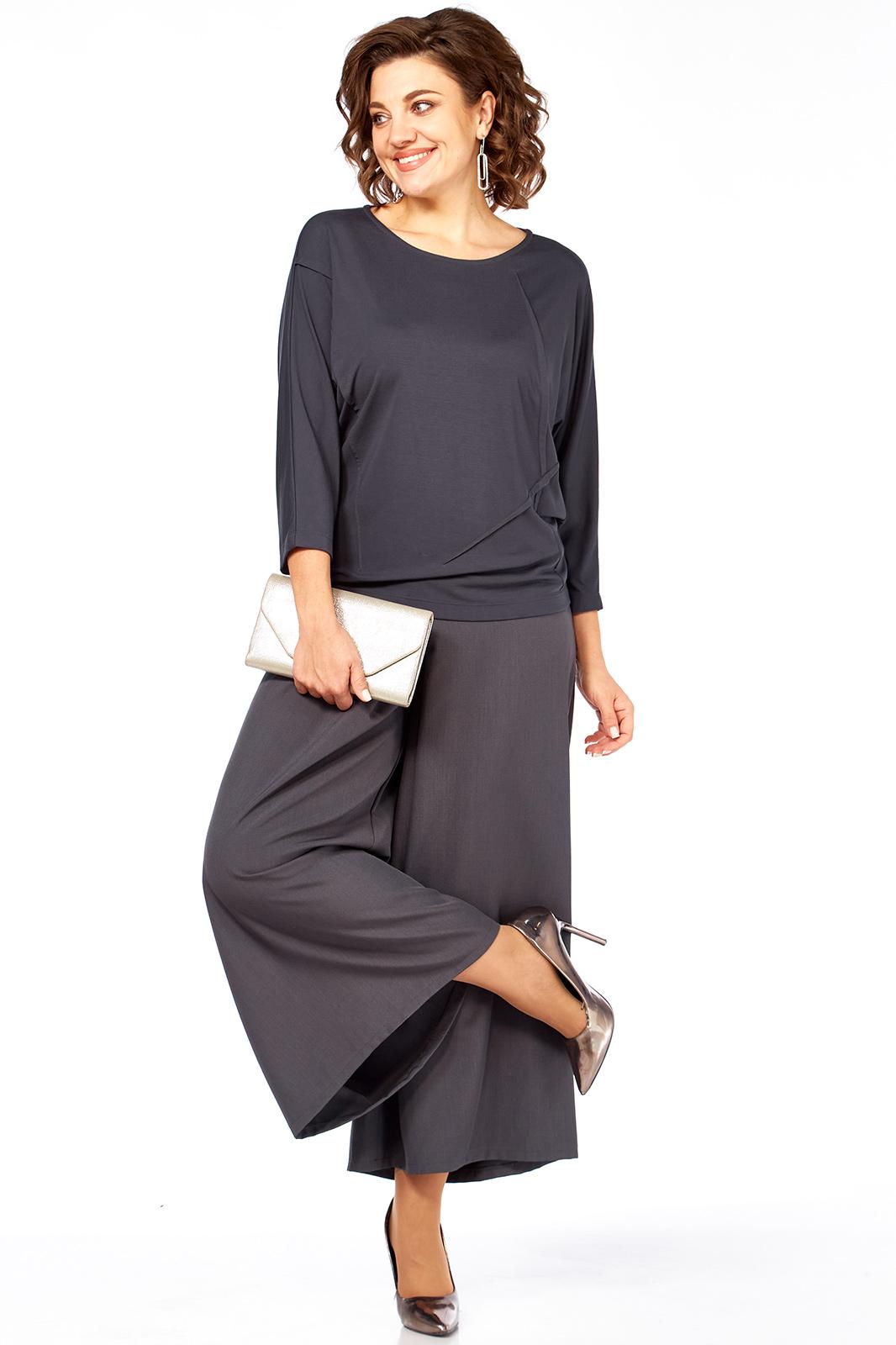 Комплект брючный состоит из кофты и кюлотов. Кофта выполнена из трикотажного полотна. Спинка со средним швом. Перед с ассиметричными застроченными наверх вытачками. Рукав цельнокройный, длиной 7/8. Горловина округлой формы. Брюки-кюлоты со встречной складкой спереди. По бокам имитация карманов. В левом боковом шве потайная молния. Пояс притачной.