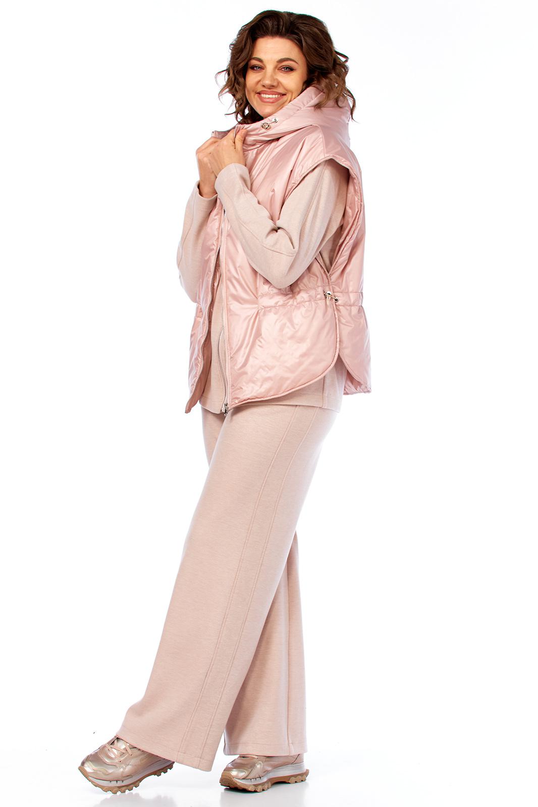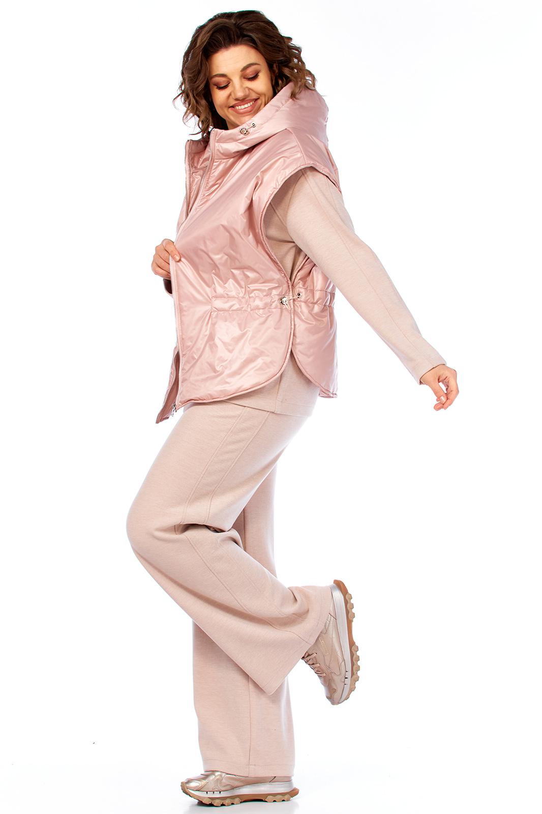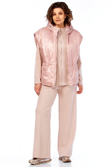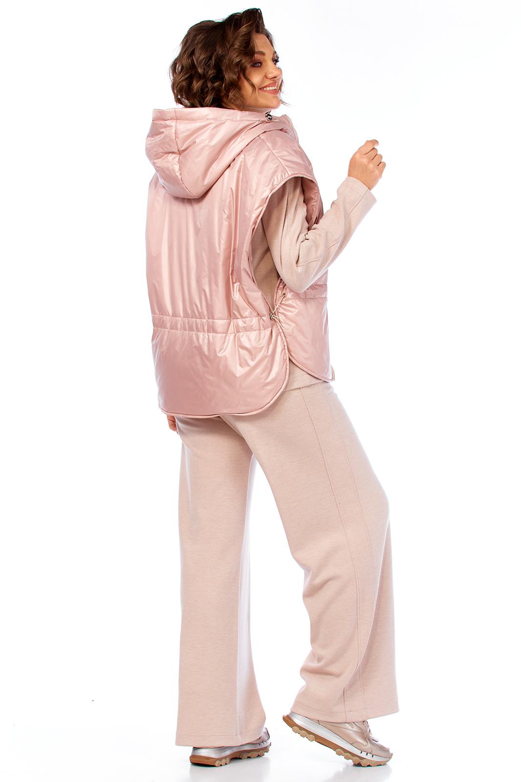 Комплект женский состоит из жилетки, брюк и кофты. Брюки прямые, широкие с лампасами и боковыми карманами. Кофта с центральной застежкой на молнию. Кокетками и лампасами по рукавам. Жилетка с центральной застежкой на молнию. По бокам перед и спинка соединены поясом со шнуром, который проходит в кулисе на спинке и частично на полочке. Низ округлой формы. Воротник капюшон с кулисой и шнуром. Фурнитура может отличаться от заявленной на фото. Жилет из плащевой ткани. Длина кофты по спинке 66 см, ширина плеча+длина рукава 73 см. Длина брюк 104 см. Длина жилетки по спинке 66 см.