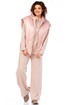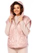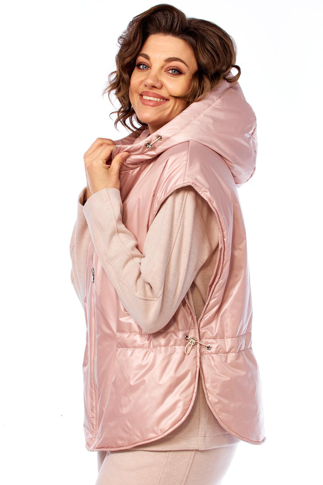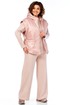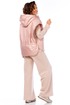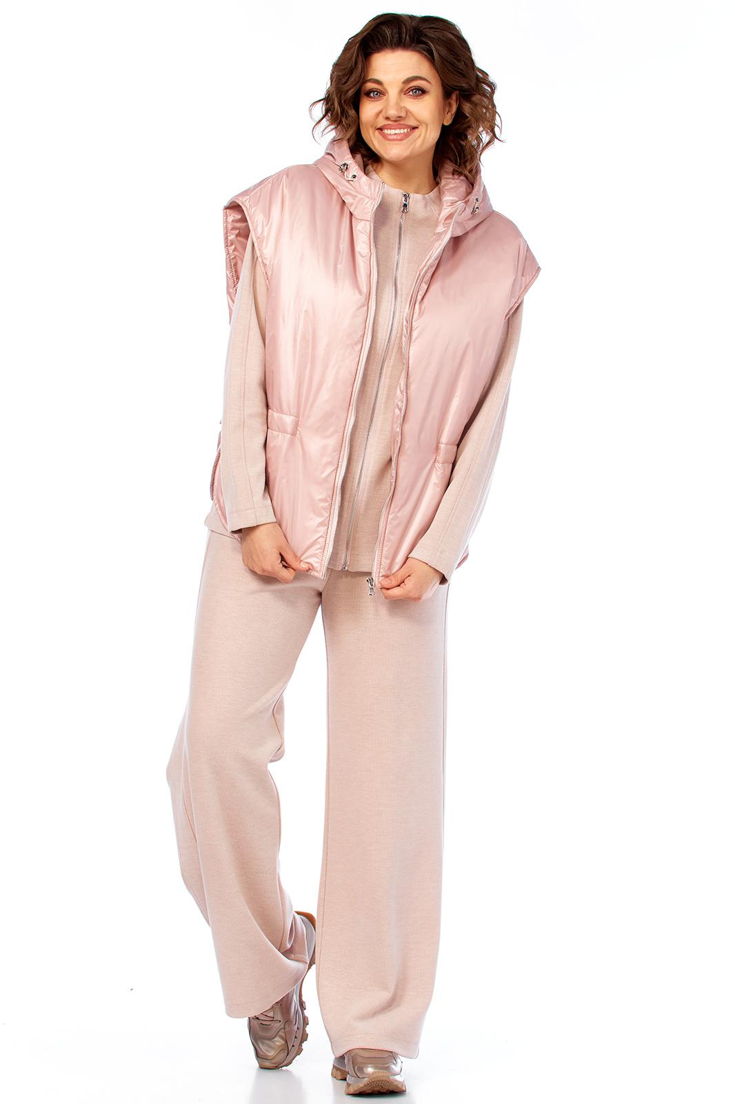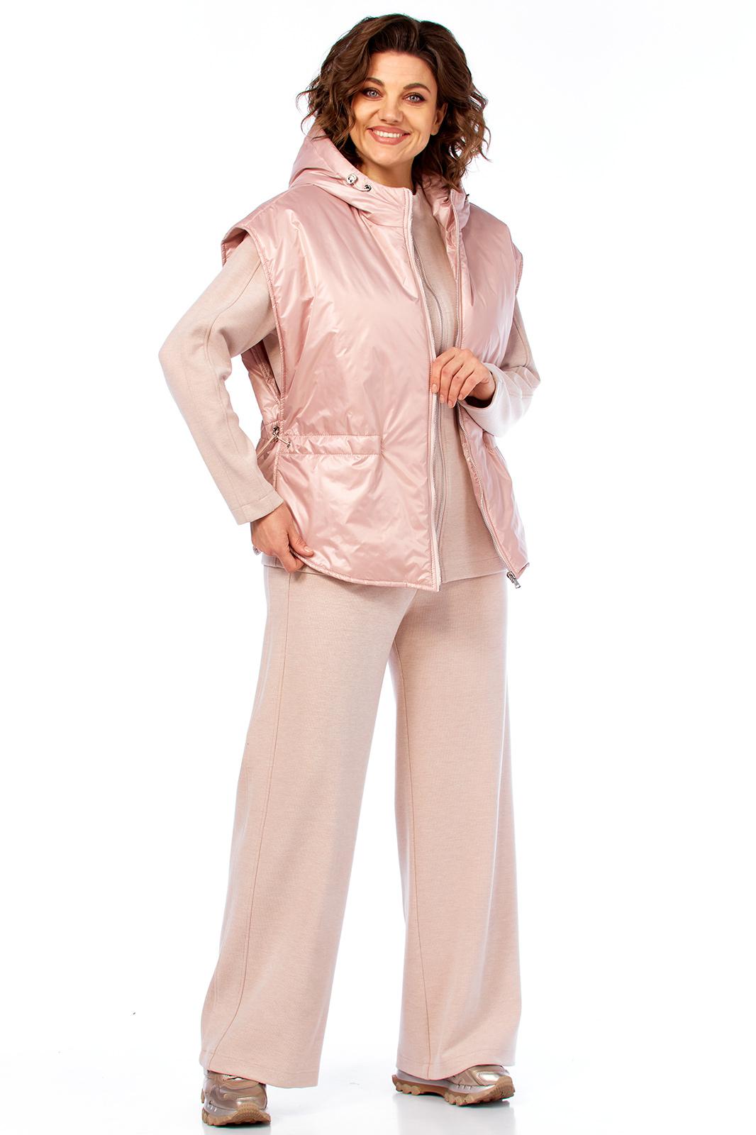 Комплект женский состоит из жилетки, брюк и кофты. Брюки прямые, широкие с лампасами и боковыми карманами. Кофта с центральной застежкой на молнию. Кокетками и лампасами по рукавам. Жилетка с центральной застежкой на молнию. По бокам перед и спинка соединены поясом со шнуром, который проходит в кулисе на спинке и частично на полочке. Низ округлой формы. Воротник капюшон с кулисой и шнуром. Фурнитура может отличаться от заявленной на фото. Жилет из плащевой ткани. Длина кофты по спинке 66 см, ширина плеча+длина рукава 73 см. Длина брюк 104 см. Длина жилетки по спинке 66 см.