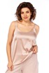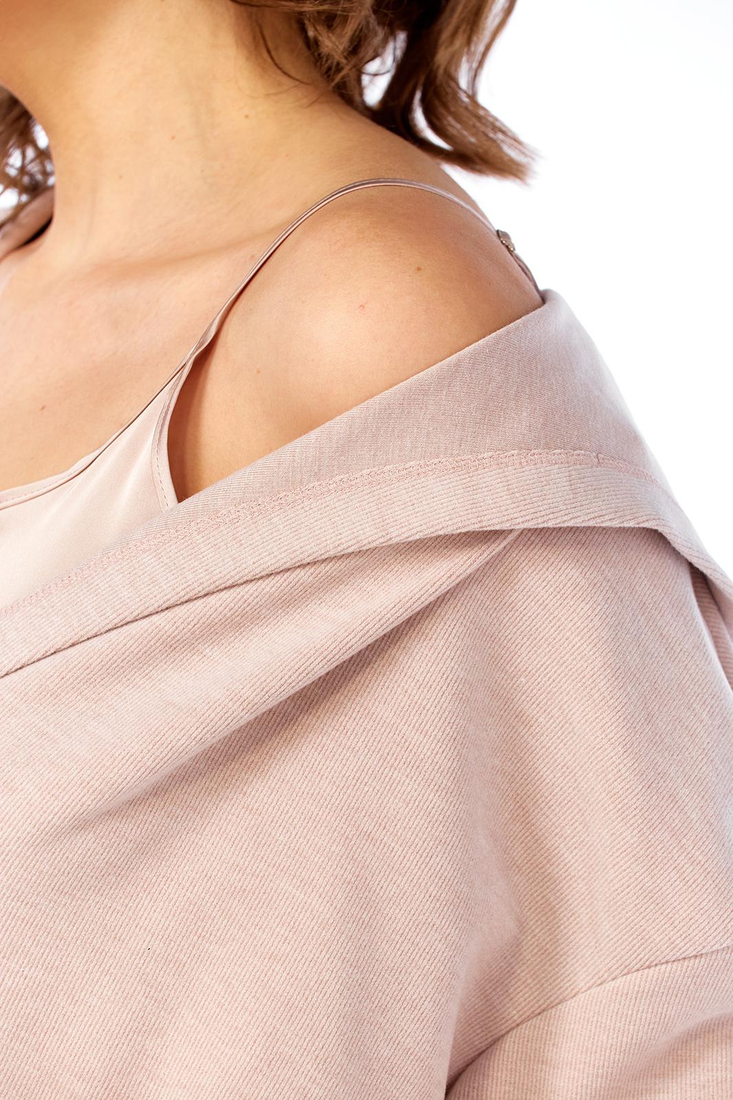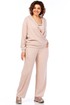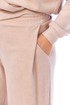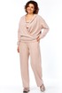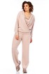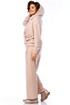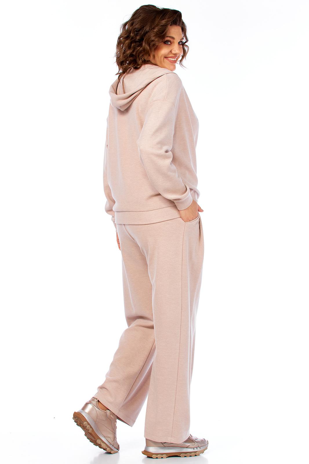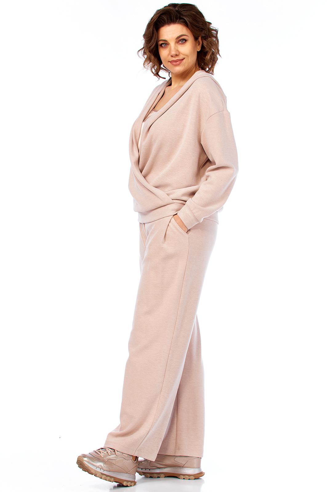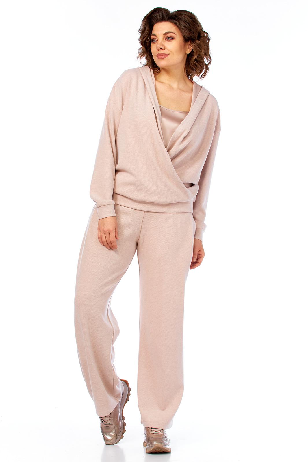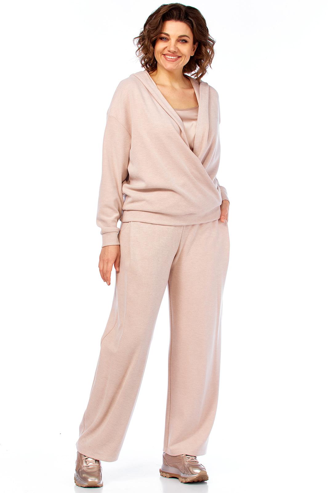 Комплект брючный состоит из кофты, топа и брюк. Кофта свободного кроя со спущенной линией плеча, на запах. Рукав втачной одношовный с манжетом по низу. Капюшон цельнокройный с передом по низу изделия, притачной пояс. Топ полуприлегающего силуэта на бретелях. по переду нагрудные вытачки. Бретели регулируются по длине. Брюки расширенные к низу, карманы в боковом шве, по переду линии притачивания, заложены складки. Верхний срез обработан поясом с резинкой. Длина кофты по спинке 61 см. Длина рукава 55 см. Длина топа по спинке 48 см. Длина брюк 104 см.