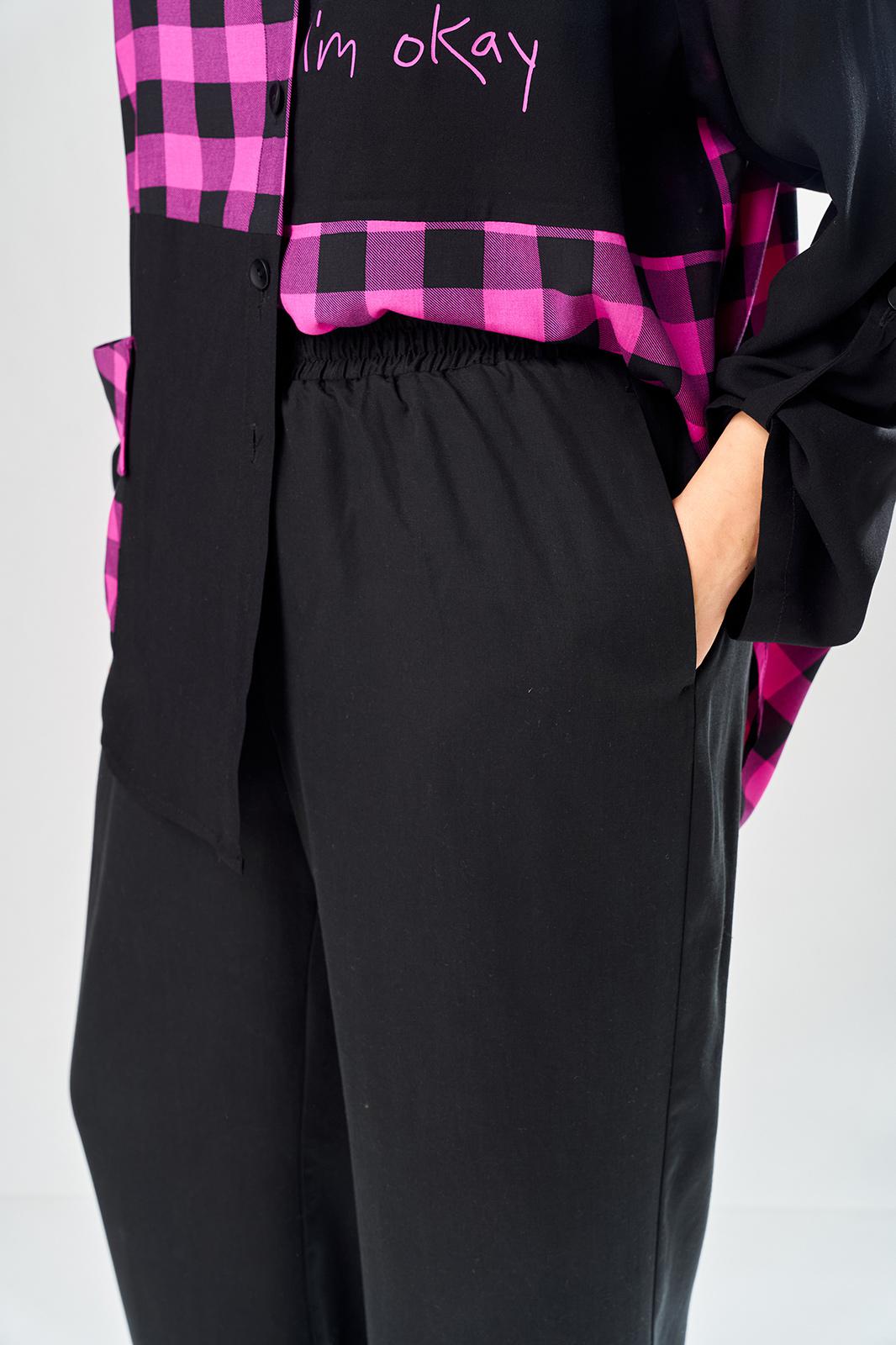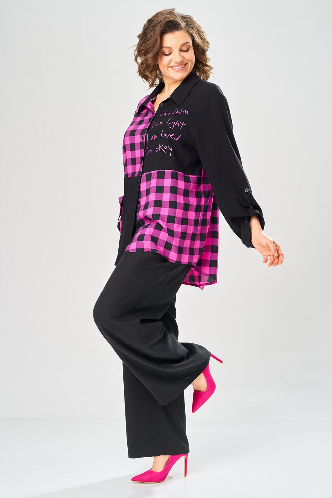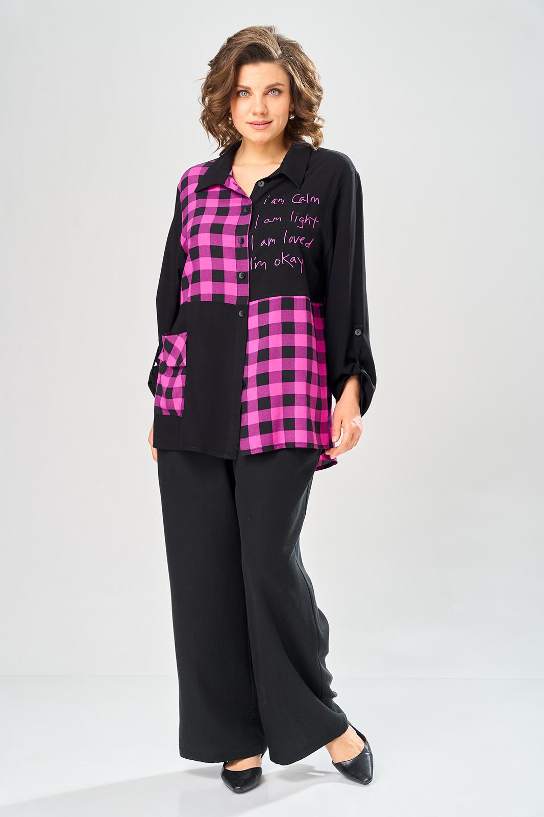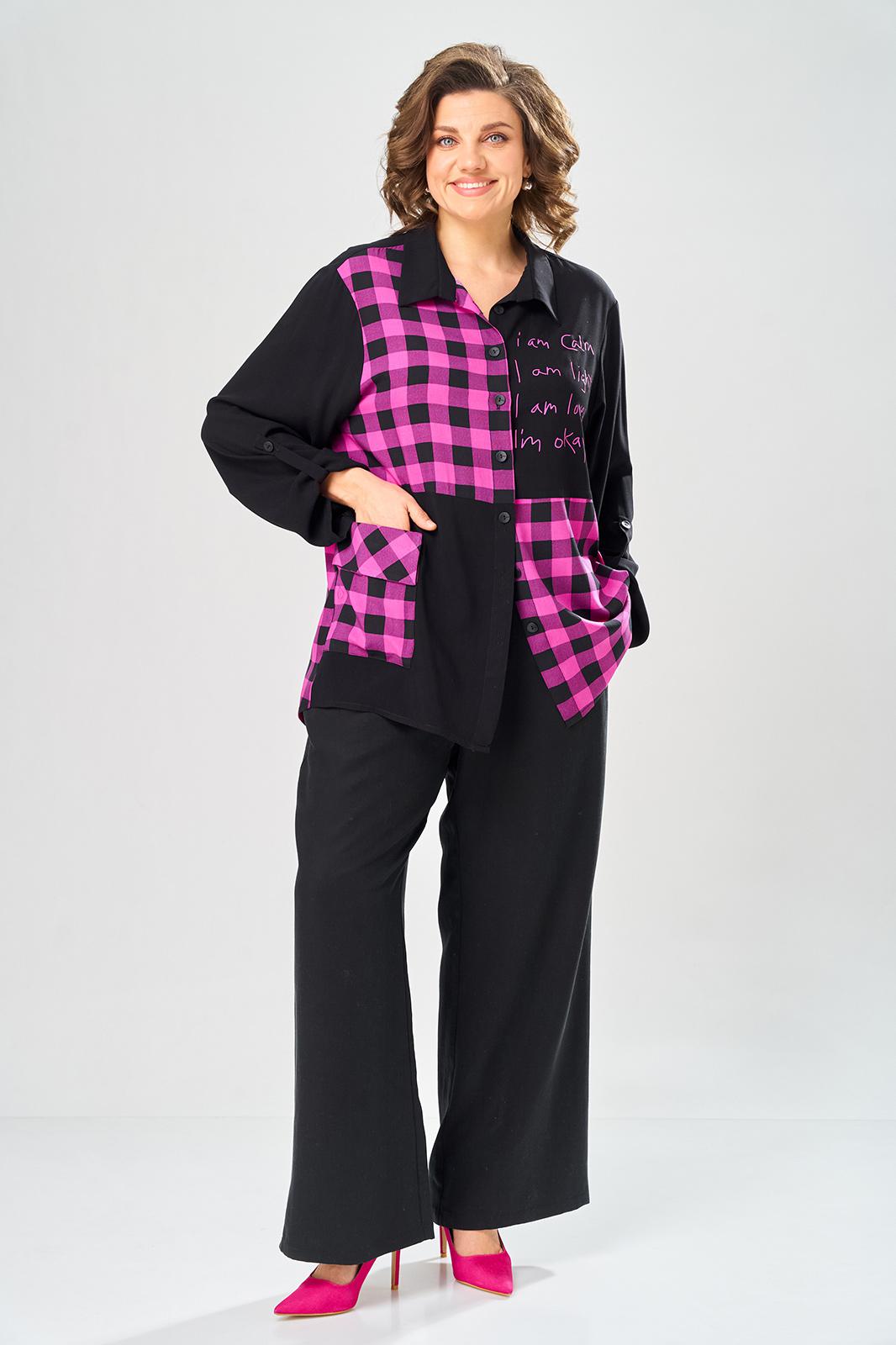Комплект брючный состоит из блузы-рубашки и брюк.. Рубашка выполнена из 2-ух видов х/б ткани: черной и в клетку. Спинка с плечевой кокеткой и имитацией застежки в нижней части из отделочной ткани. Перед с подрезом в области талии и 1 накладным карманом в нижней части правой полочки. Застежка на 7 петель и пуговиц. Рукав втачной, одношовный с хлястиком для регулировки длины. Воротник на стойке. Брюки прямые широкие с карманами в боковых швах и поясом на резинке.