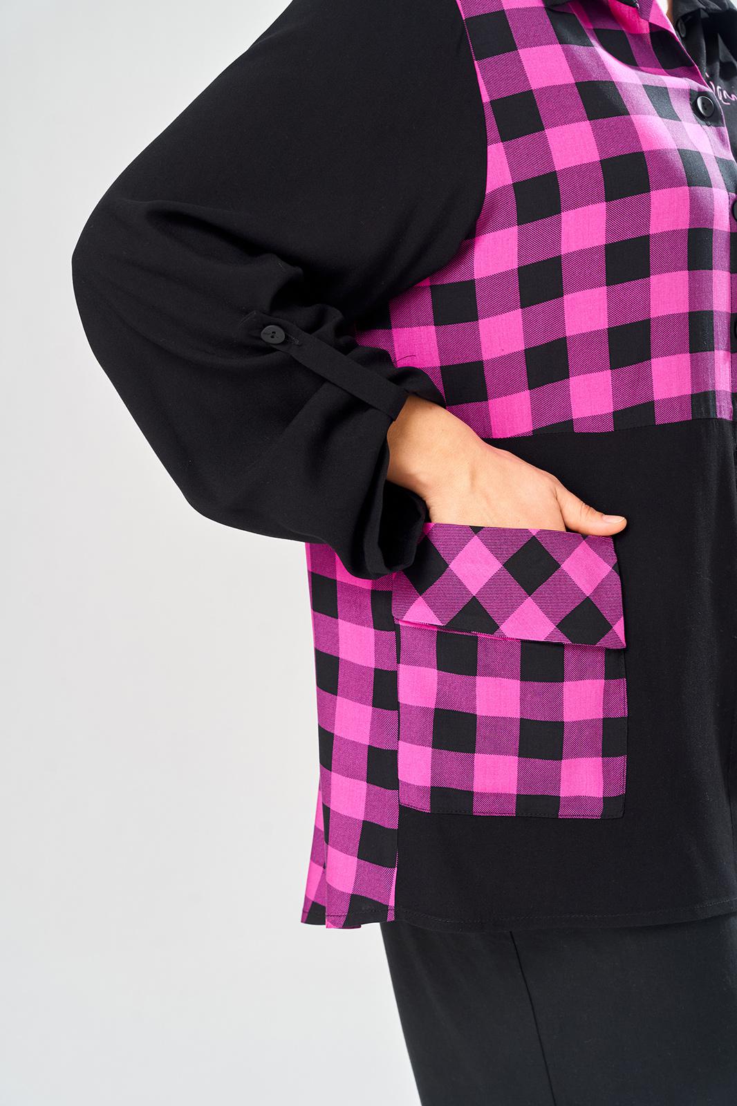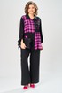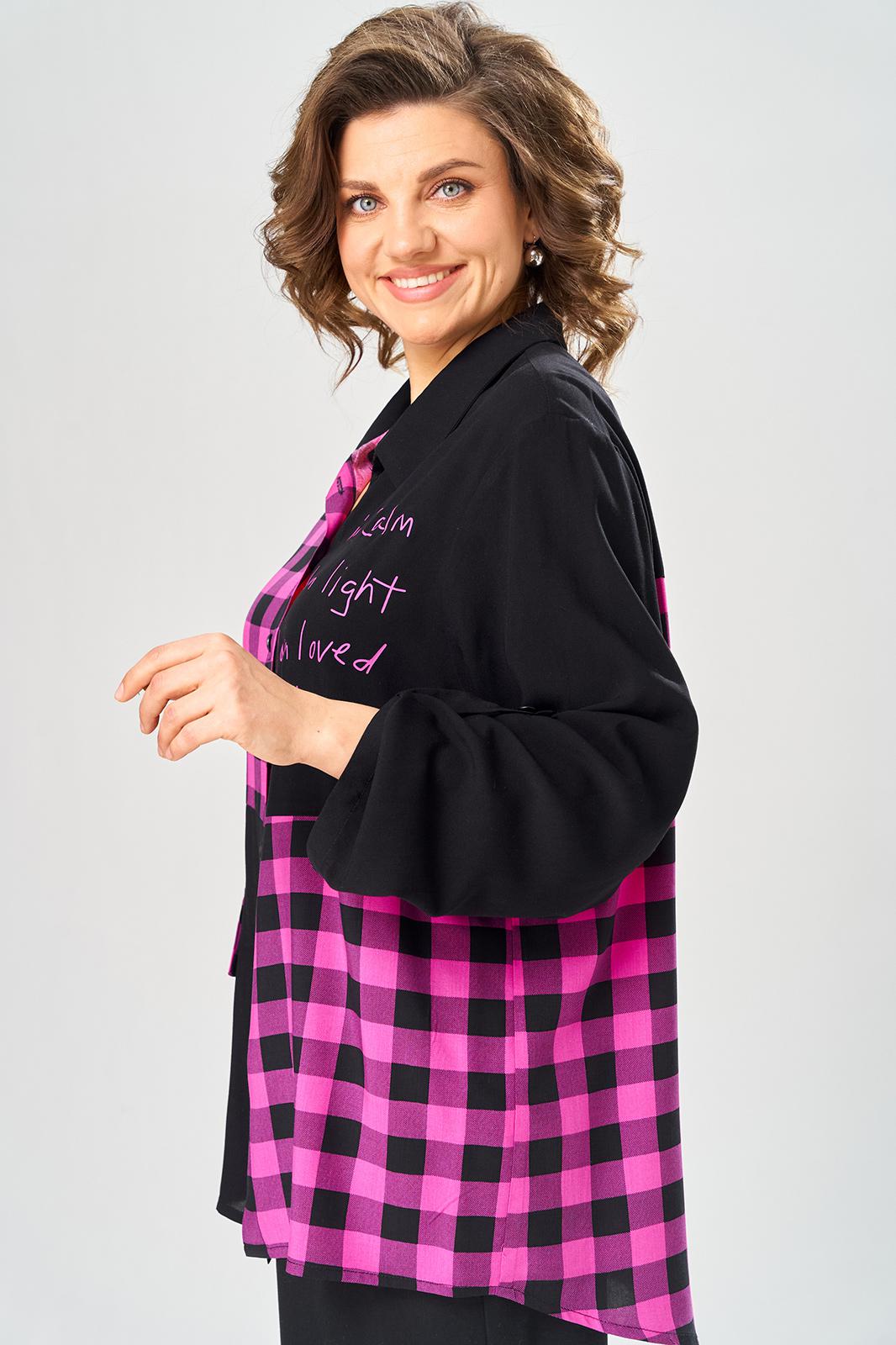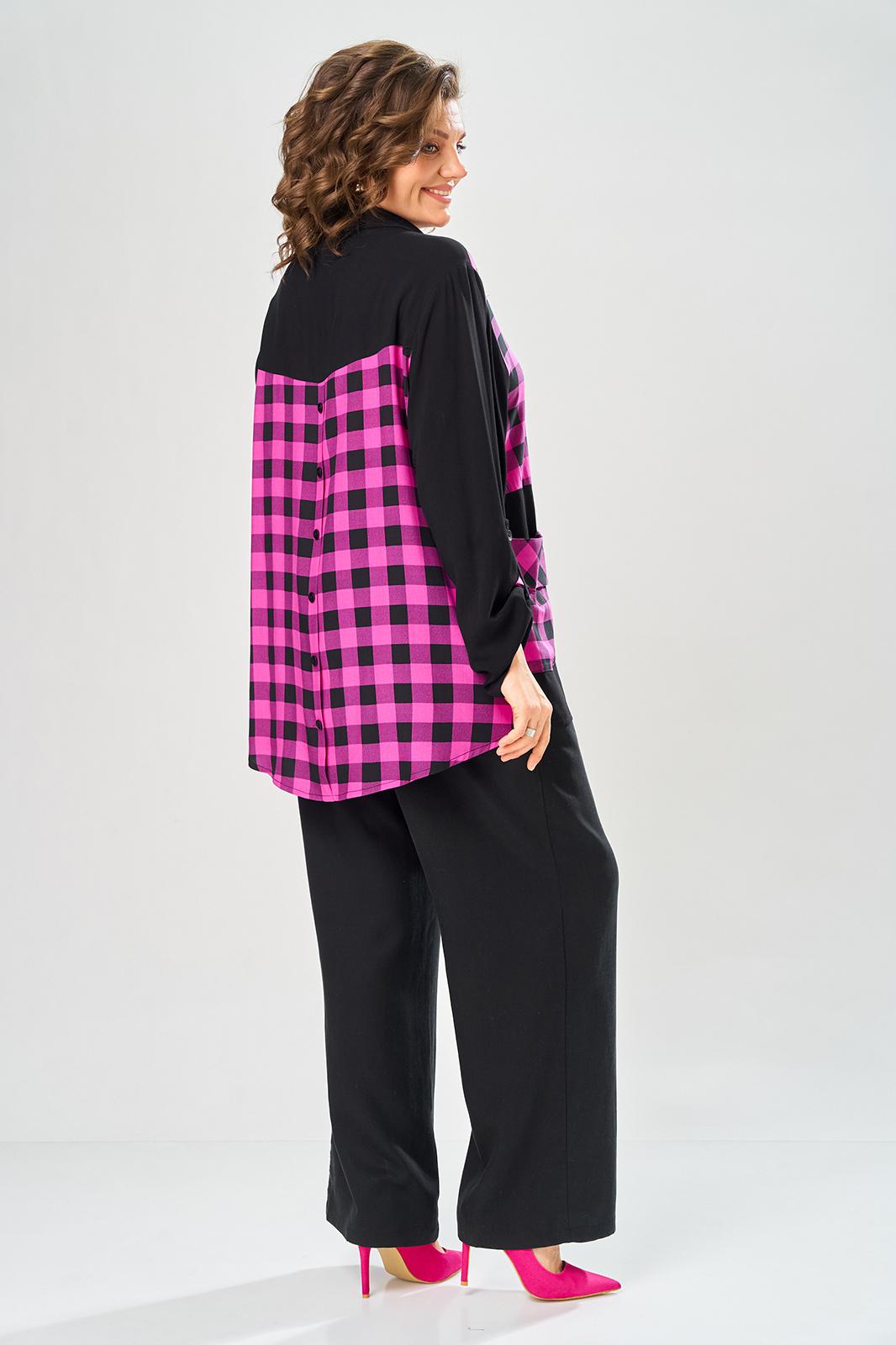Комплект брючный состоит из блузы-рубашки и брюк.. Рубашка выполнена из 2-ух видов х/б ткани: черной и в клетку. Спинка с плечевой кокеткой и имитацией застежки в нижней части из отделочной ткани. Перед с подрезом в области талии и 1 накладным карманом в нижней части правой полочки. Застежка на 7 петель и пуговиц. Рукав втачной, одношовный с хлястиком для регулировки длины. Воротник на стойке. Брюки прямые широкие с карманами в боковых швах и поясом на резинке.