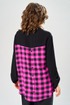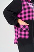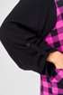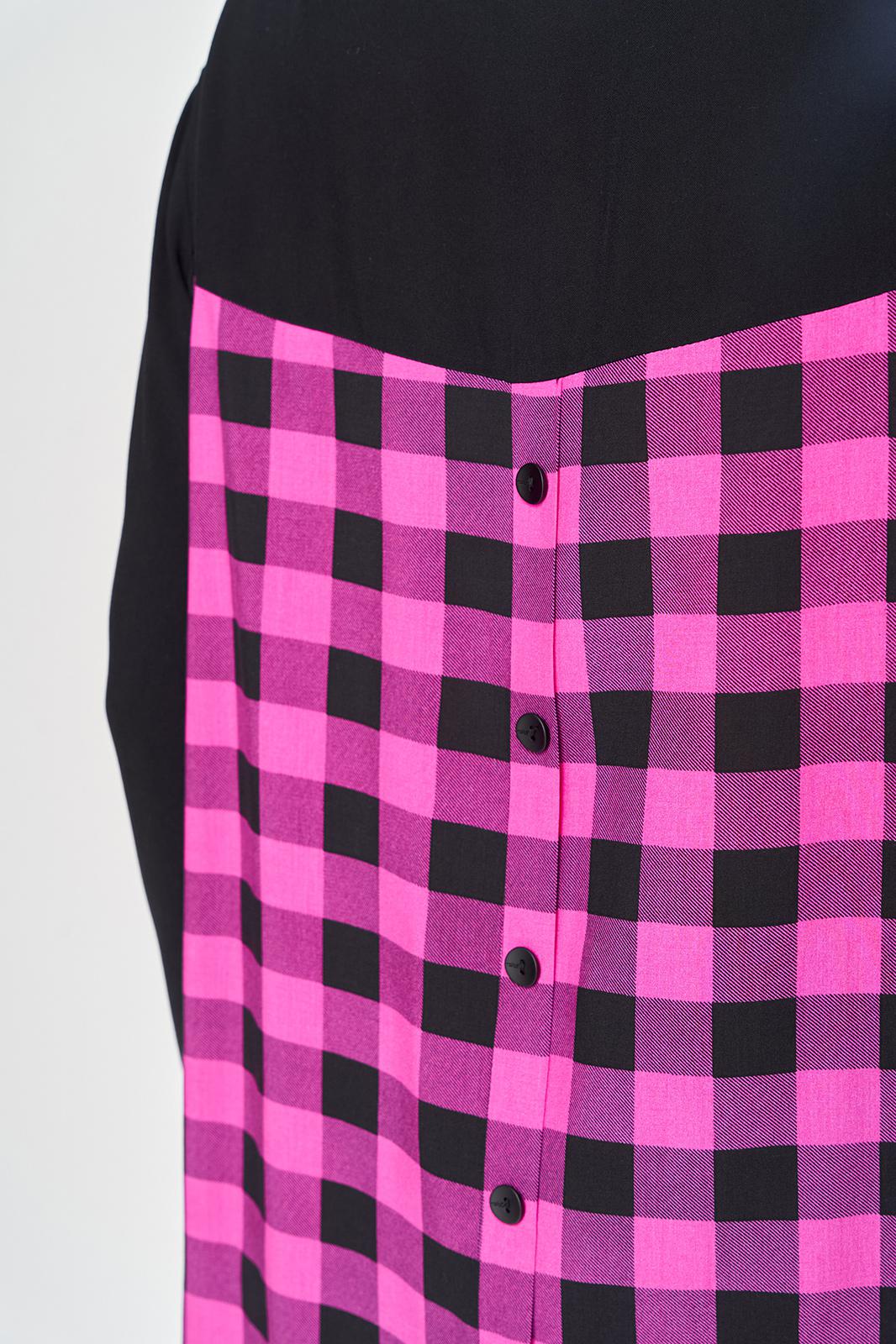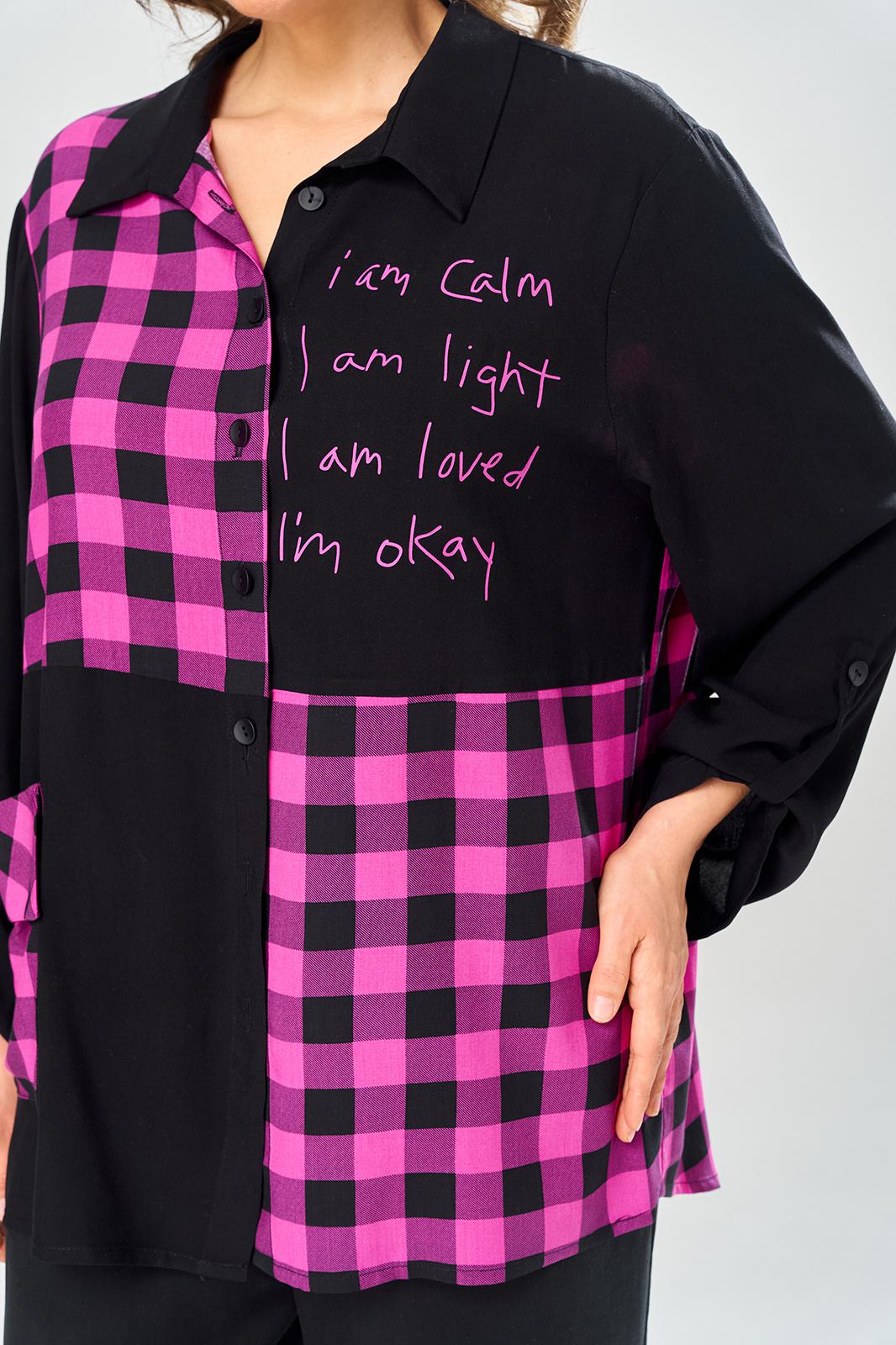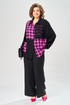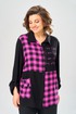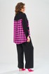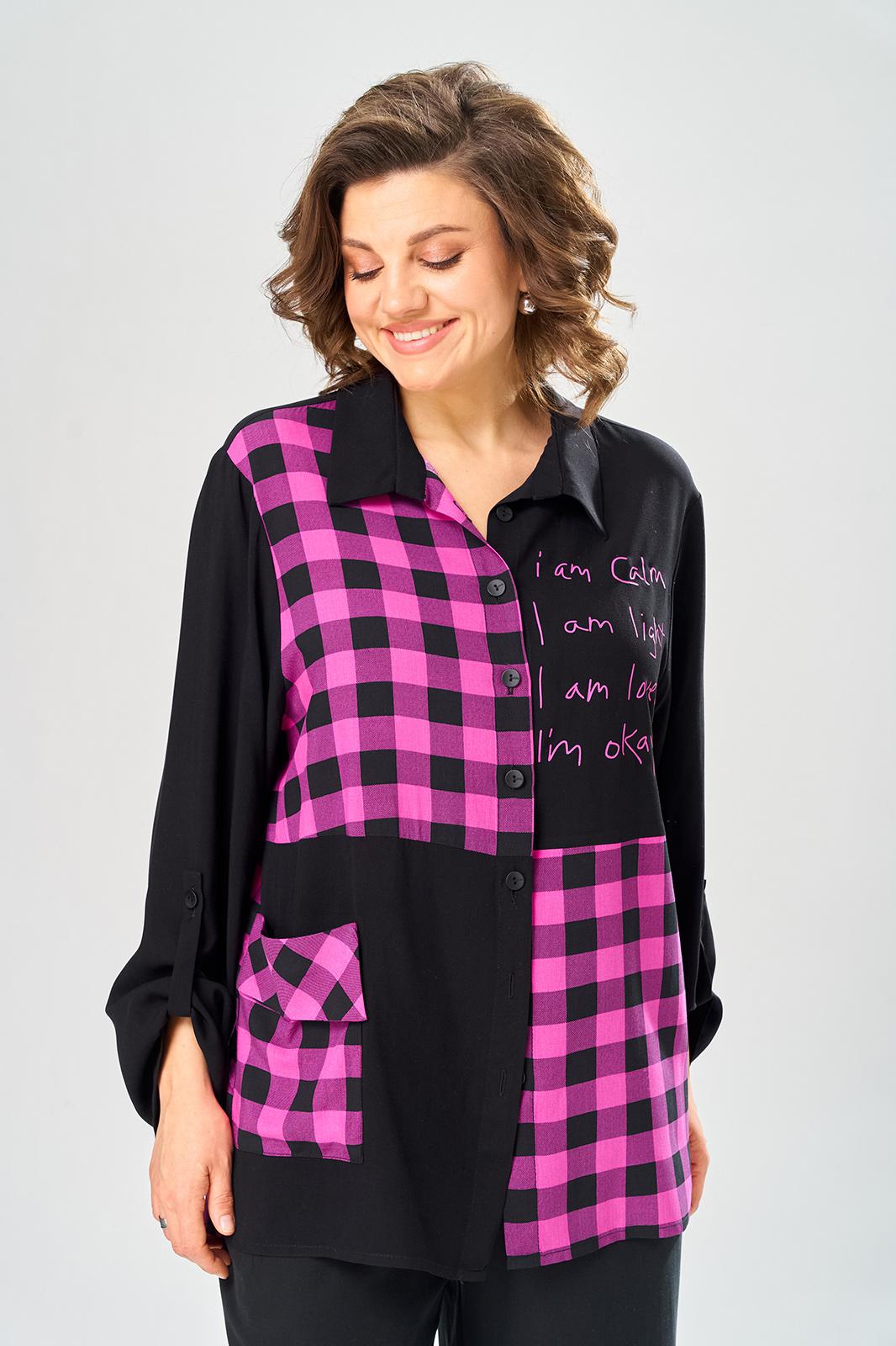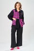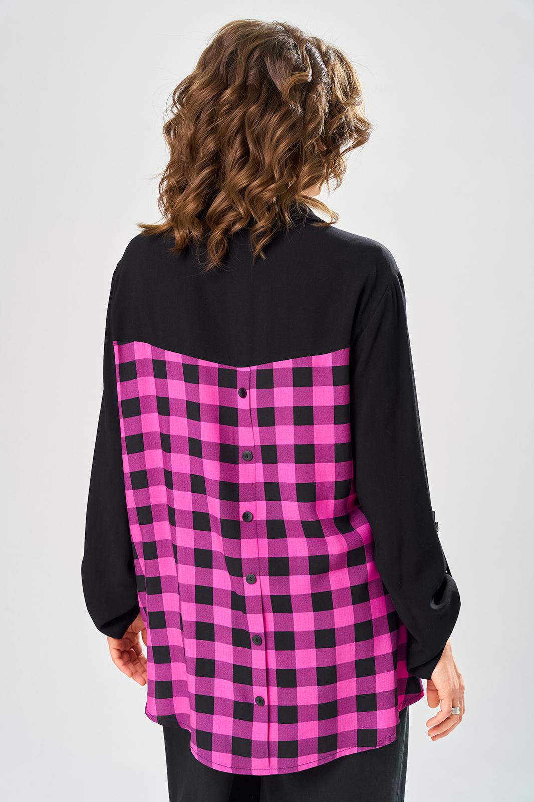 Комплект брючный состоит из блузы-рубашки и брюк.. Рубашка выполнена из 2-ух видов х/б ткани: черной и в клетку. Спинка с плечевой кокеткой и имитацией застежки в нижней части из отделочной ткани. Перед с подрезом в области талии и 1 накладным карманом в нижней части правой полочки. Застежка на 7 петель и пуговиц. Рукав втачной, одношовный с хлястиком для регулировки длины. Воротник на стойке. Брюки прямые широкие с карманами в боковых швах и поясом на резинке.