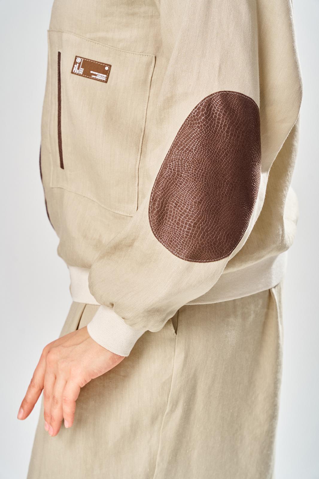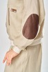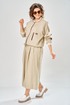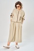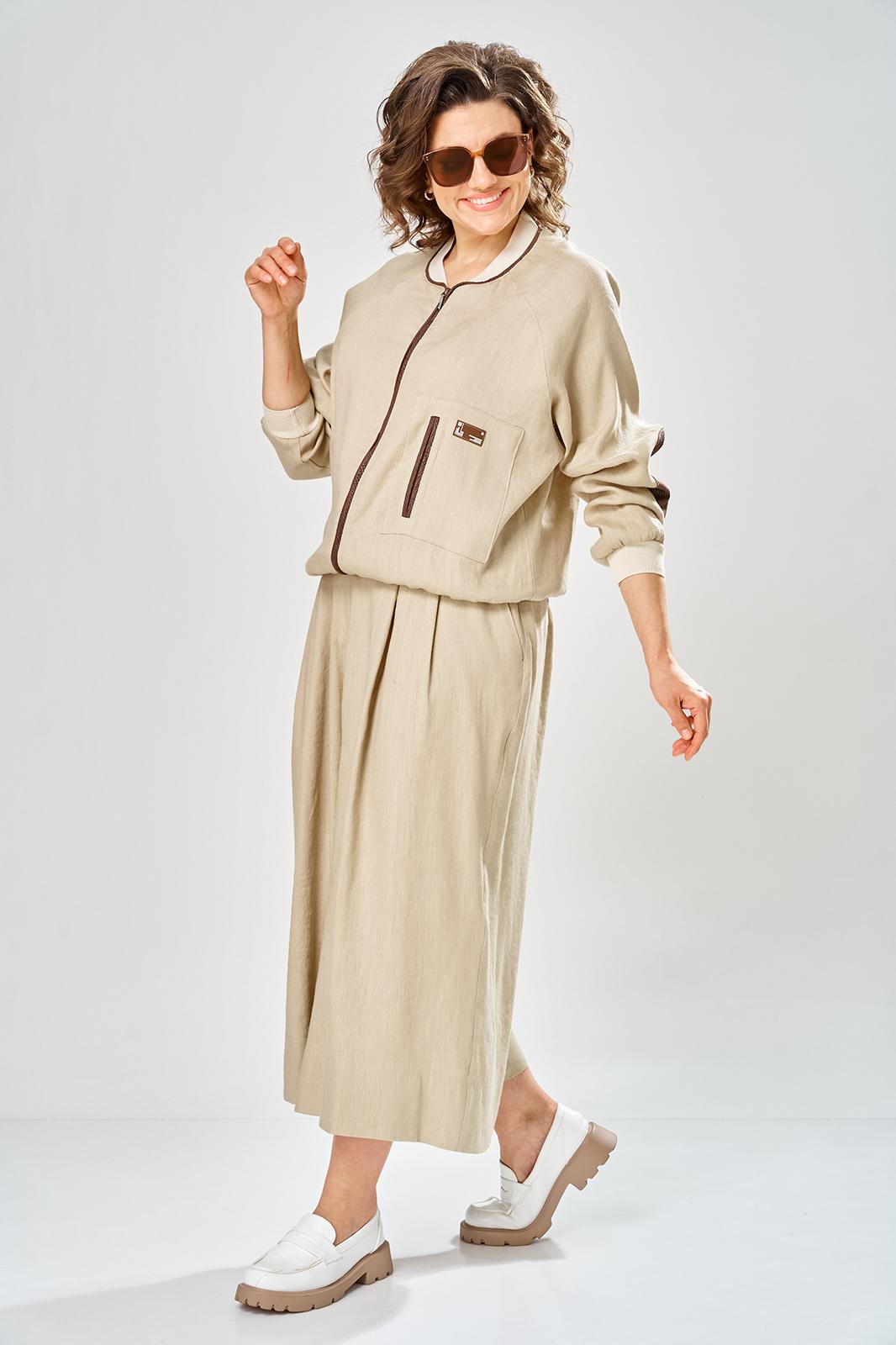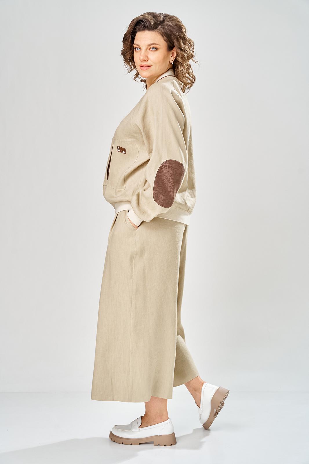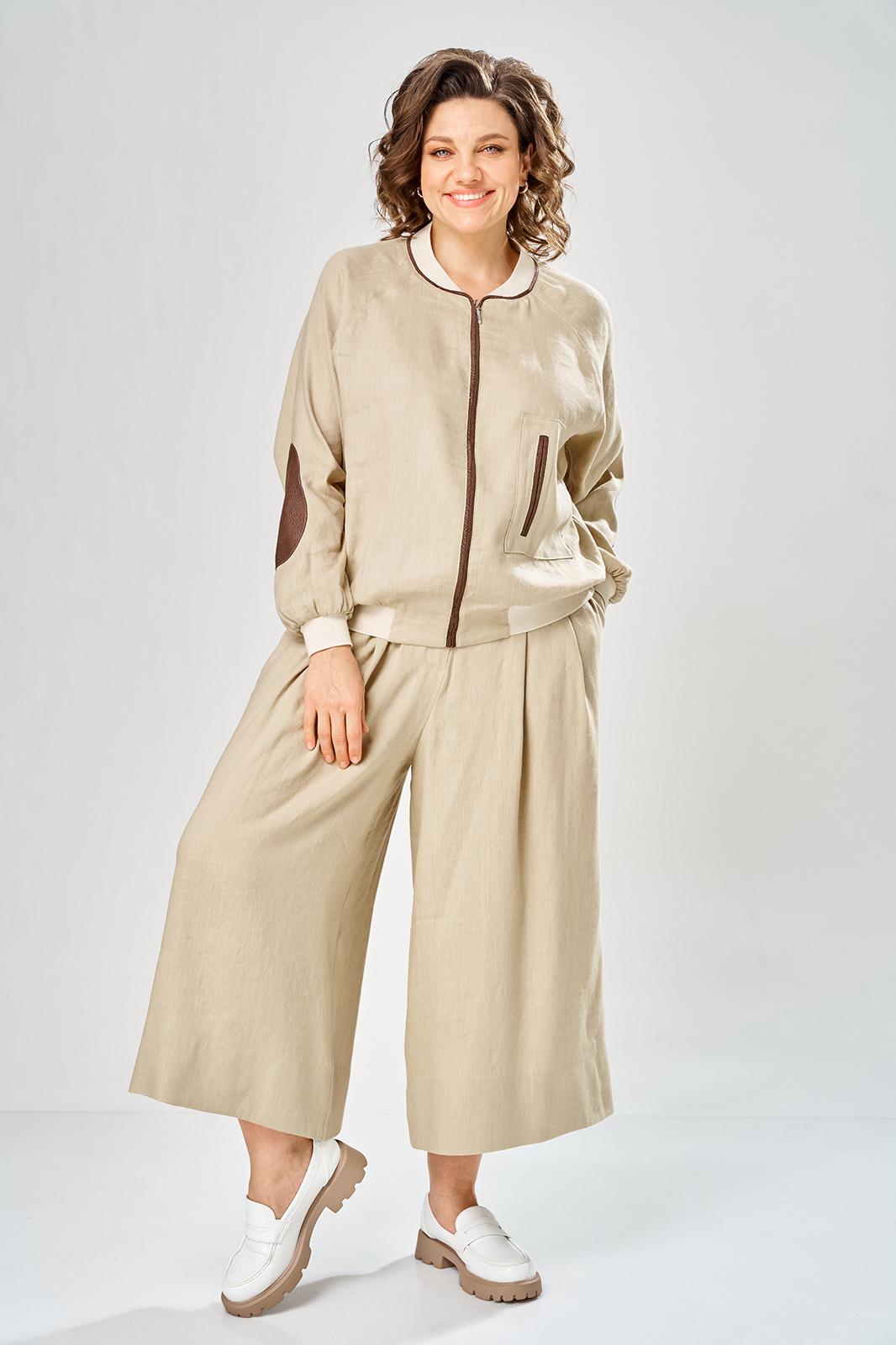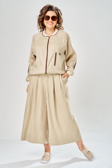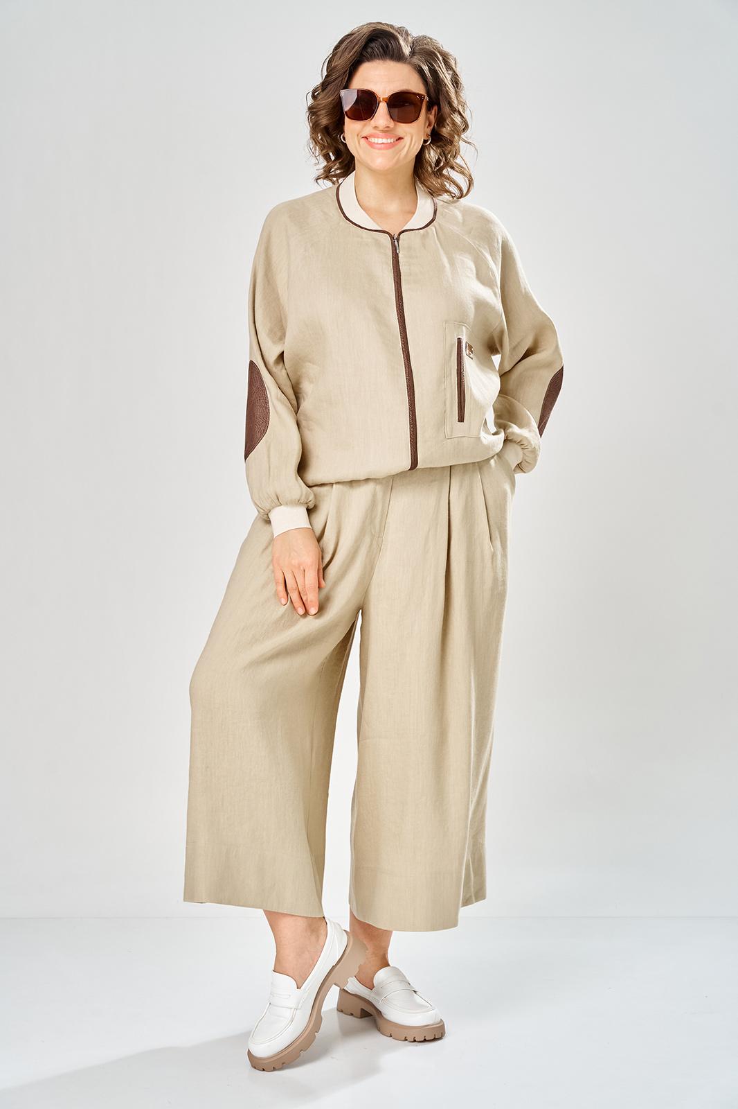 Комплект брючный состоит из кофты-бомбера и брюк-кюлотов. Кофта с центральной застежкой на молнию. Спинка украшена сверху нашивкой. Правая полочка с нагрудеым карманом с рамкой и нашивкой. Рукав-реглан с заплаткой на локте. По низу рукава, горловине и низу кофты трикотажный довяз. Вдоль горловины и по бортам кант из отделочной ткани. Брюки-кюлоты прямые, широкие. Передние половинки брюк с 2-мя мягкими складками, боковыми карманами и застежкой на молнию. Пояс по спинке на резинке.