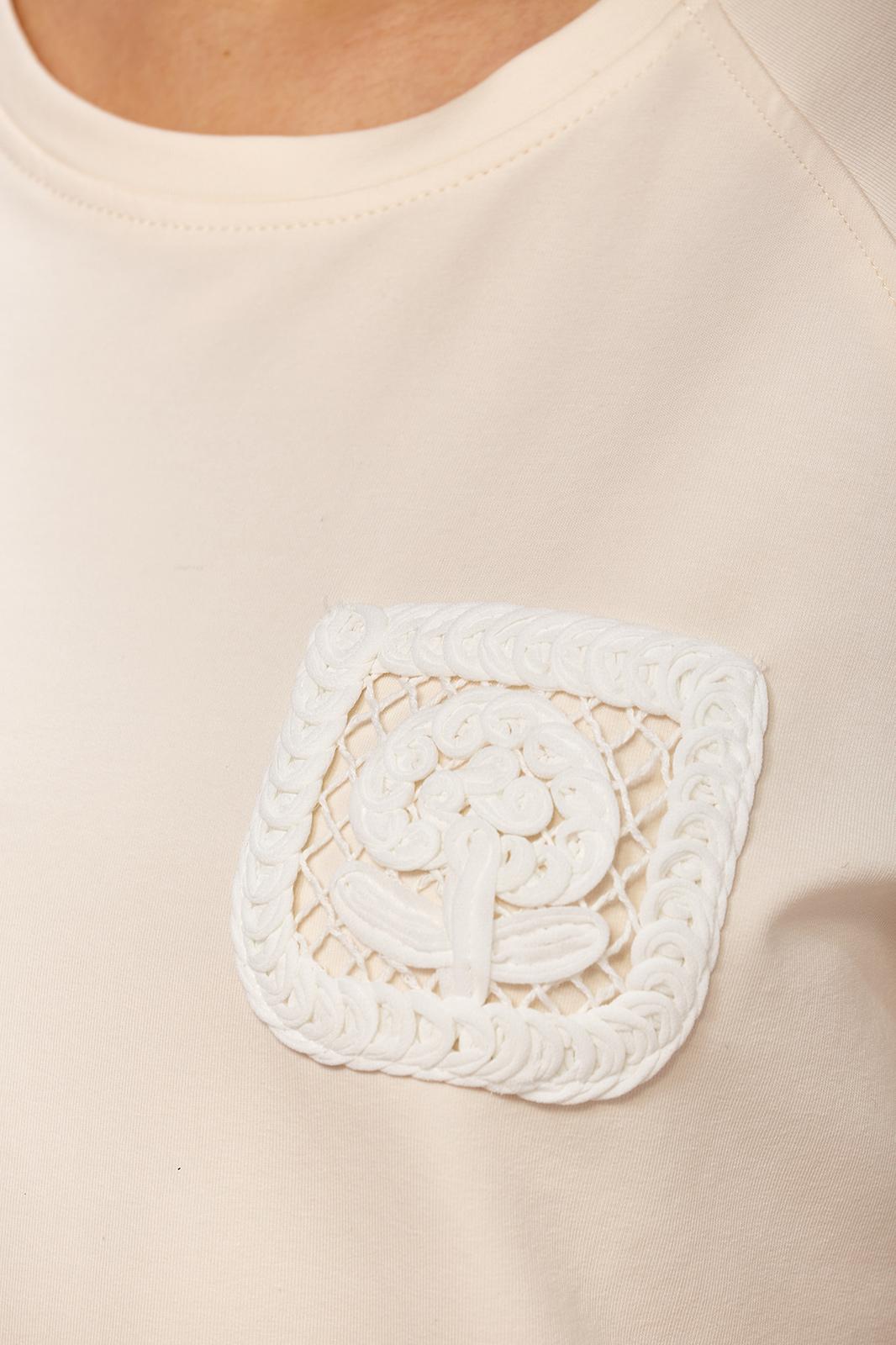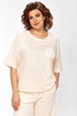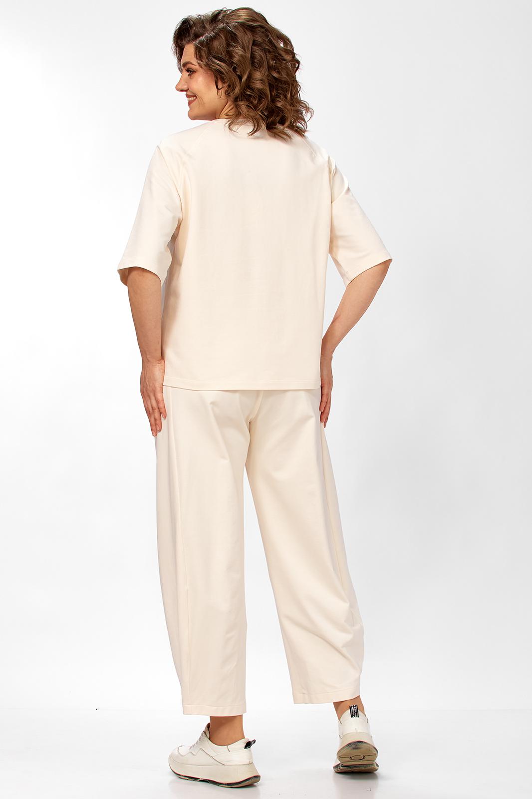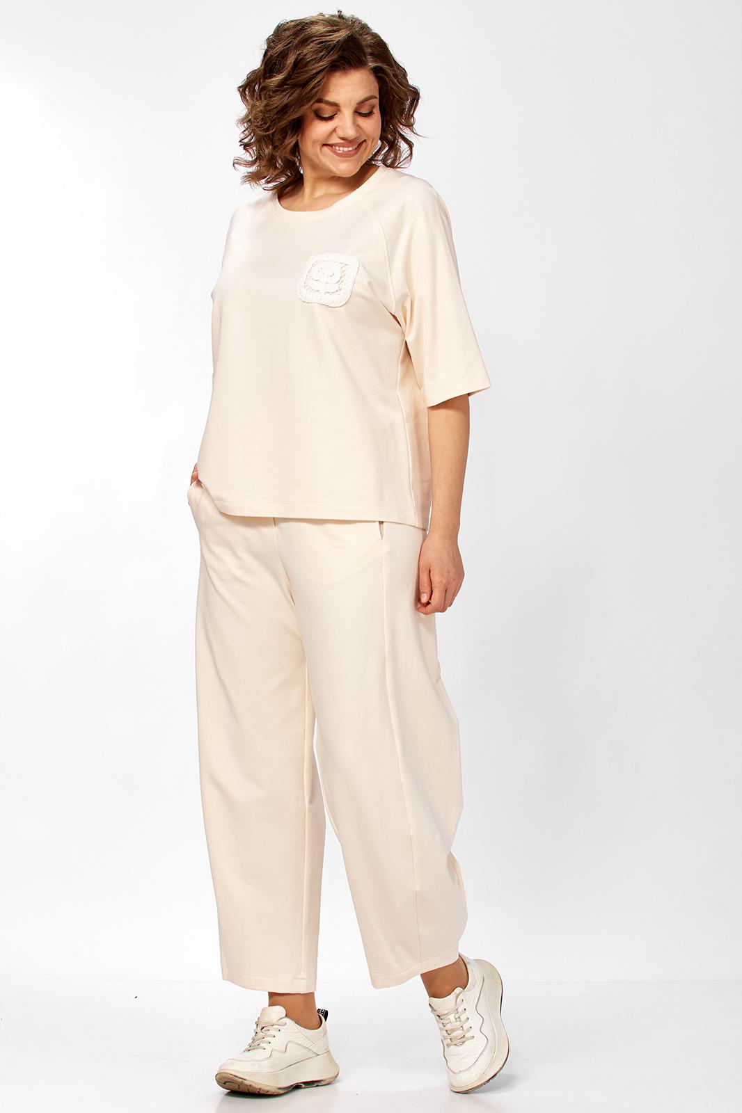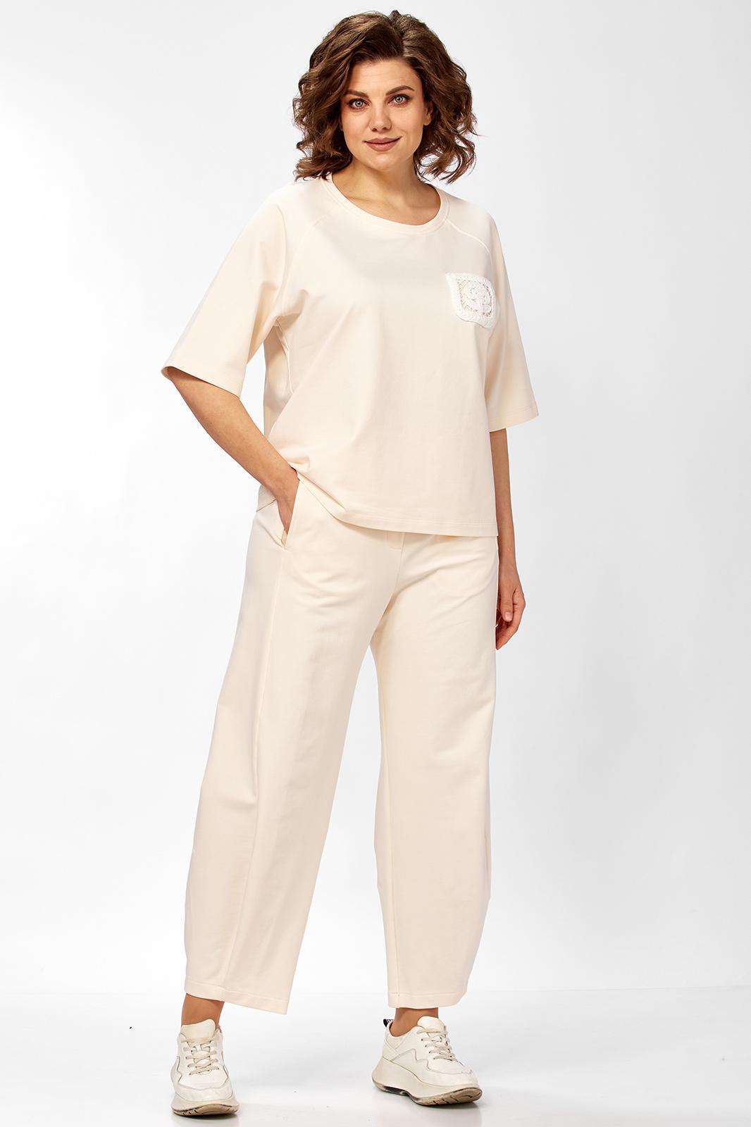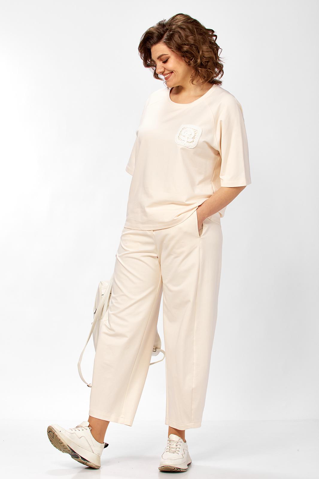 Комплект брючный состоит из майки и брюк. Майка свободного кроя, рукав реглан длиной до линии локтя, горловина обработана бейкой, по переду отделочный карман. Брюки широкие с заужением к линии низа. На задней половинке-кокетка, отрезная боковая часть. В рельефном шве передней половинки-карманы. Верхний срез обработан поясом с резинкой. Шлевки из отделочной ткани, съемный шнур-пояс. В качестве отделки используются детали и фурнитура.