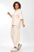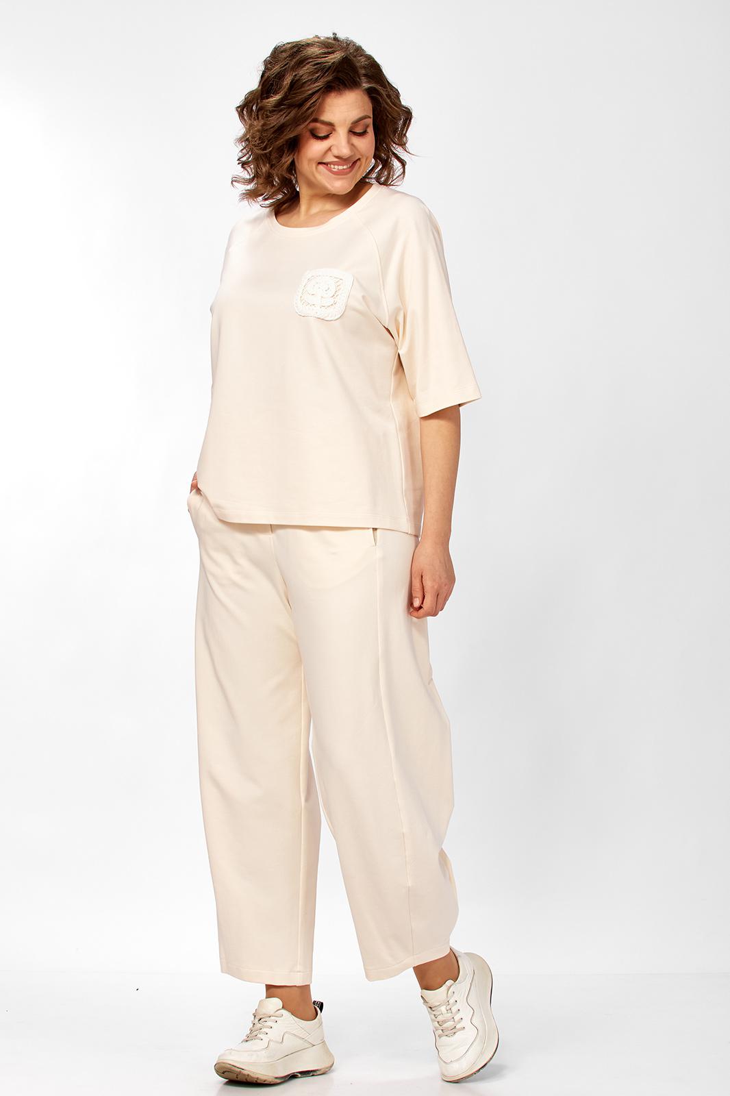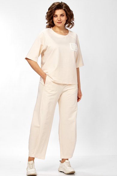 Комплект брючный состоит из майки и брюк. Майка свободного кроя, рукав реглан длиной до линии локтя, горловина обработана бейкой, по переду отделочный карман. Брюки широкие с заужением к линии низа. На задней половинке-кокетка, отрезная боковая часть. В рельефном шве передней половинки-карманы. Верхний срез обработан поясом с резинкой. Шлевки из отделочной ткани, съемный шнур-пояс. В качестве отделки используются детали и фурнитура.