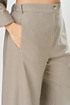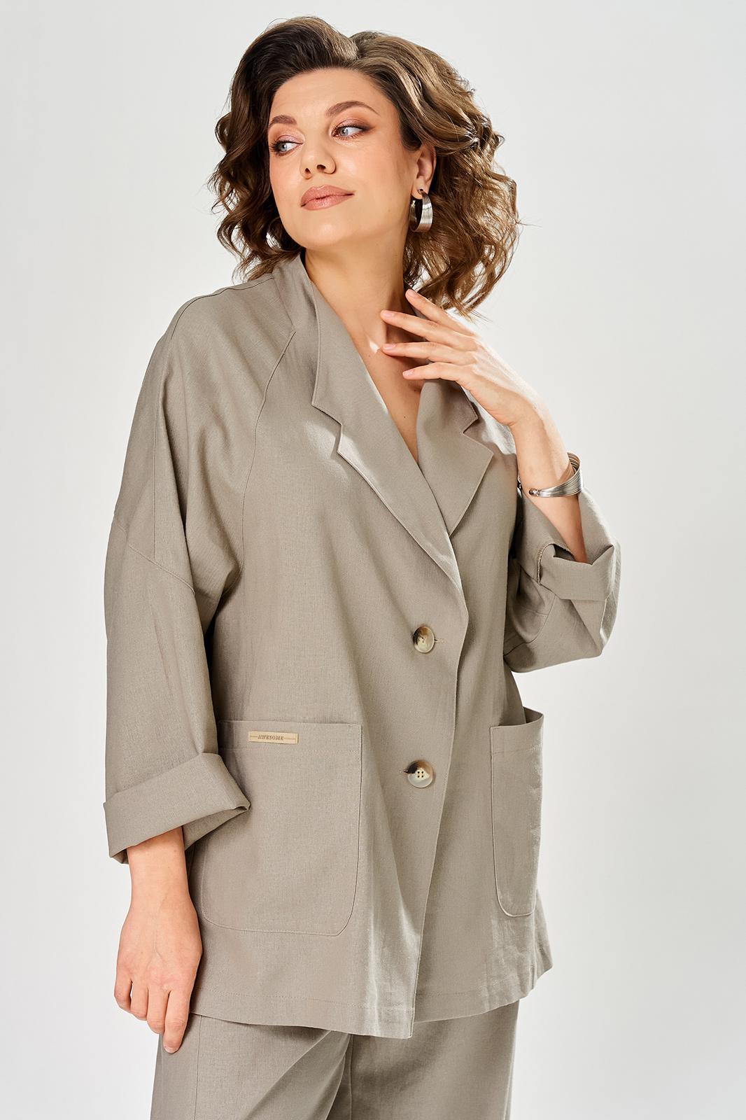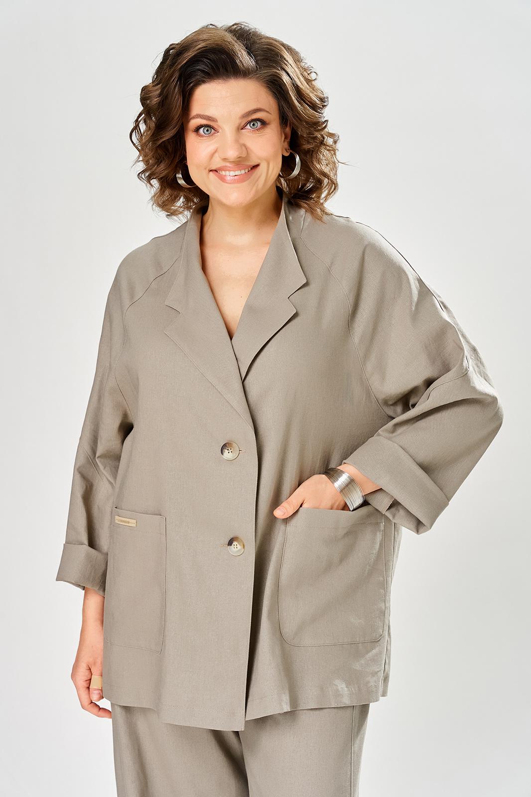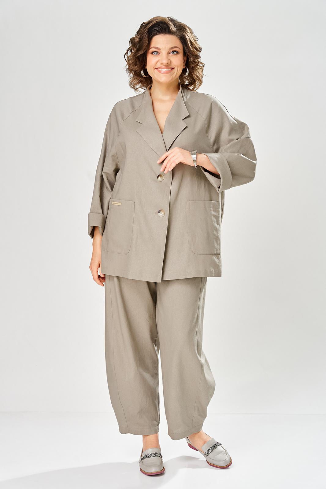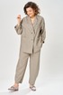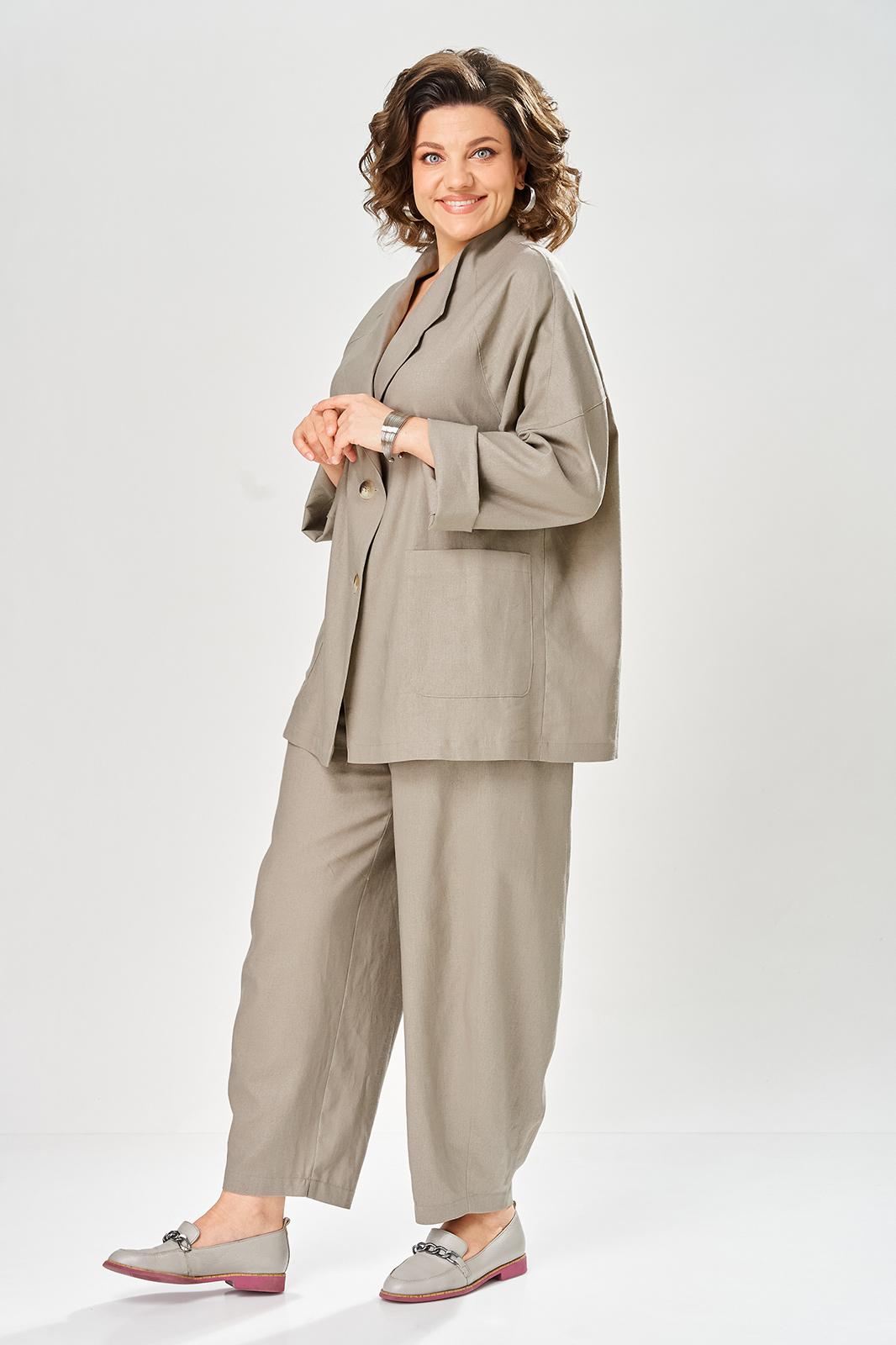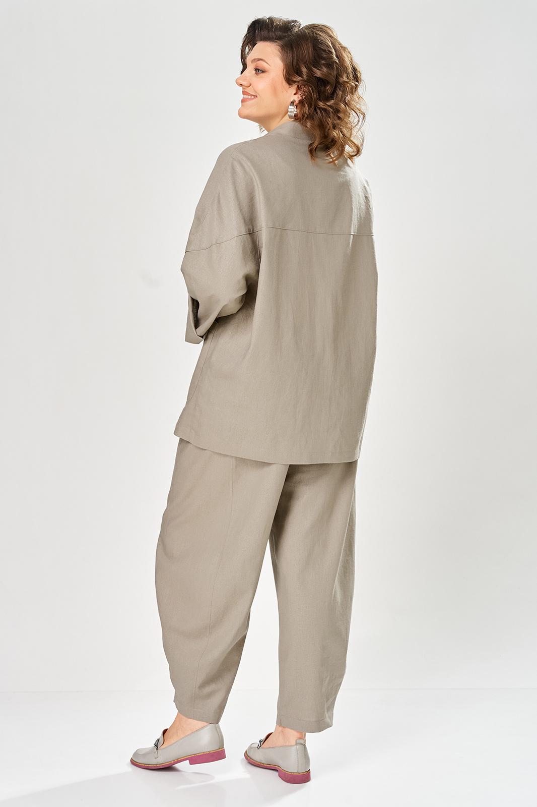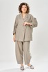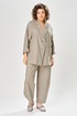 Комплект брючный свободного кроя состоит из жакета и брюк. Жакет прямого силуэта, с застежкой на 2 петли и пуговицы. Спинка с кокеткой, переходящей в рукав-реглан, перед с боковыми накладными карманами. Воротник стойка, переходящая в отворот с лацканами. На правом кармане декор-нашивка. Брюки О-образного силуэта с отрезными бочками. Задние половинки с кокеткой. Задние половинки брюк с застежкой молния и боковыми карманами в швах. Пояс частично на резинке со шлевками. Фурнитура может отличаться от заявленной на фото.