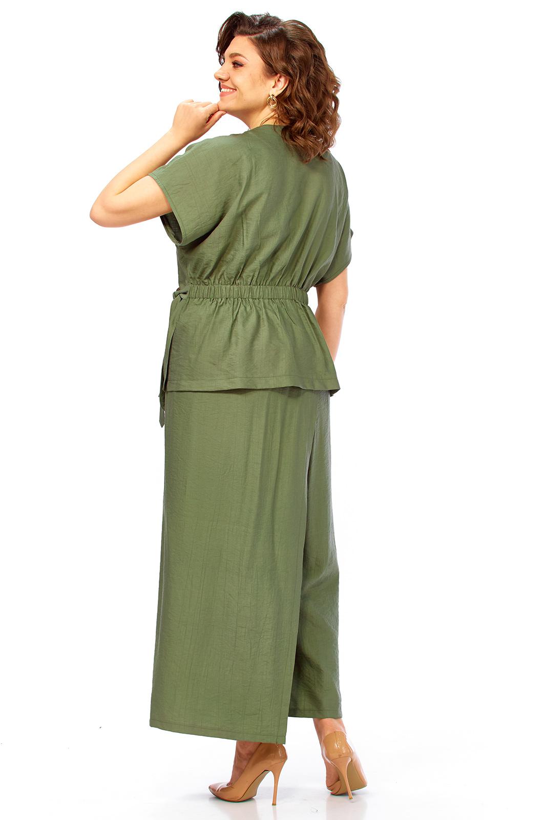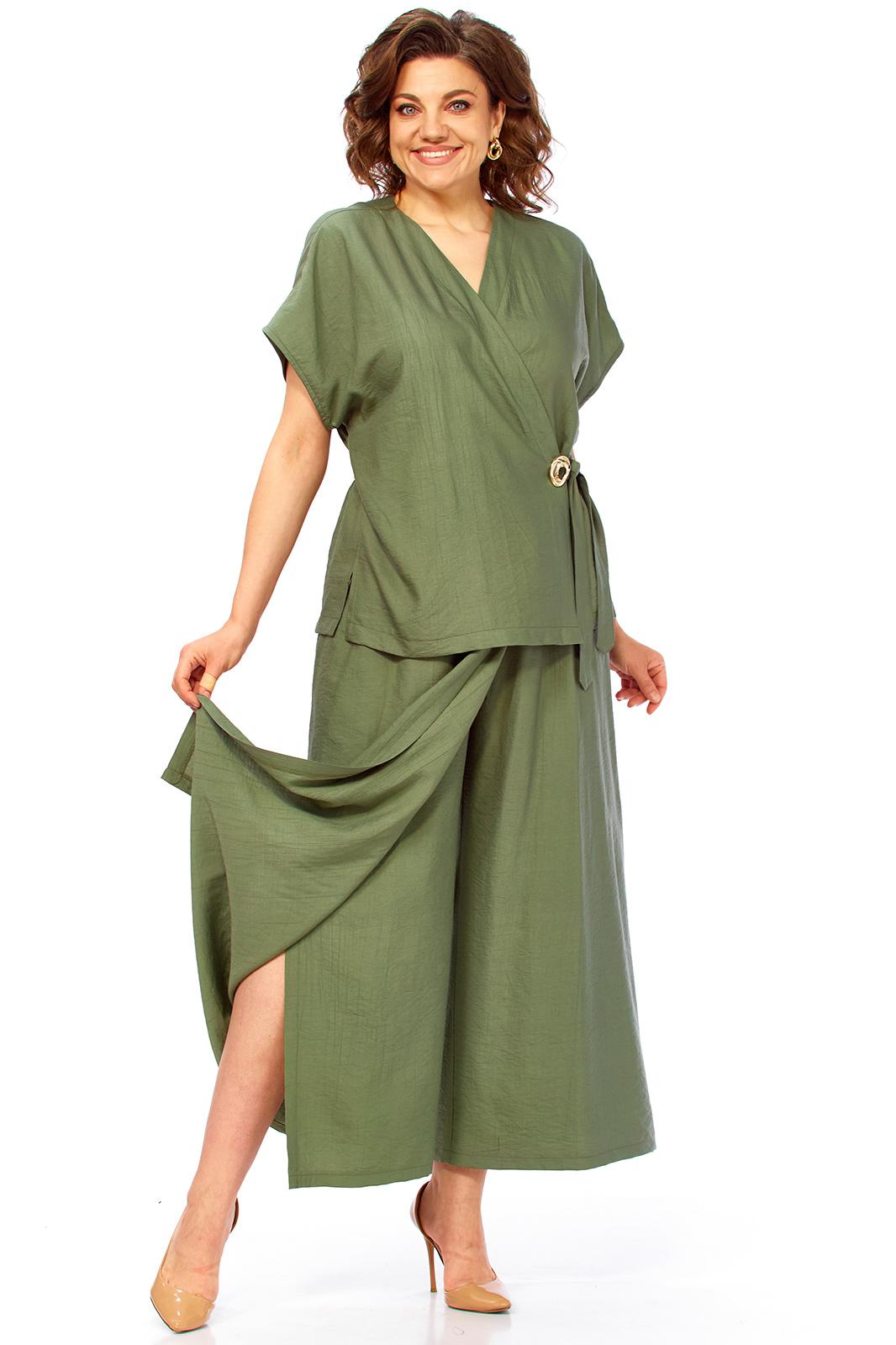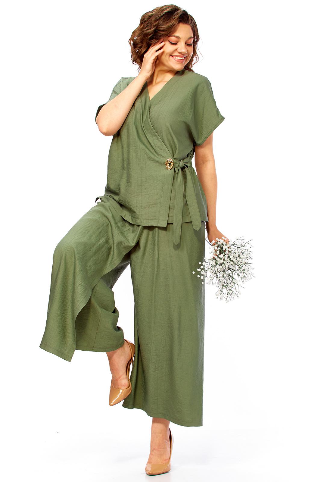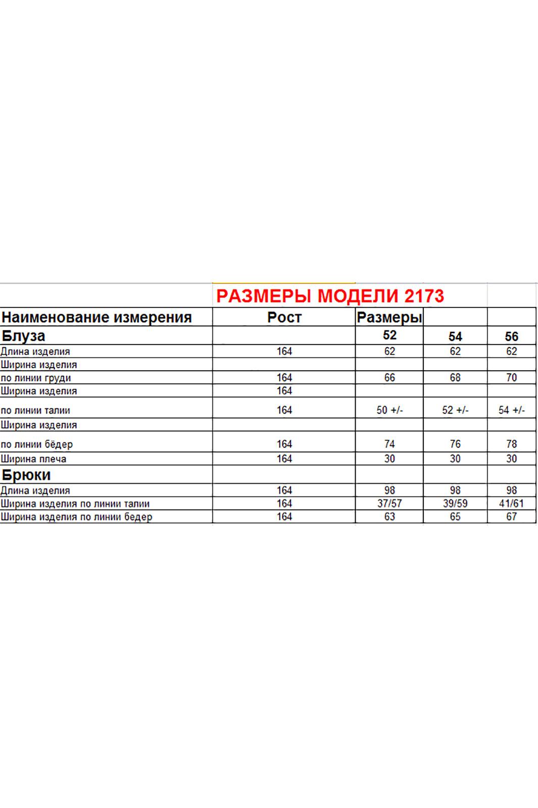 Комплект брючный состоит из блузы и брюк-кюлотов. Блуза свободного кроя с запахом, застегивается на завязки в области талии. Спинка с кулисой и резинкой по талии. В боковых швах обработаны разрезы. Проймы со спущенной линией плеча. В качестве декора брошь в области талии. Брюки-кюлоты свободного кроя с запахом спереди и сзади. Пояс притачной на резинке. Внутри по бокам брюки с разрезами. Длина по спинке 62 см. Длина брюк 98 см.