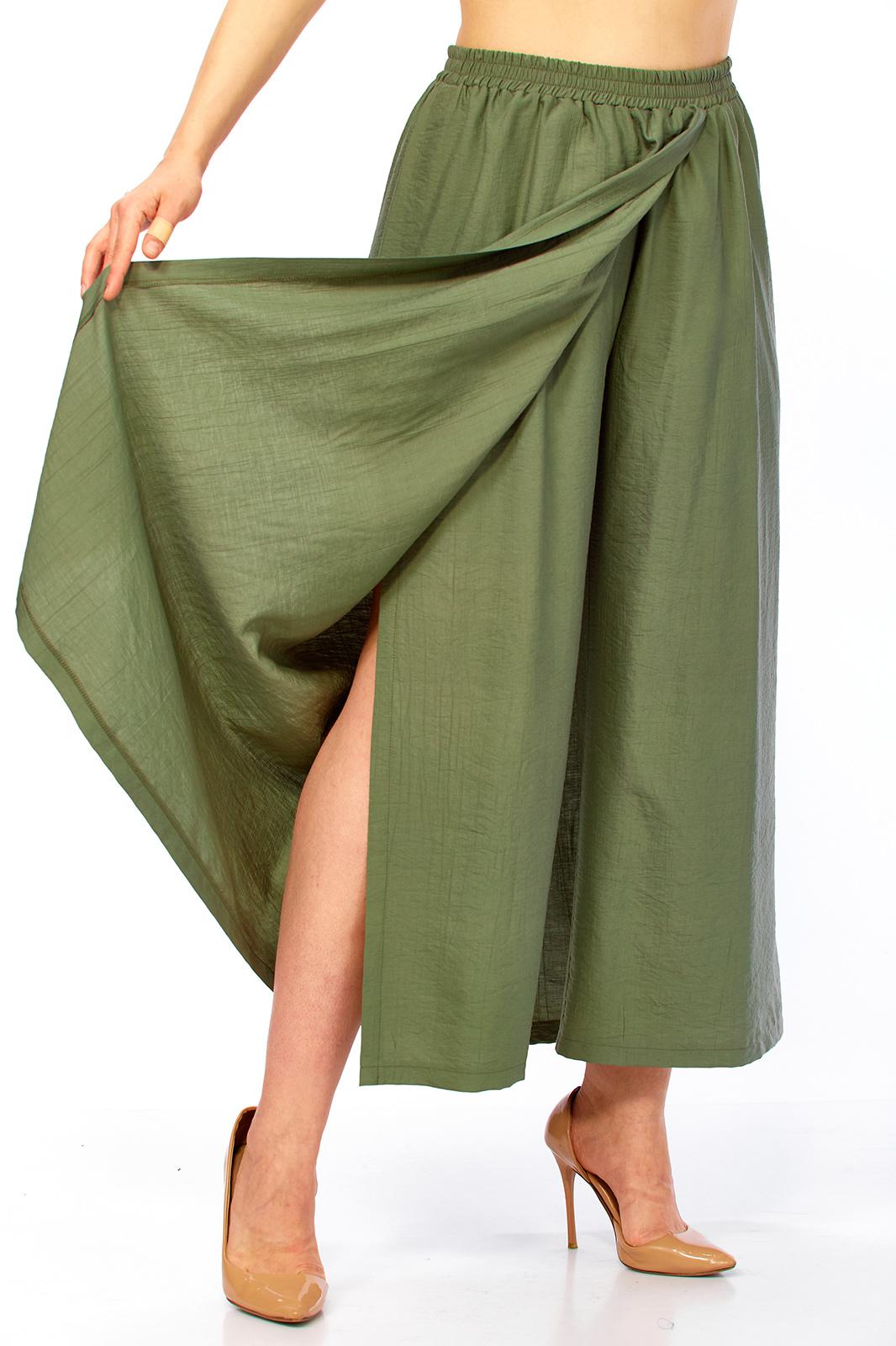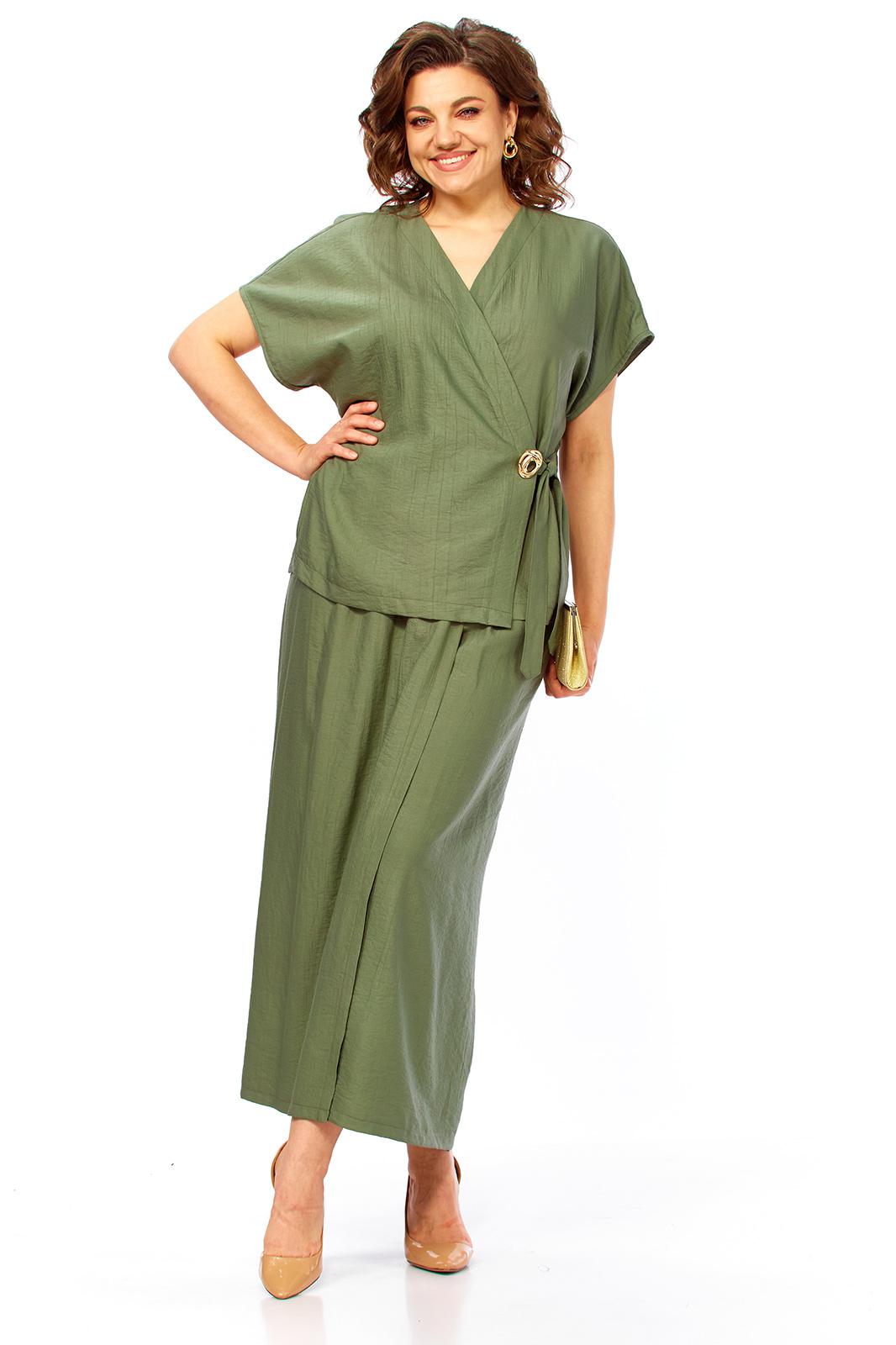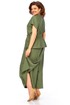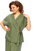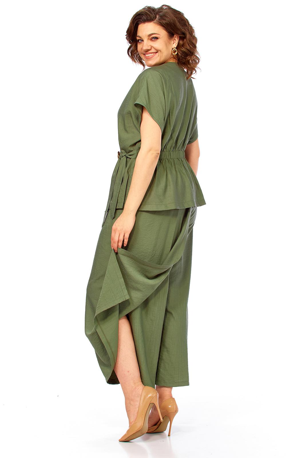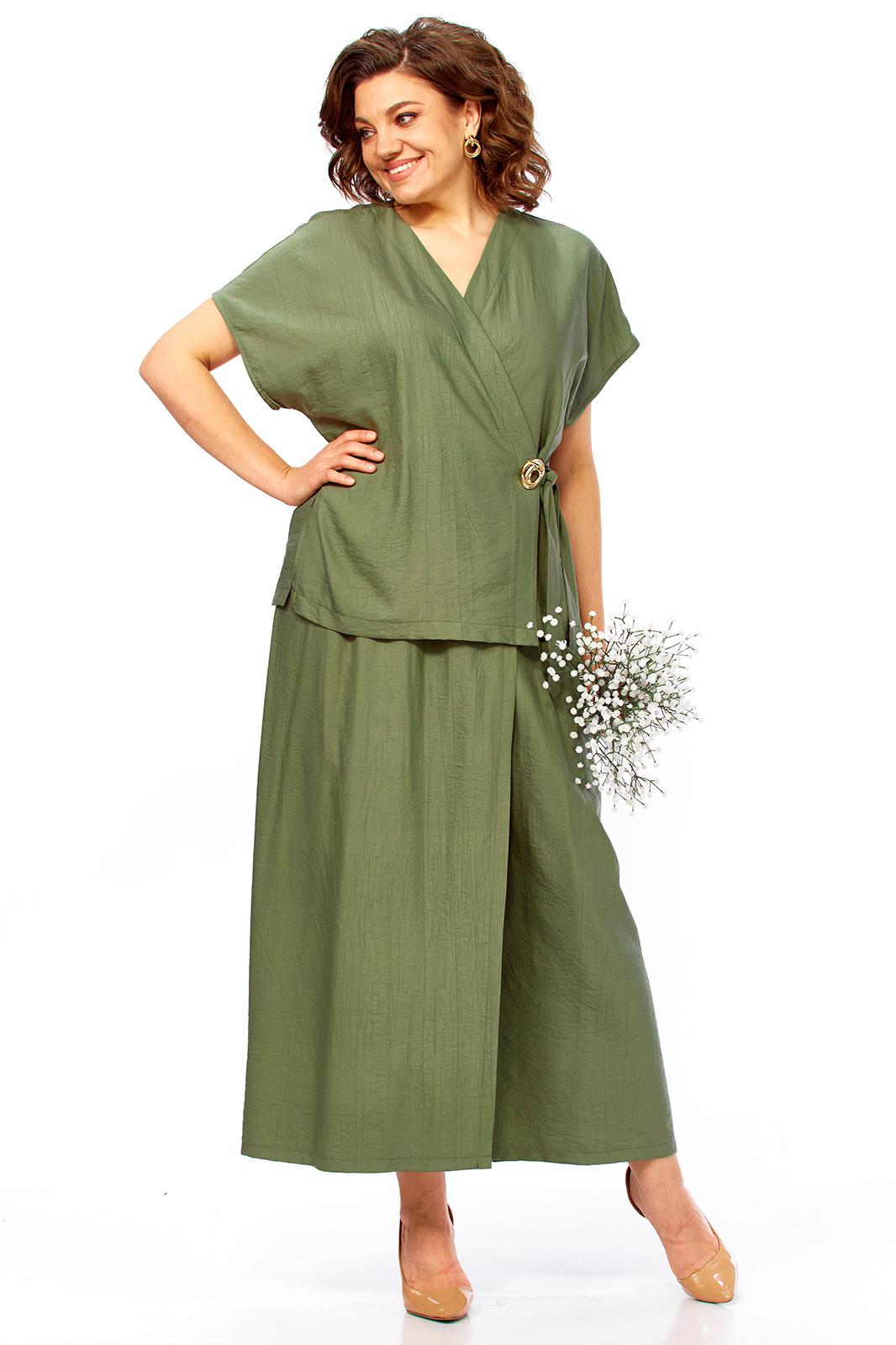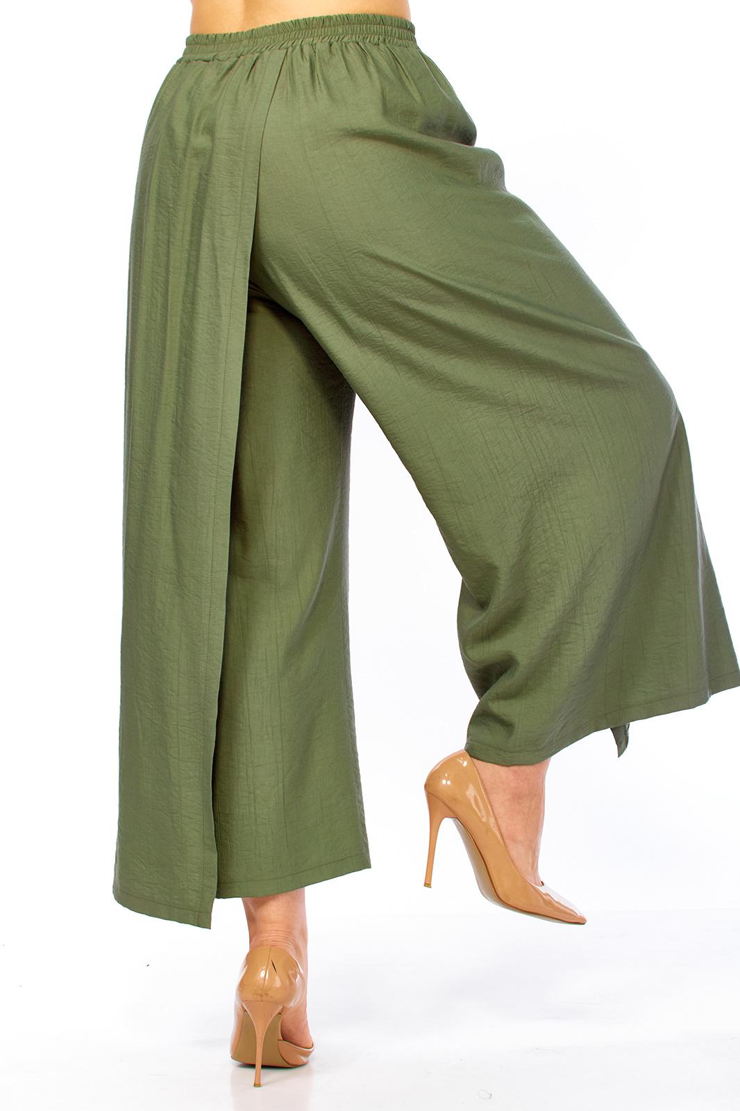 Комплект брючный состоит из блузы и брюк-кюлотов. Блуза свободного кроя с запахом, застегивается на завязки в области талии. Спинка с кулисой и резинкой по талии. В боковых швах обработаны разрезы. Проймы со спущенной линией плеча. В качестве декора брошь в области талии. Брюки-кюлоты свободного кроя с запахом спереди и сзади. Пояс притачной на резинке. Внутри по бокам брюки с разрезами. Длина по спинке 62 см. Длина брюк 98 см.