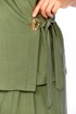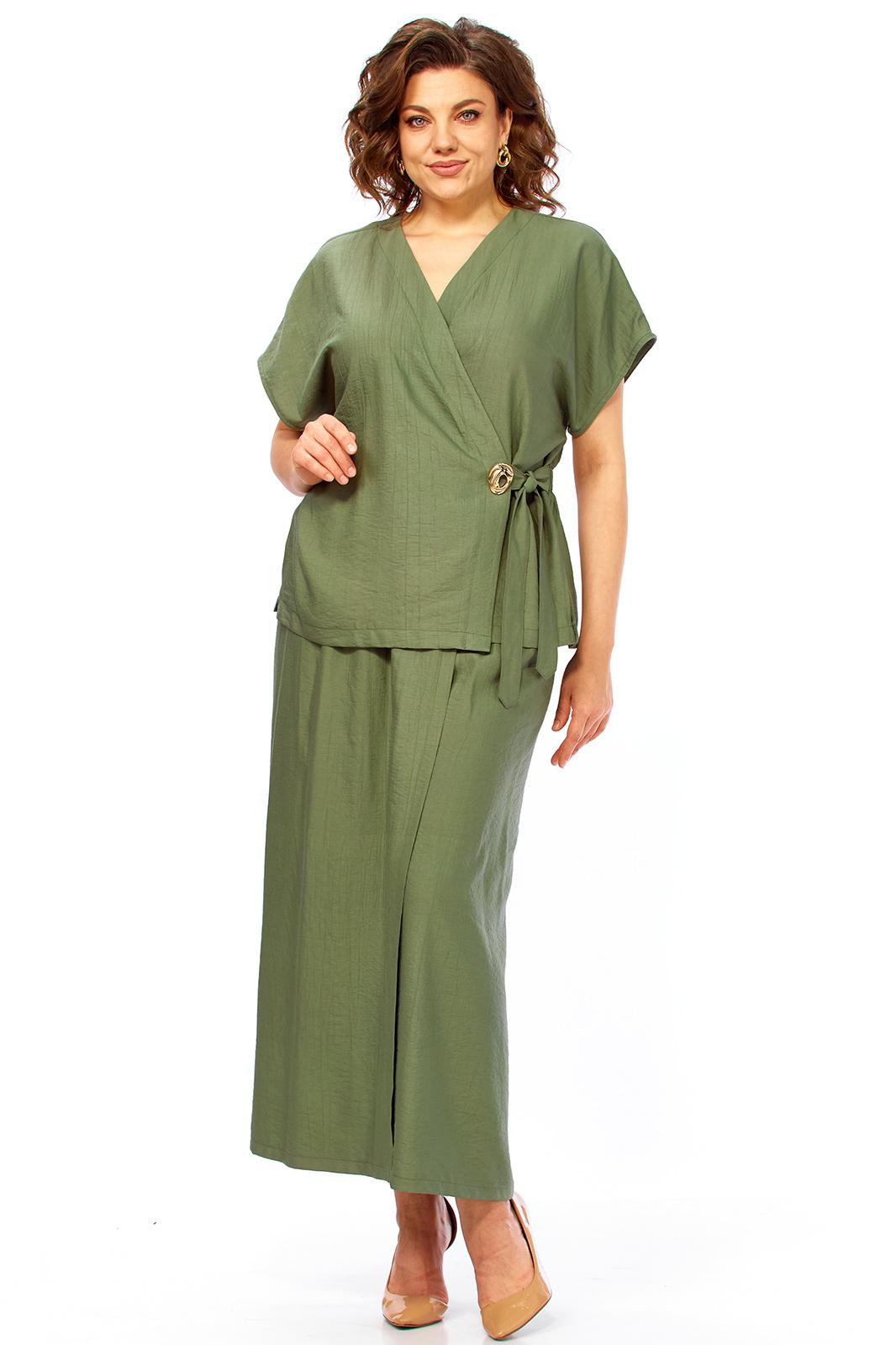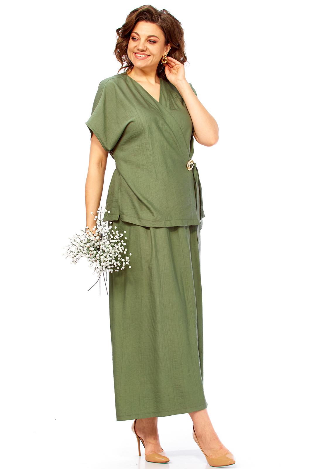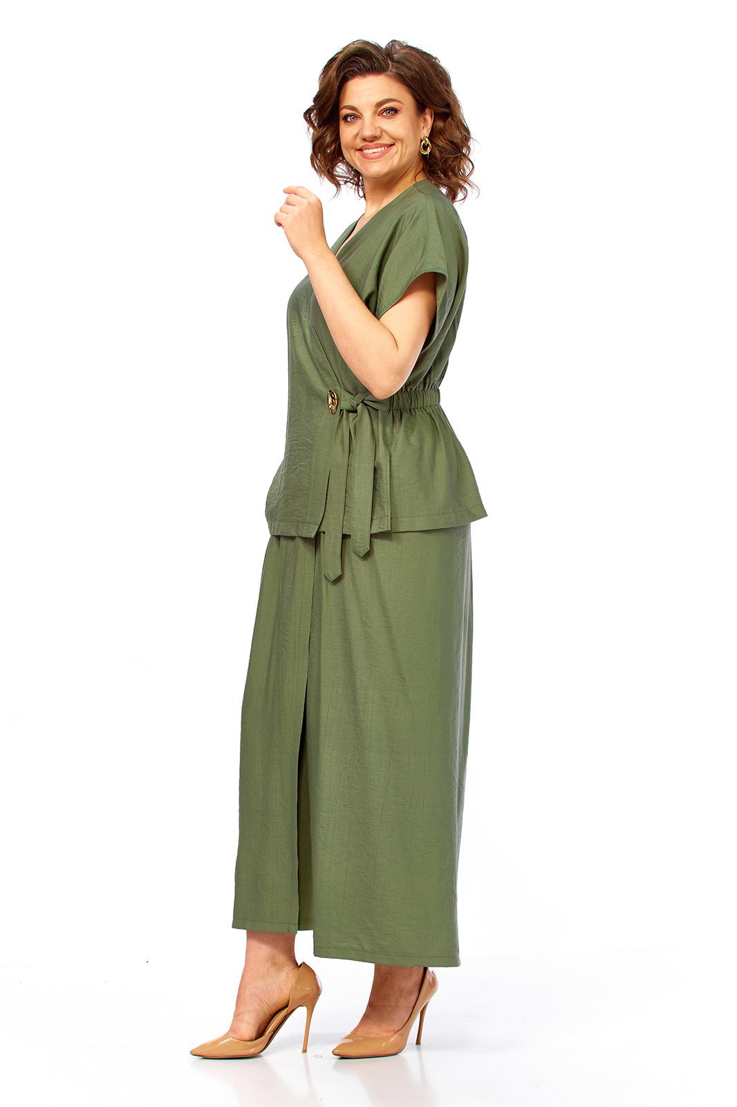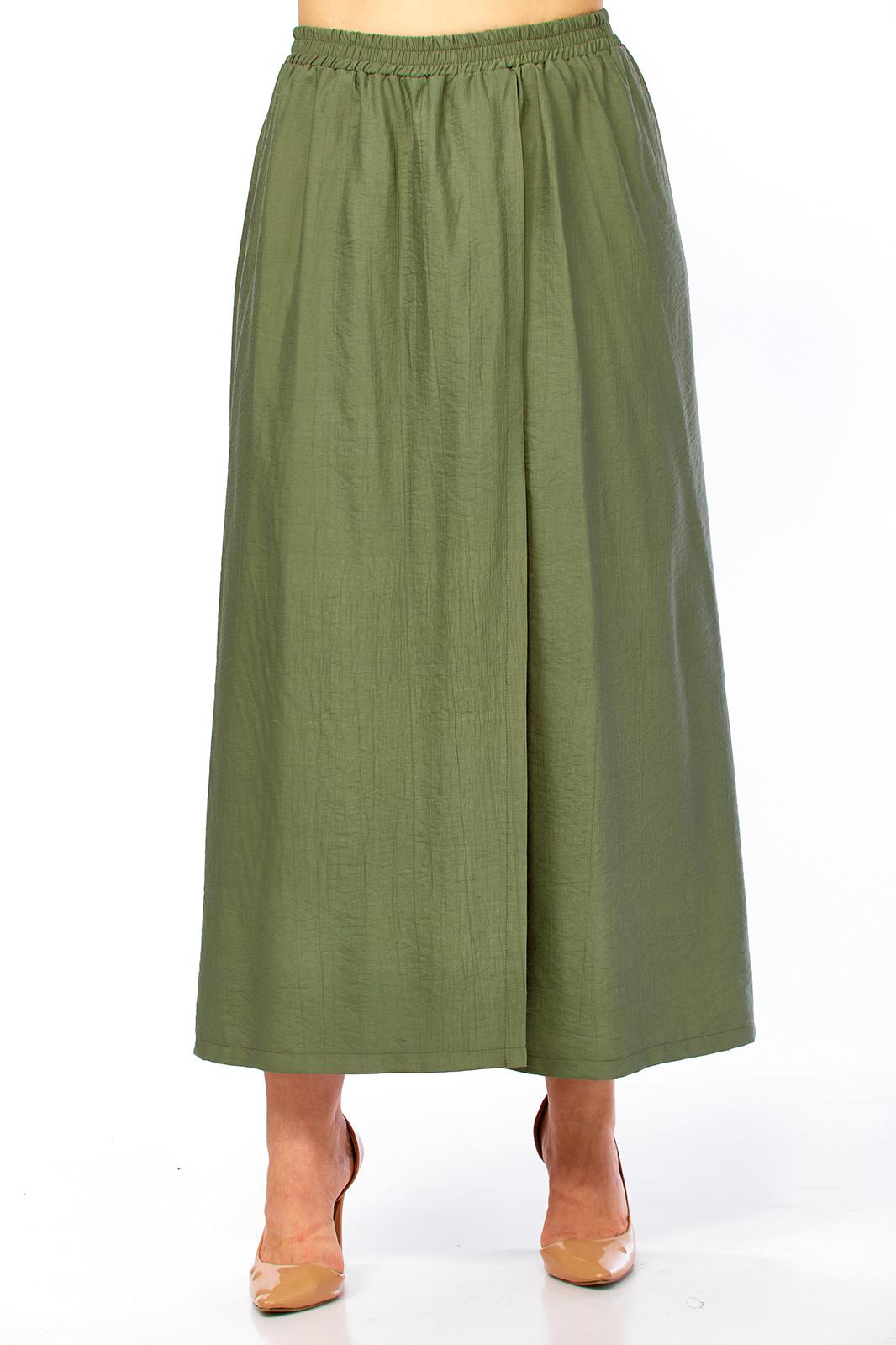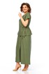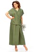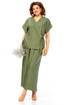Комплект брючный состоит из блузы и брюк-кюлотов. Блуза свободного кроя с запахом, застегивается на завязки в области талии. Спинка с кулисой и резинкой по талии. В боковых швах обработаны разрезы. Проймы со спущенной линией плеча. В качестве декора брошь в области талии. Брюки-кюлоты свободного кроя с запахом спереди и сзади. Пояс притачной на резинке. Внутри по бокам брюки с разрезами. Длина по спинке 62 см. Длина брюк 98 см.