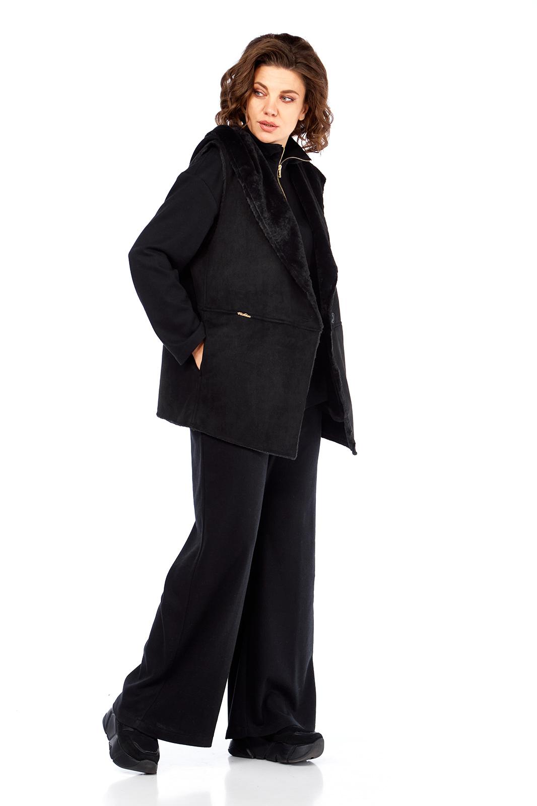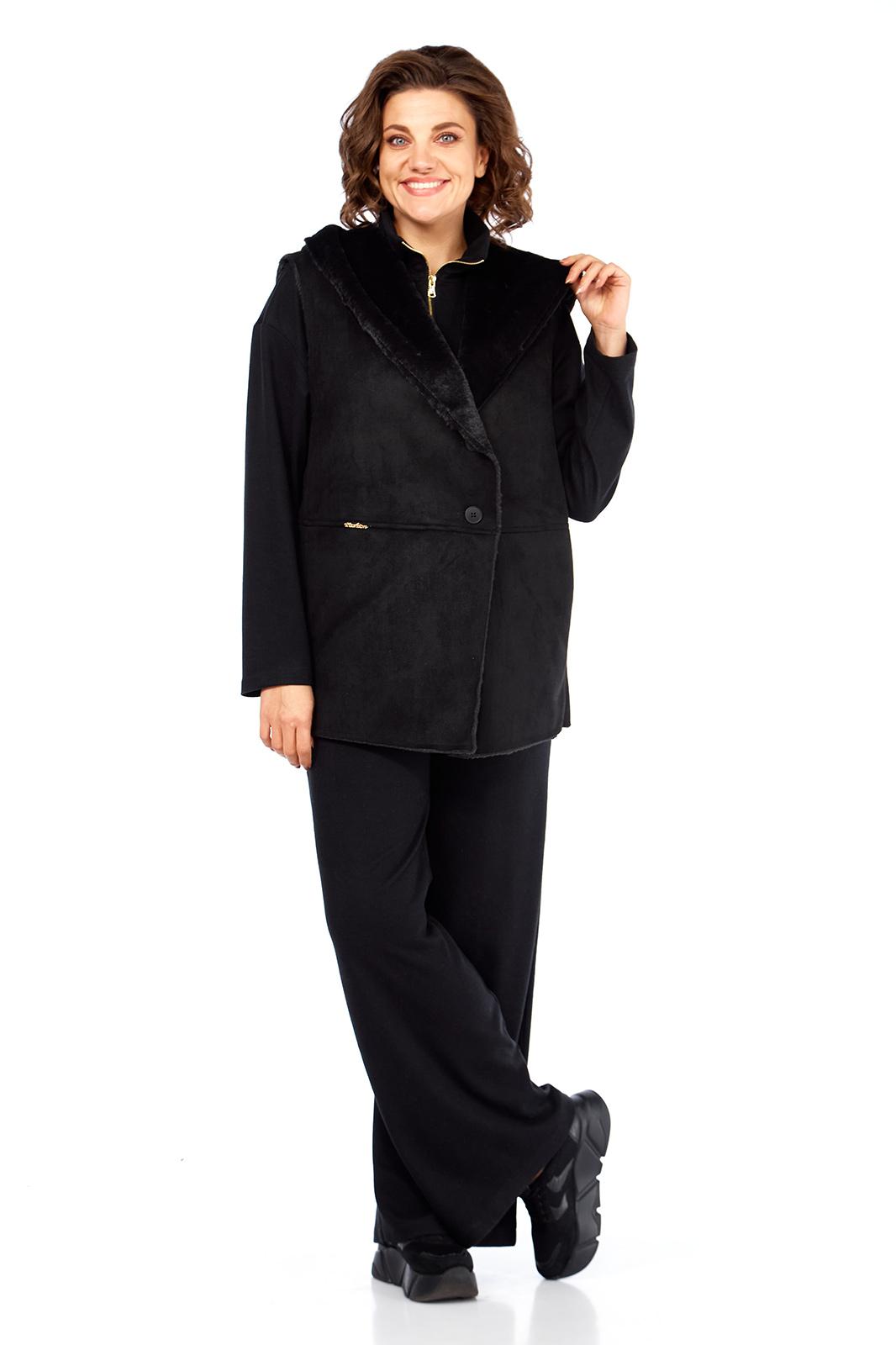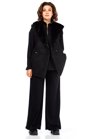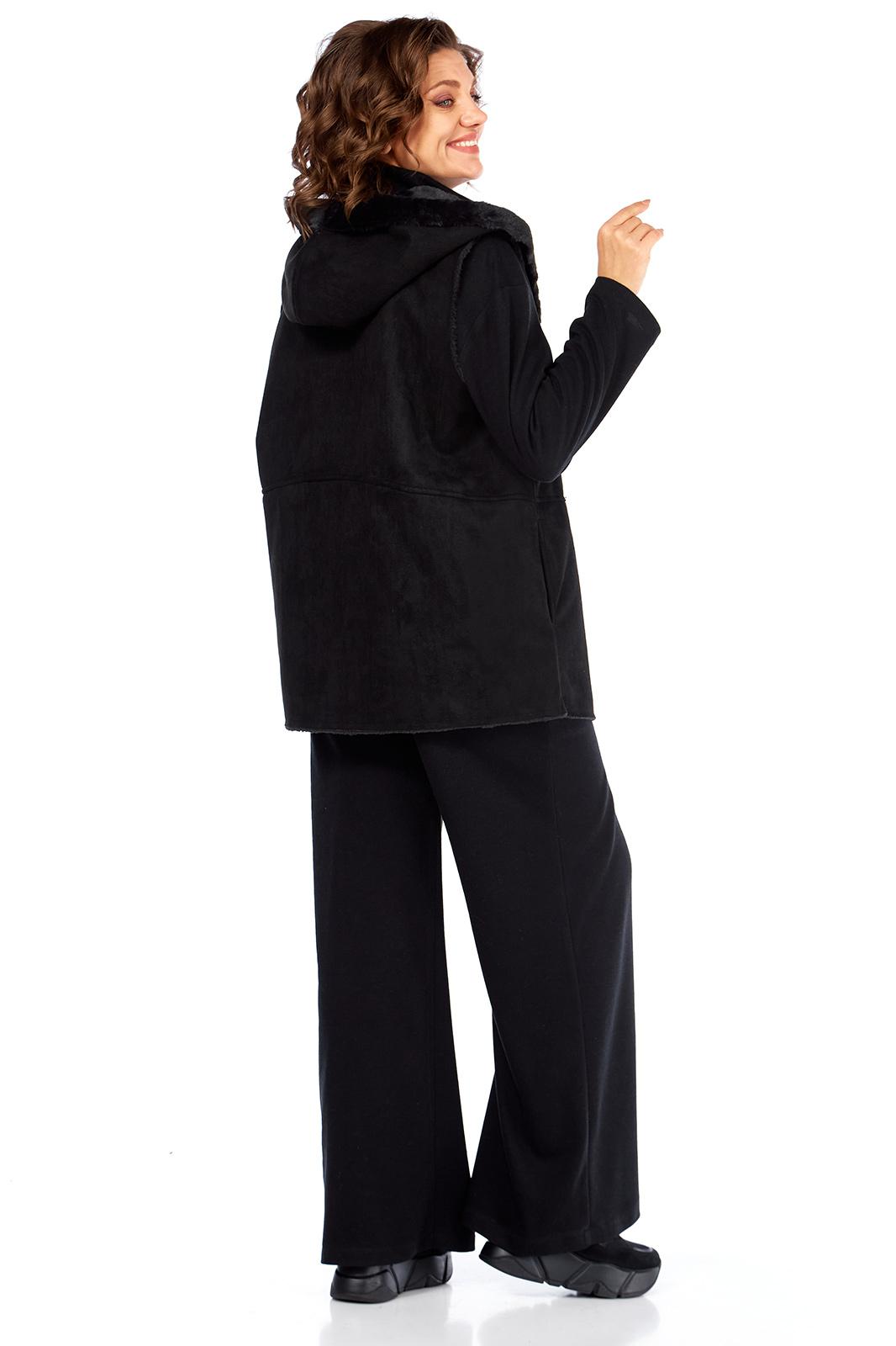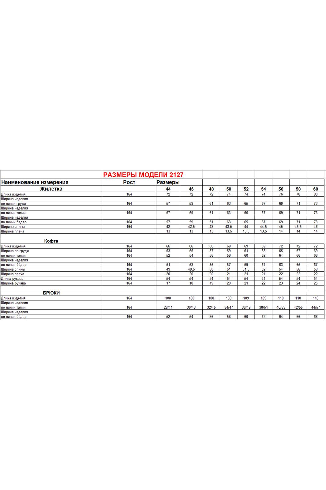 Комплект брючный состоит из кофты, жилетки и брюк. Кофта полуприлегающего силуэта со спущенным плечом, рукав втачной, одношовный. Воротник стойка с застежкой на тесьму-молнию. По боковым швам разрезы. Брюки расширенные книзу, верхний срез обработан поясом с резинкой. В боковых швах карманы. Жилетка свободного кроя со смещенной застежкой на петлю и пуговицу. По спинке горизонтальный рельефный шов на перед, в котором обработаны карманы. Цельнокроенный капюшон с центральной частью. В качестве отделки используется фурнитура. Длина кофты по спинке 66-72 см, длина рукава 54 см. Длина жилетки по спинке 72-80 см. Длина брюк 108-110 см