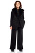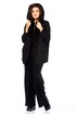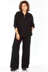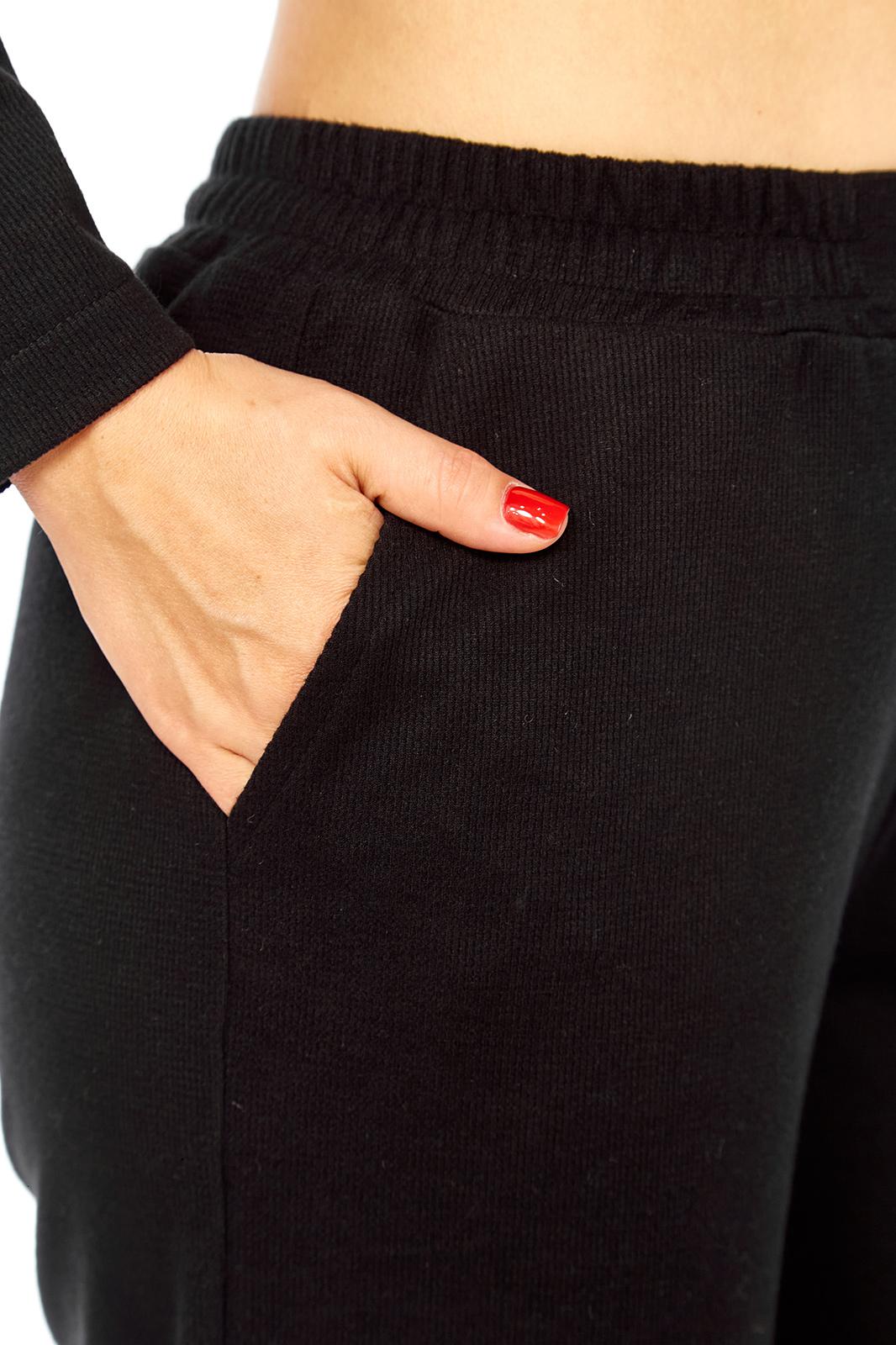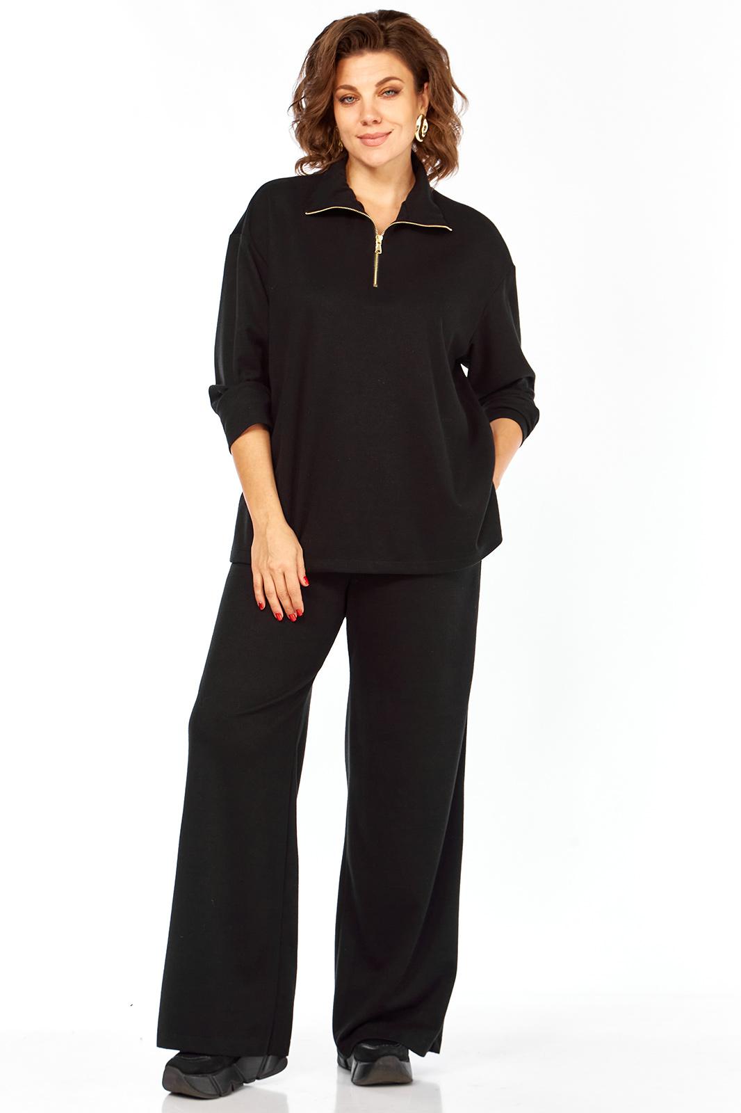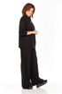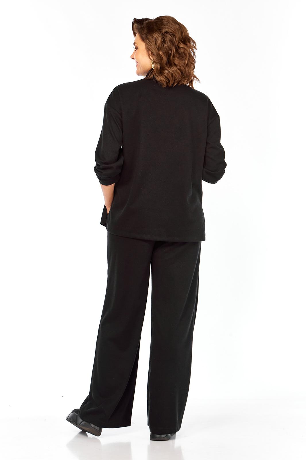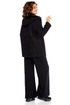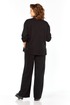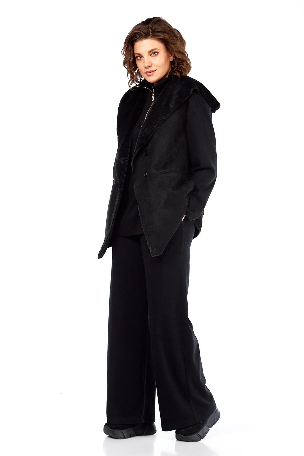 Комплект брючный состоит из кофты, жилетки и брюк. Кофта полуприлегающего силуэта со спущенным плечом, рукав втачной, одношовный. Воротник стойка с застежкой на тесьму-молнию. По боковым швам разрезы. Брюки расширенные книзу, верхний срез обработан поясом с резинкой. В боковых швах карманы. Жилетка свободного кроя со смещенной застежкой на петлю и пуговицу. По спинке горизонтальный рельефный шов на перед, в котором обработаны карманы. Цельнокроенный капюшон с центральной частью. В качестве отделки используется фурнитура. Длина кофты по спинке 66-72 см, длина рукава 54 см. Длина жилетки по спинке 72-80 см. Длина брюк 108-110 см
