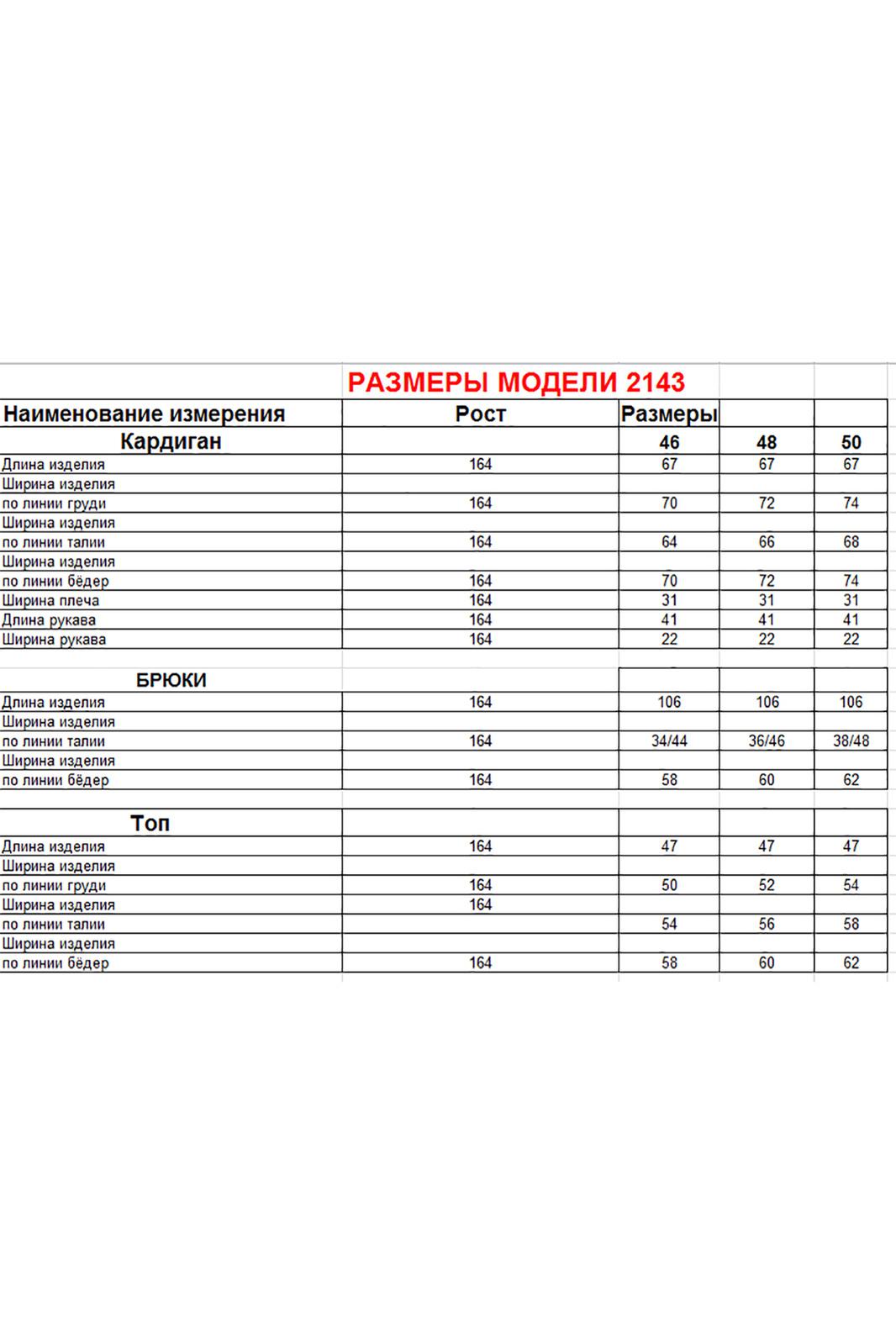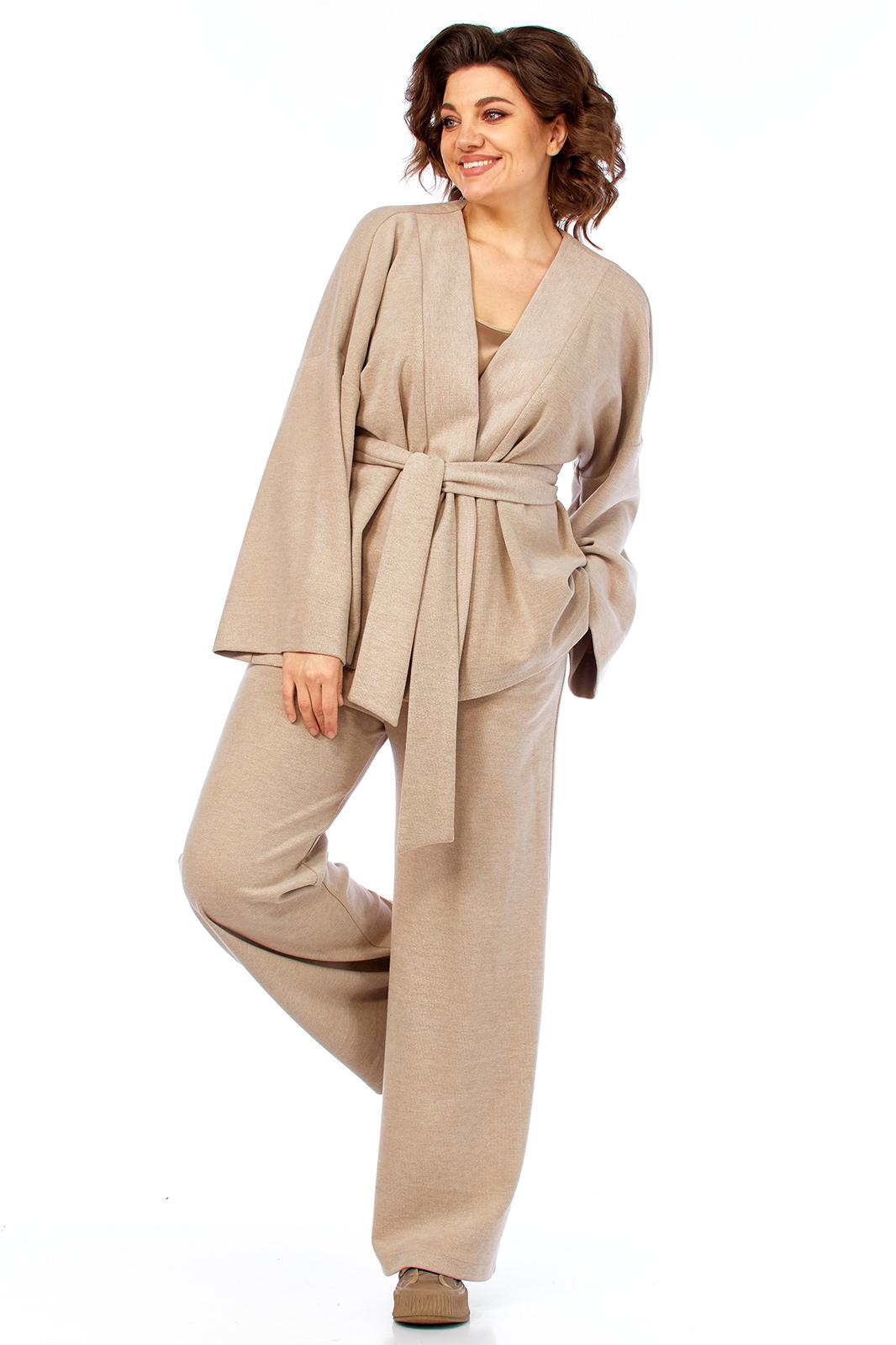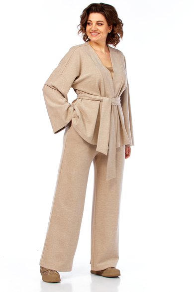 Комплект брючный состоит из брюк, топа и кардигана-кимано. Брюки прямые, широкие с боковыми карманами и поясом на резинке. Топ из отделочной ткани на регулирующихся бретелях с вытачками по переду. Кардиган-кимано длиной до линии бедра, запахивается и завязывается съемным поясом. Рукав втачной одношовный со спущенной линией плеча. По переду шировкая планка. Длина кардигана по спинке 67 см, длина рукава 41 см. Длина брюк 106 см. Длина топа по спинке 47 см