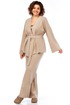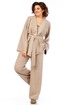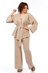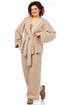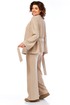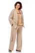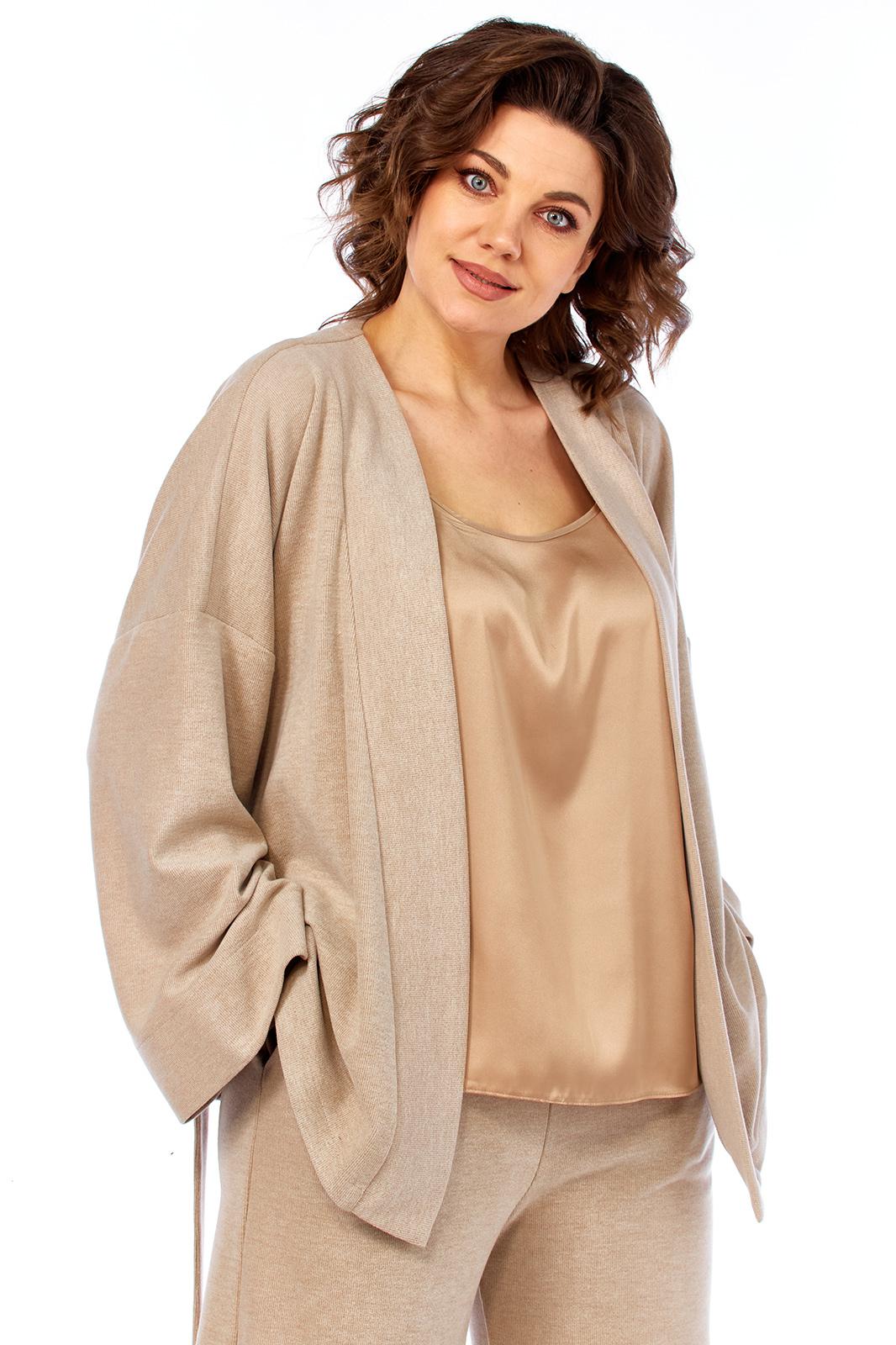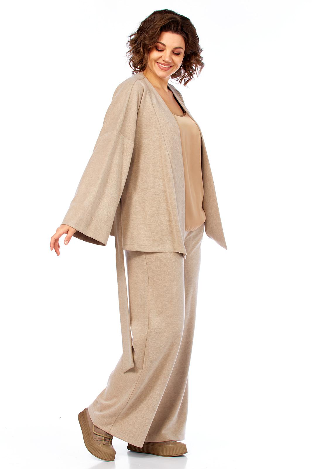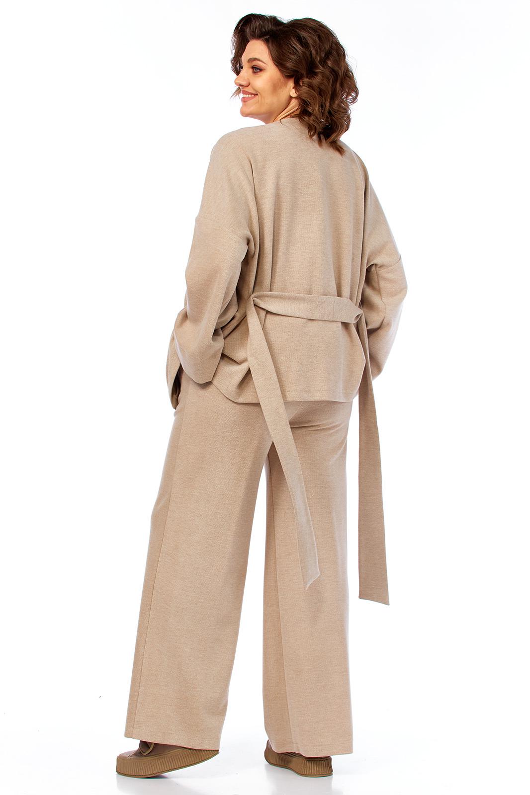 Комплект брючный состоит из брюк, топа и кардигана-кимано. Брюки прямые, широкие с боковыми карманами и поясом на резинке. Топ из отделочной ткани на регулирующихся бретелях с вытачками по переду. Кардиган-кимано длиной до линии бедра, запахивается и завязывается съемным поясом. Рукав втачной одношовный со спущенной линией плеча. По переду шировкая планка. Длина кардигана по спинке 67 см, длина рукава 41 см. Длина брюк 106 см. Длина топа по спинке 47 см