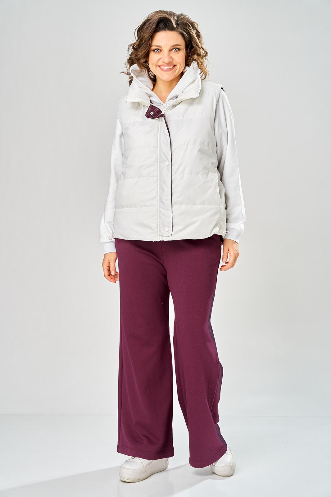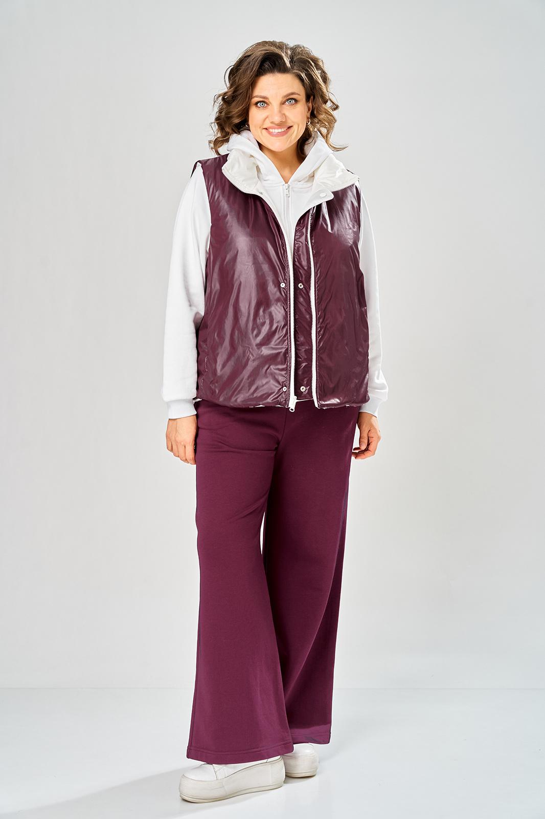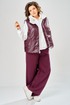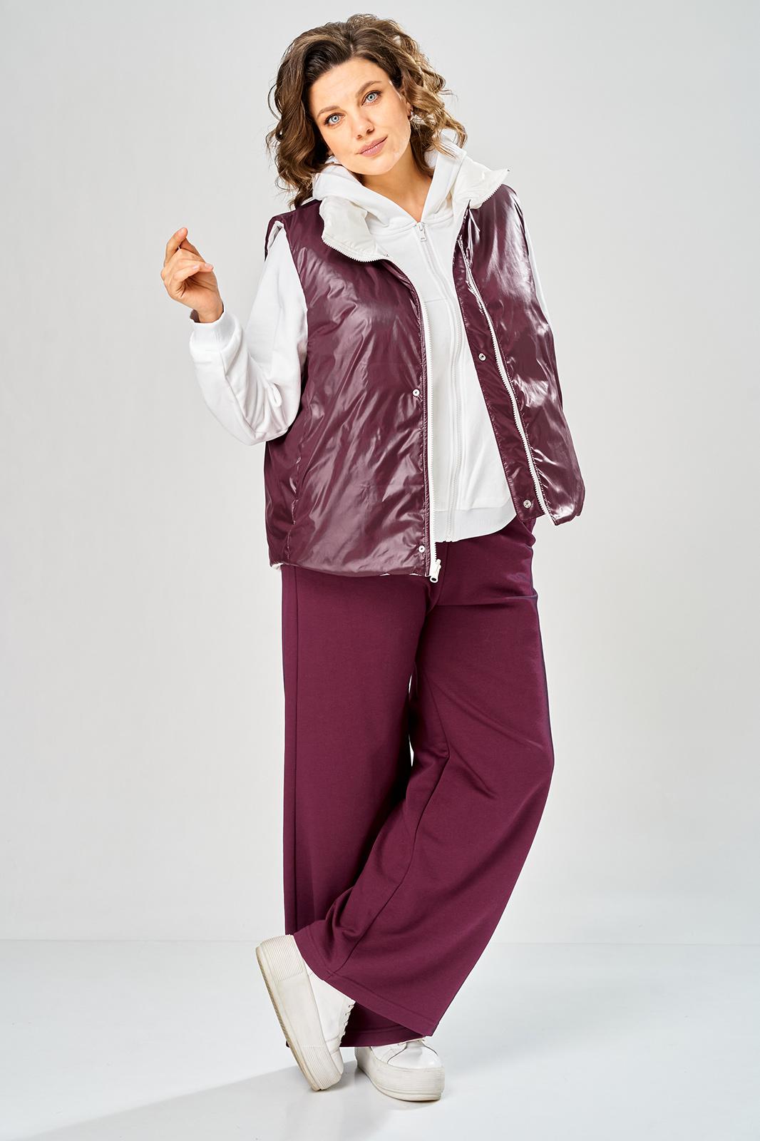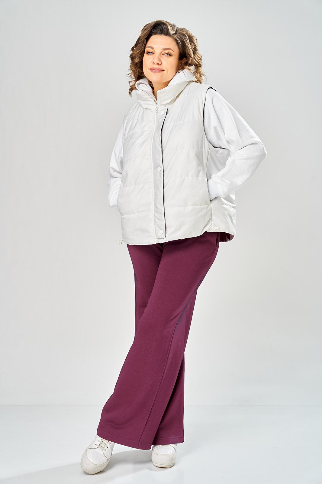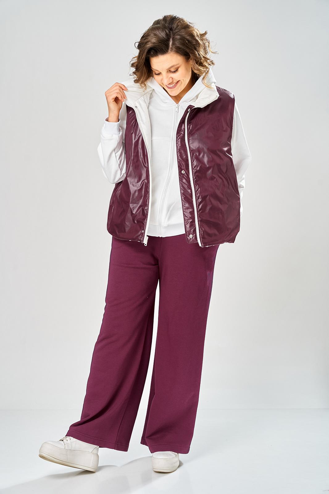 Комплект брючный.Кофта свободного кроя с центральной застежкой на тесьму-молнию. Рукав покроя реглан с притачным манжетом по низу (довяз). По переду и спинке кокетки. Капюшон со средним швом. По низу изделия отделочный пояс (довяз). В качестве отделки используется вышивка. Брюки широкие, верхний срез обработан поясом с резинкой. В боковых швах обработаны карманы.Жилетка женская прямого силуэта с центральной застежкой на тесьму-молнию и отделочную планку на кнопки. Боковой шов смещенный на перед, в шве обработаны карманы. Воротник-стойка со складками по линии горловины. Жилетка двухсторонняя. Температурный режим до +5 градусов. Длина жилетки по спинке 68 см. Длина кофты по спинке 64 см, длина рукава+ширина плеча 72 см. Длина брюк 112 см.