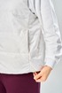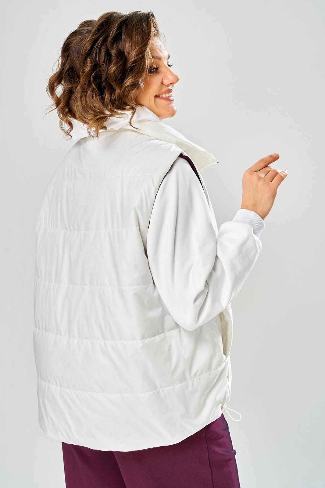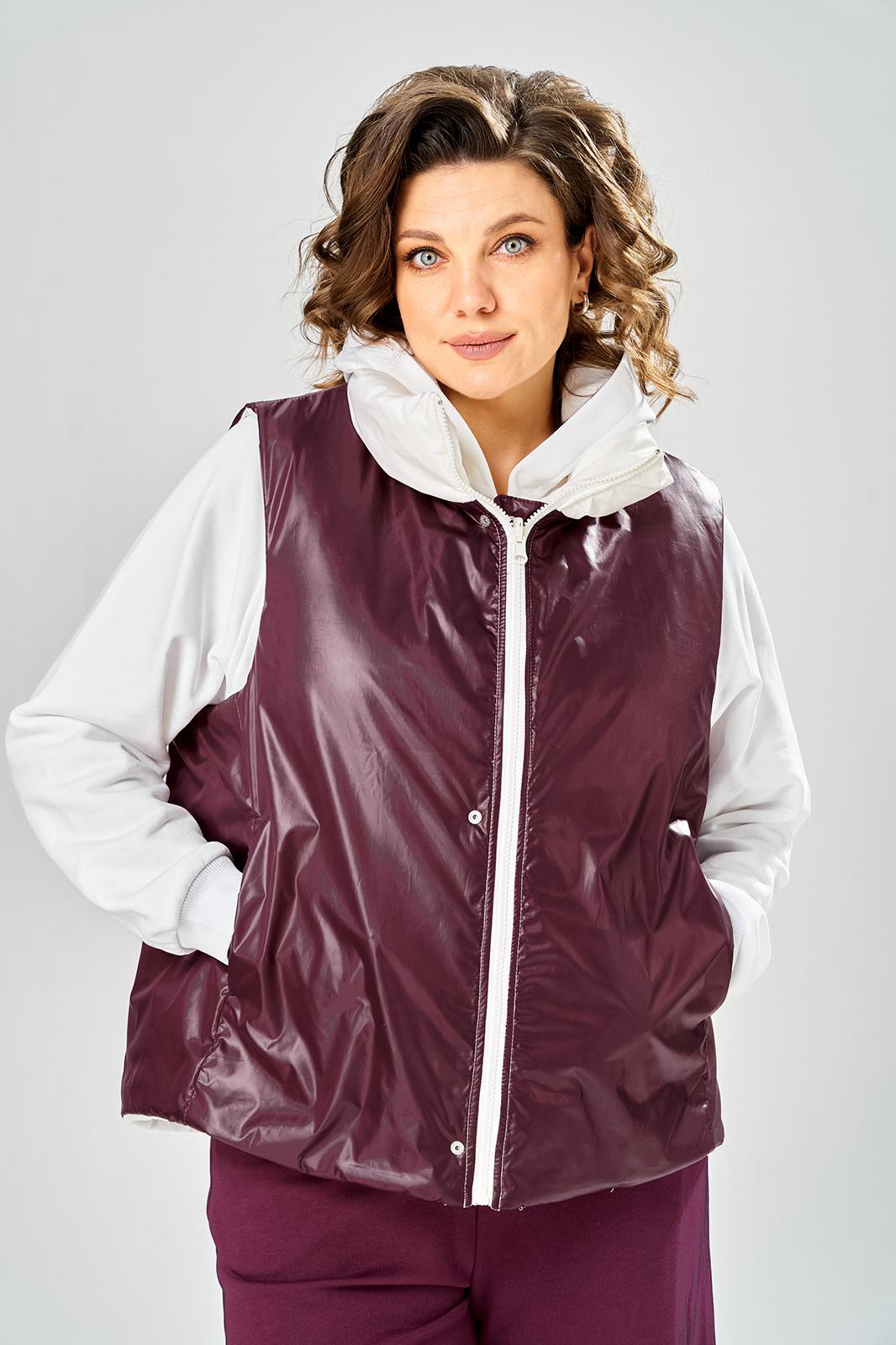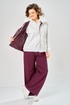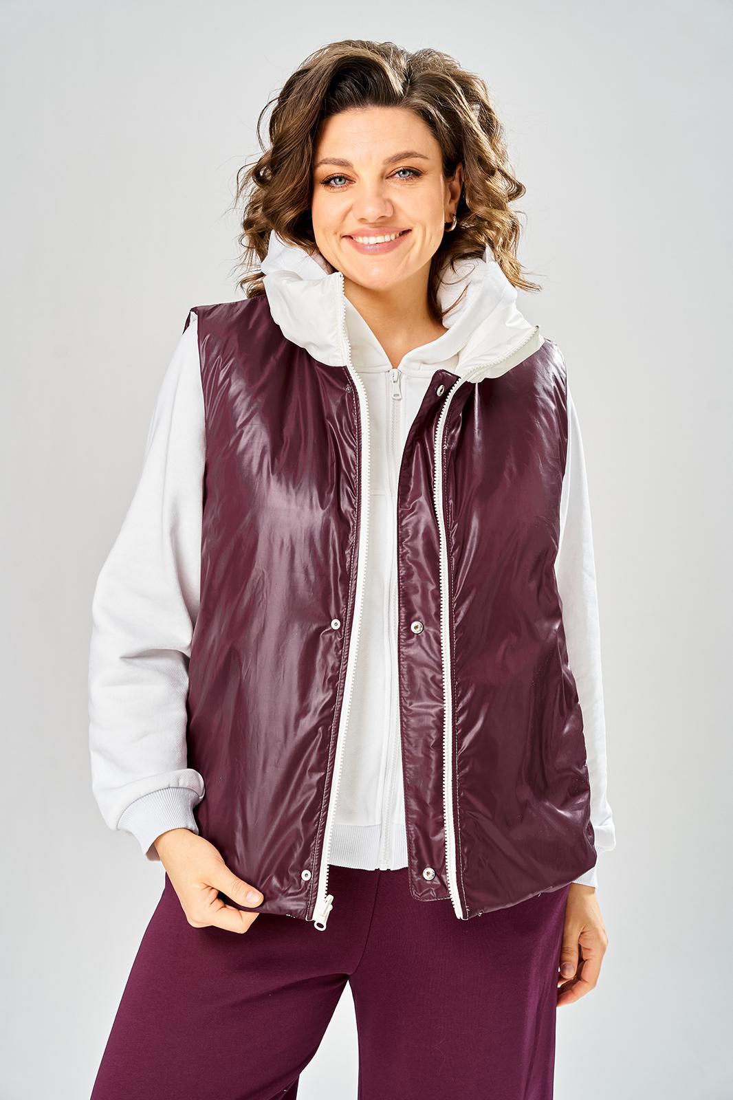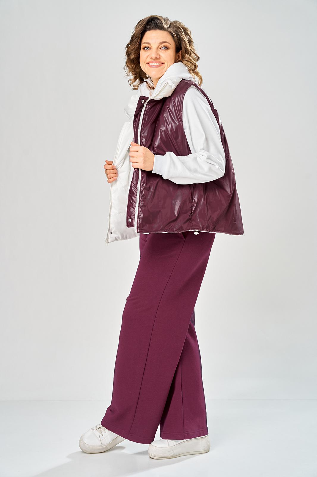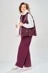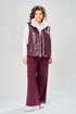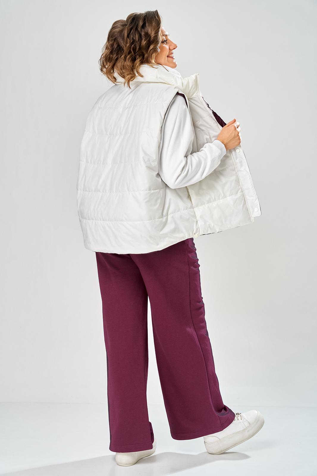 Комплект брючный.Кофта свободного кроя с центральной застежкой на тесьму-молнию. Рукав покроя реглан с притачным манжетом по низу (довяз). По переду и спинке кокетки. Капюшон со средним швом. По низу изделия отделочный пояс (довяз). В качестве отделки используется вышивка. Брюки широкие, верхний срез обработан поясом с резинкой. В боковых швах обработаны карманы.Жилетка женская прямого силуэта с центральной застежкой на тесьму-молнию и отделочную планку на кнопки. Боковой шов смещенный на перед, в шве обработаны карманы. Воротник-стойка со складками по линии горловины. Жилетка двухсторонняя. Температурный режим до +5 градусов. Длина жилетки по спинке 68 см. Длина кофты по спинке 64 см, длина рукава+ширина плеча 72 см. Длина брюк 112 см.