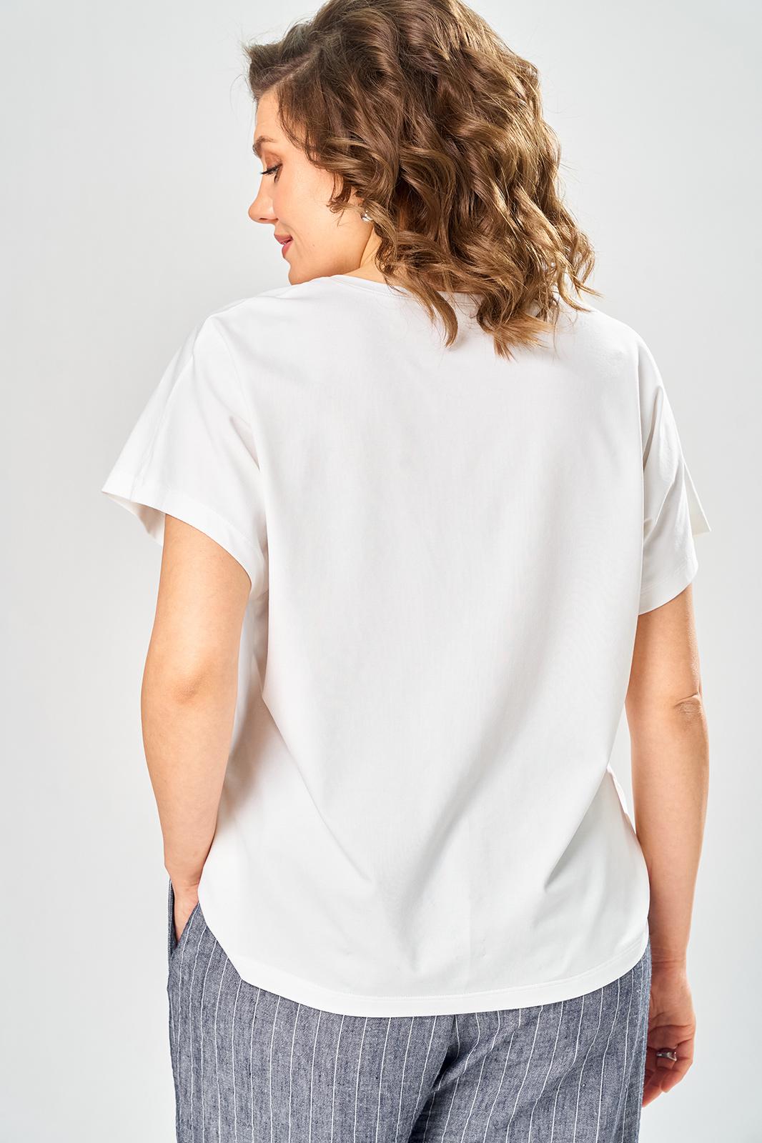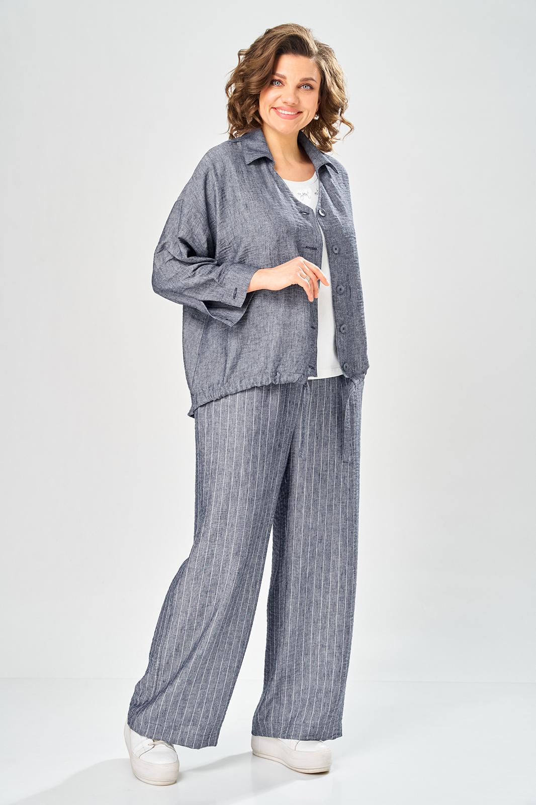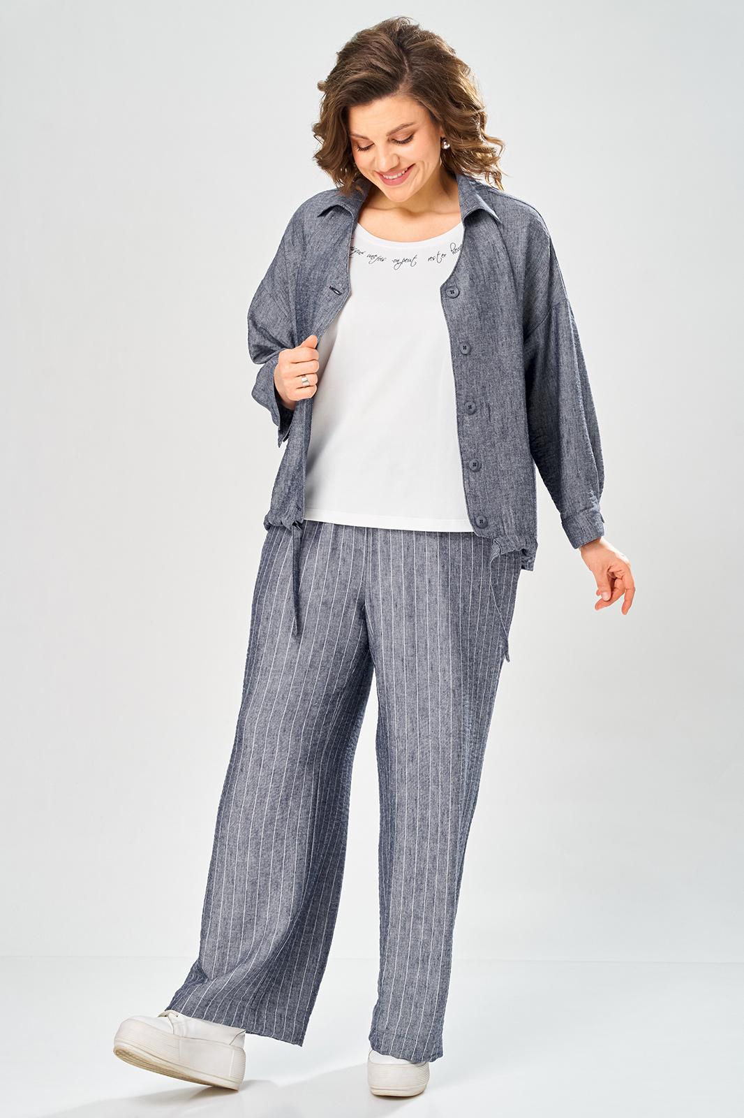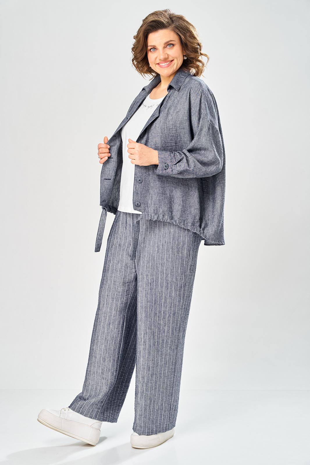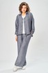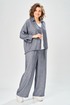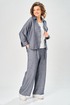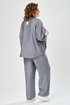 Комплект брючный состоит из кардигана, майки и брюк. Кардиган свободного кроя с застежкой на петли и пуговицы. Перед с кулисой и завязками по низу. Спинка с округлой формой низа и ассиметричным передом. Рукав одношовный, длиной 3/4 со спущенной линией плеча. Горловина V-образной формы с воротником. Брюки прямые, пояс на резинке, с боковыми карманами. Майка трикожная со спущенной линией плеча. Горловина округлая.