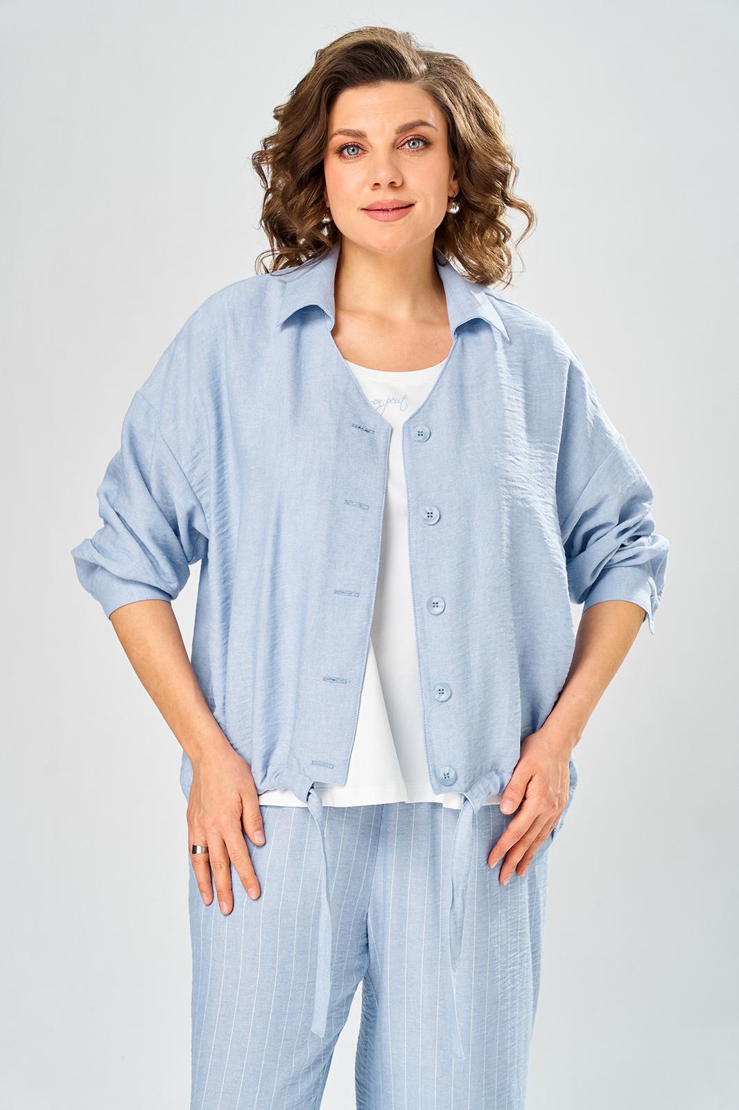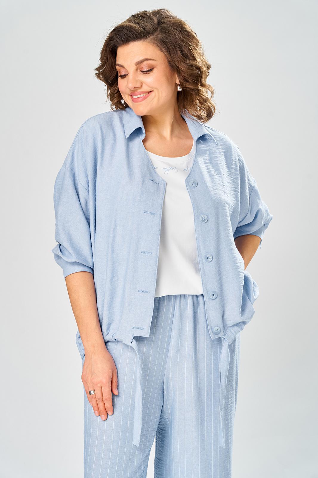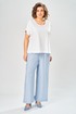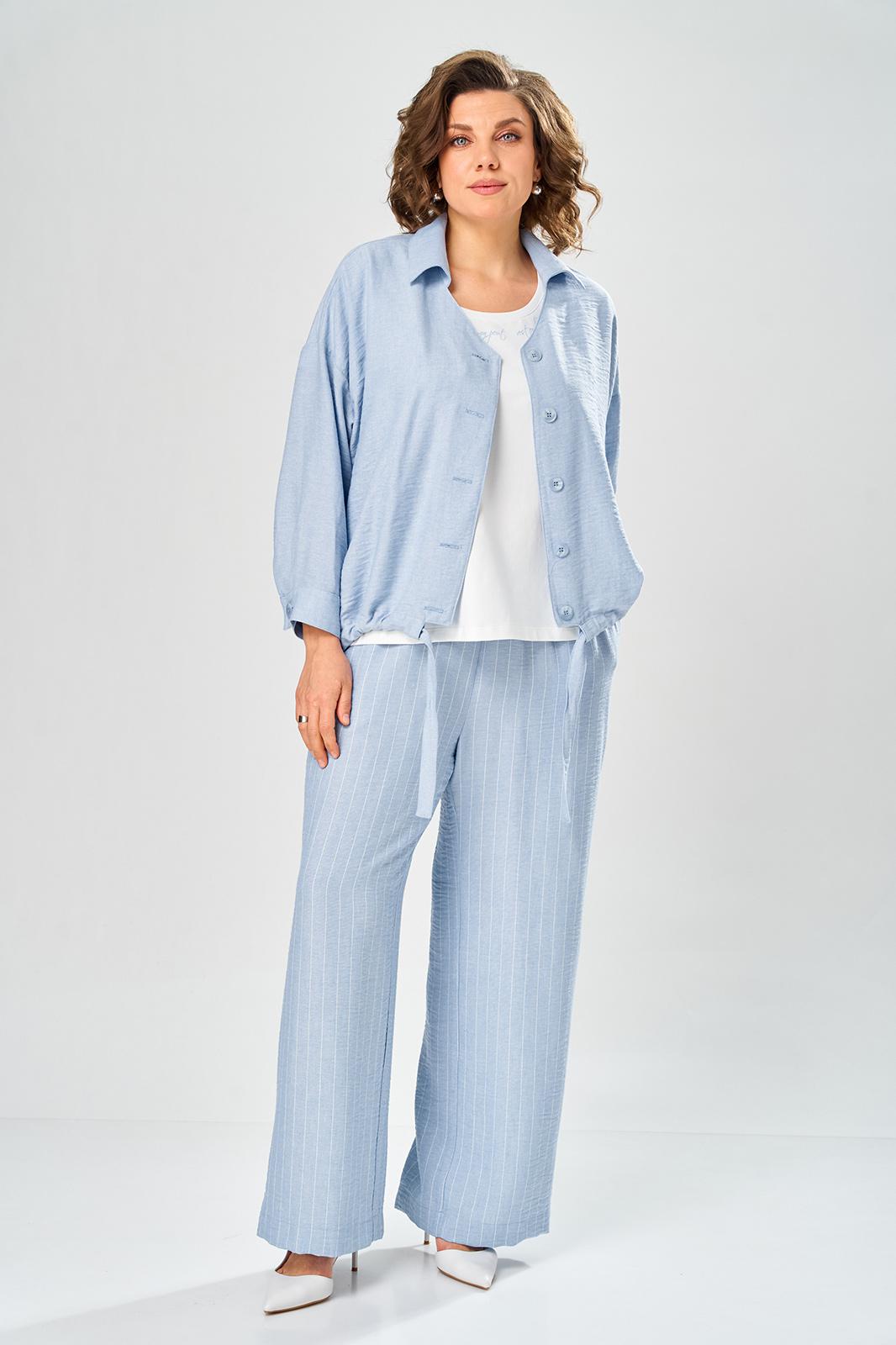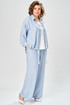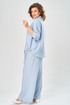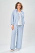 Комплект брючный состоит из кардигана, майки и брюк. Кардиган свободного кроя с застежкой на петли и пуговицы. Перед с кулисой и завязками по низу. Спинка с округлой формой низа и ассиметричным передом. Рукав одношовный, длиной 3/4 со спущенной линией плеча. Горловина V-образной формы с воротником. Брюки прямые, пояс на резинке, с боковыми карманами. Майка трикожная со спущенной линией плеча. Горловина округлая.
