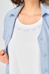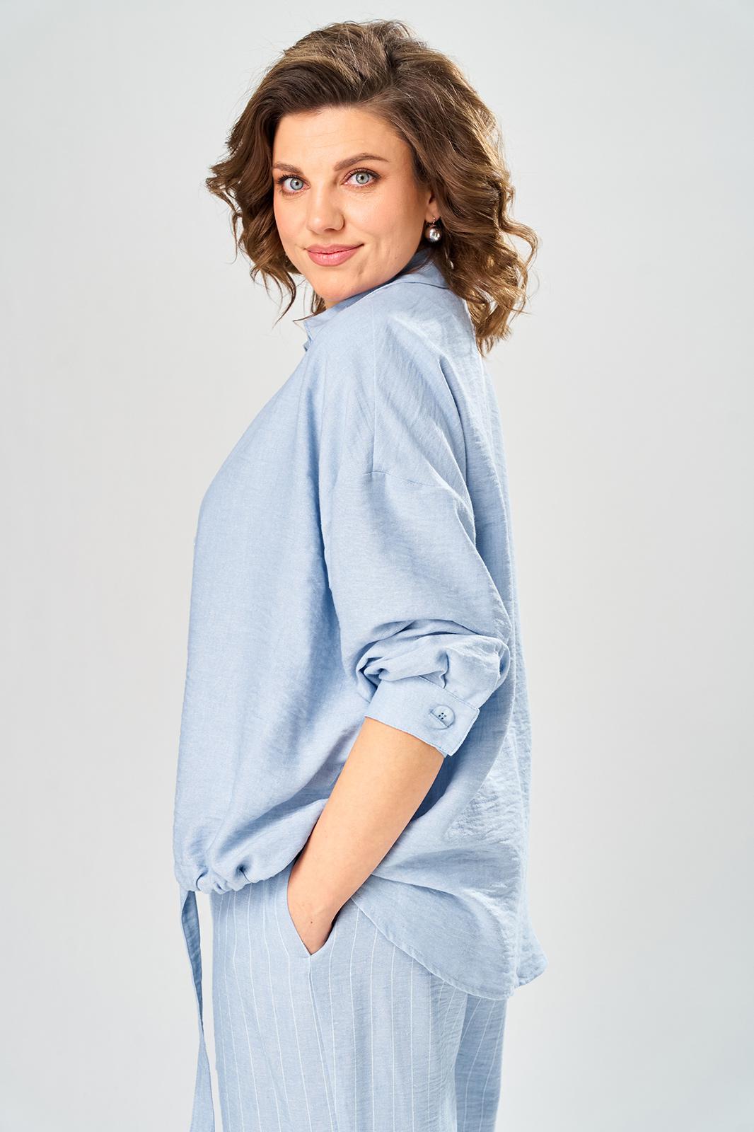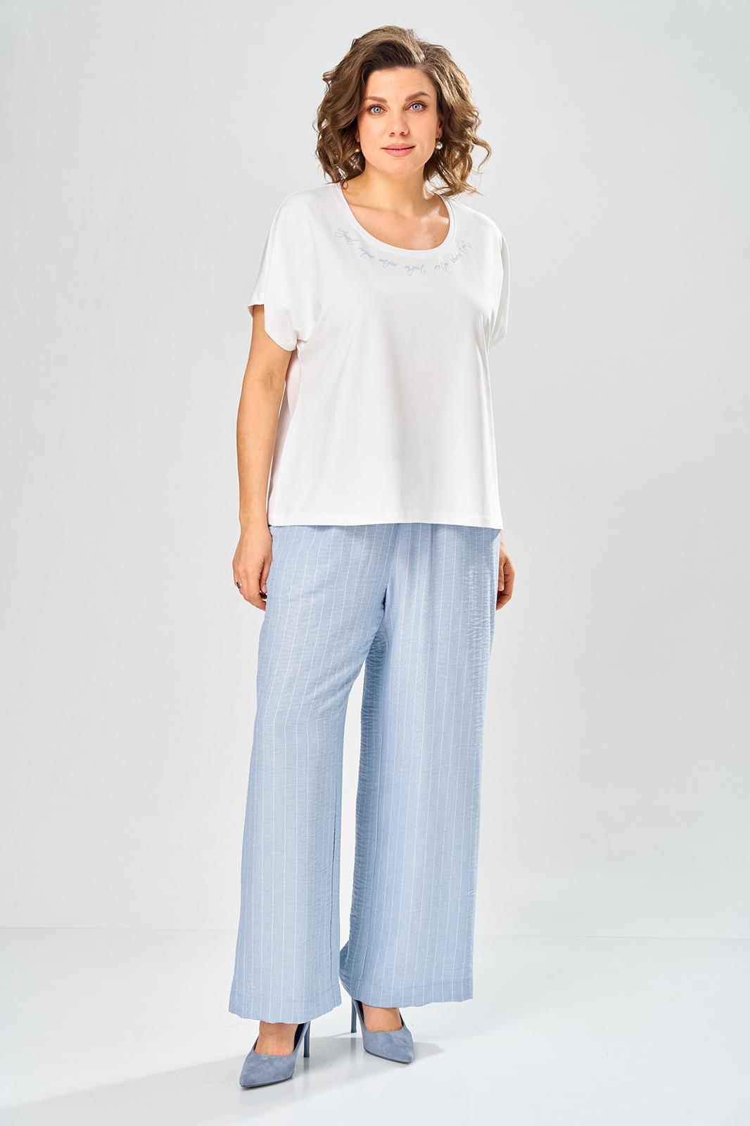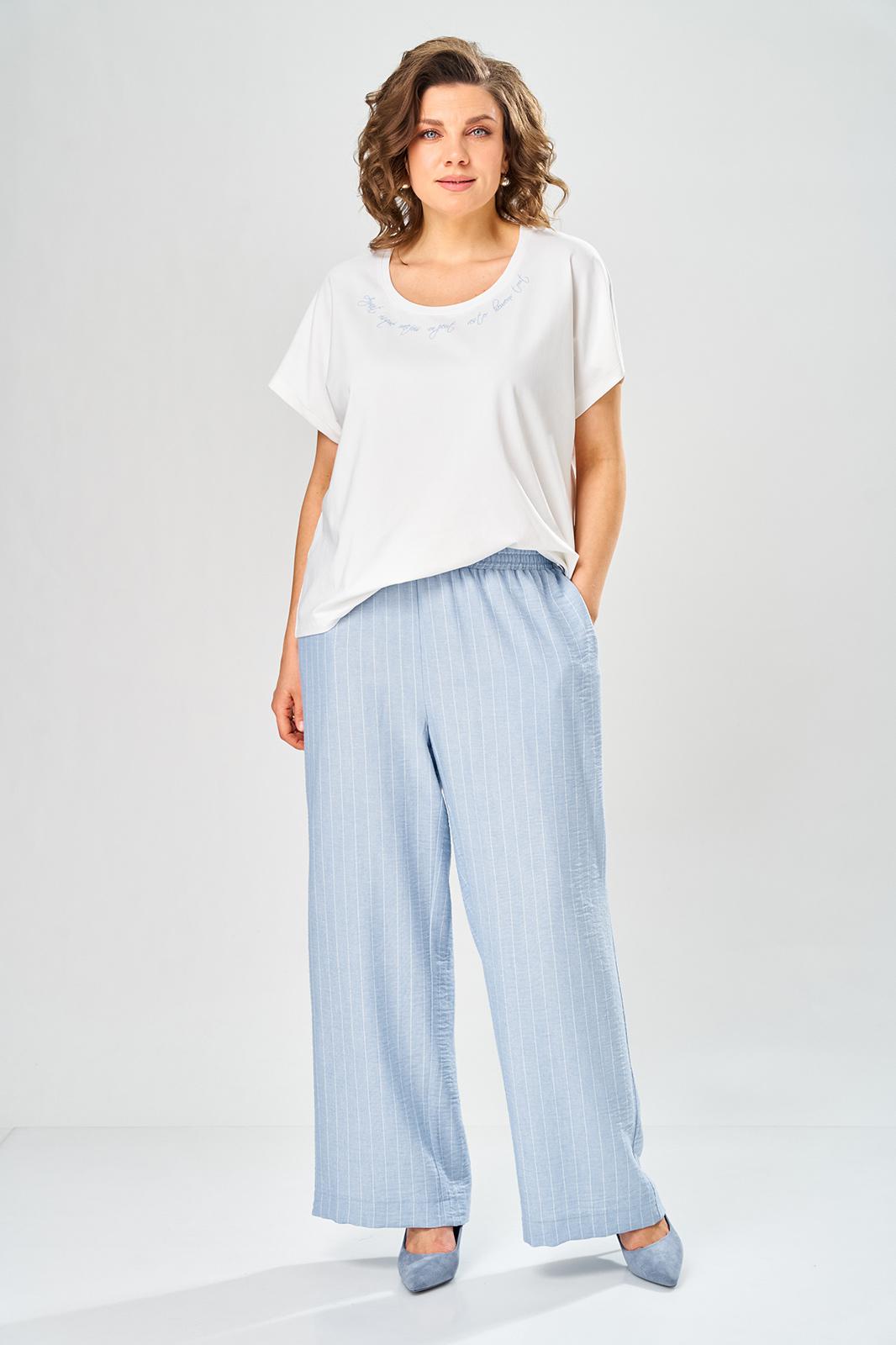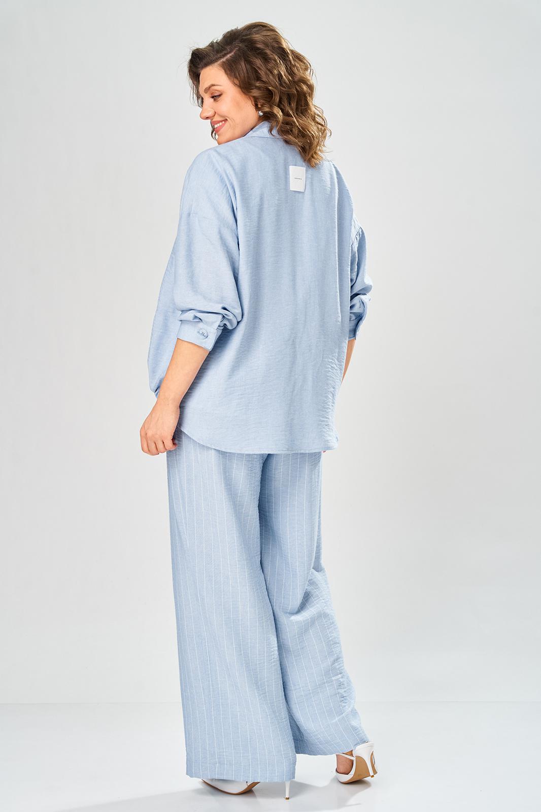 Комплект брючный состоит из кардигана, майки и брюк. Кардиган свободного кроя с застежкой на петли и пуговицы. Перед с кулисой и завязками по низу. Спинка с округлой формой низа и ассиметричным передом. Рукав одношовный, длиной 3/4 со спущенной линией плеча. Горловина V-образной формы с воротником. Брюки прямые, пояс на резинке, с боковыми карманами. Майка трикожная со спущенной линией плеча. Горловина округлая.