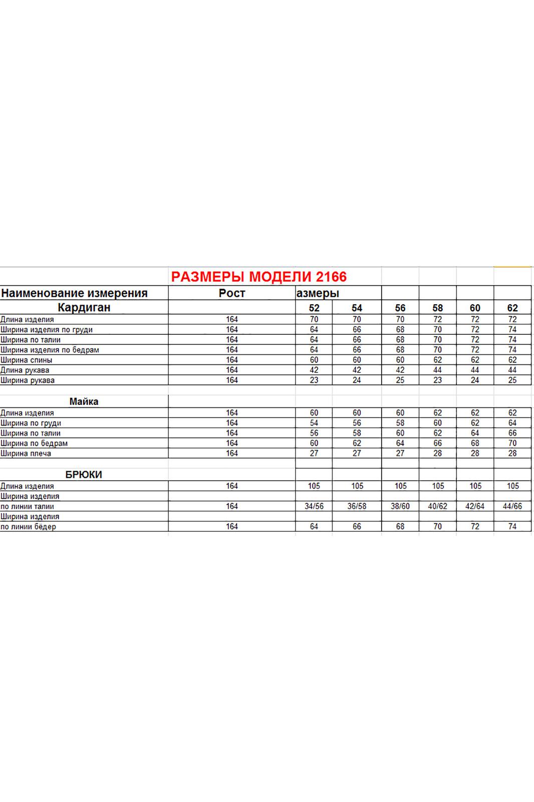 Длина кардигана по спинке 70-72 см, длина рукава 42-44 см. Длина майки по спинке 60-62 см. Длина брюк 105 см.