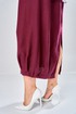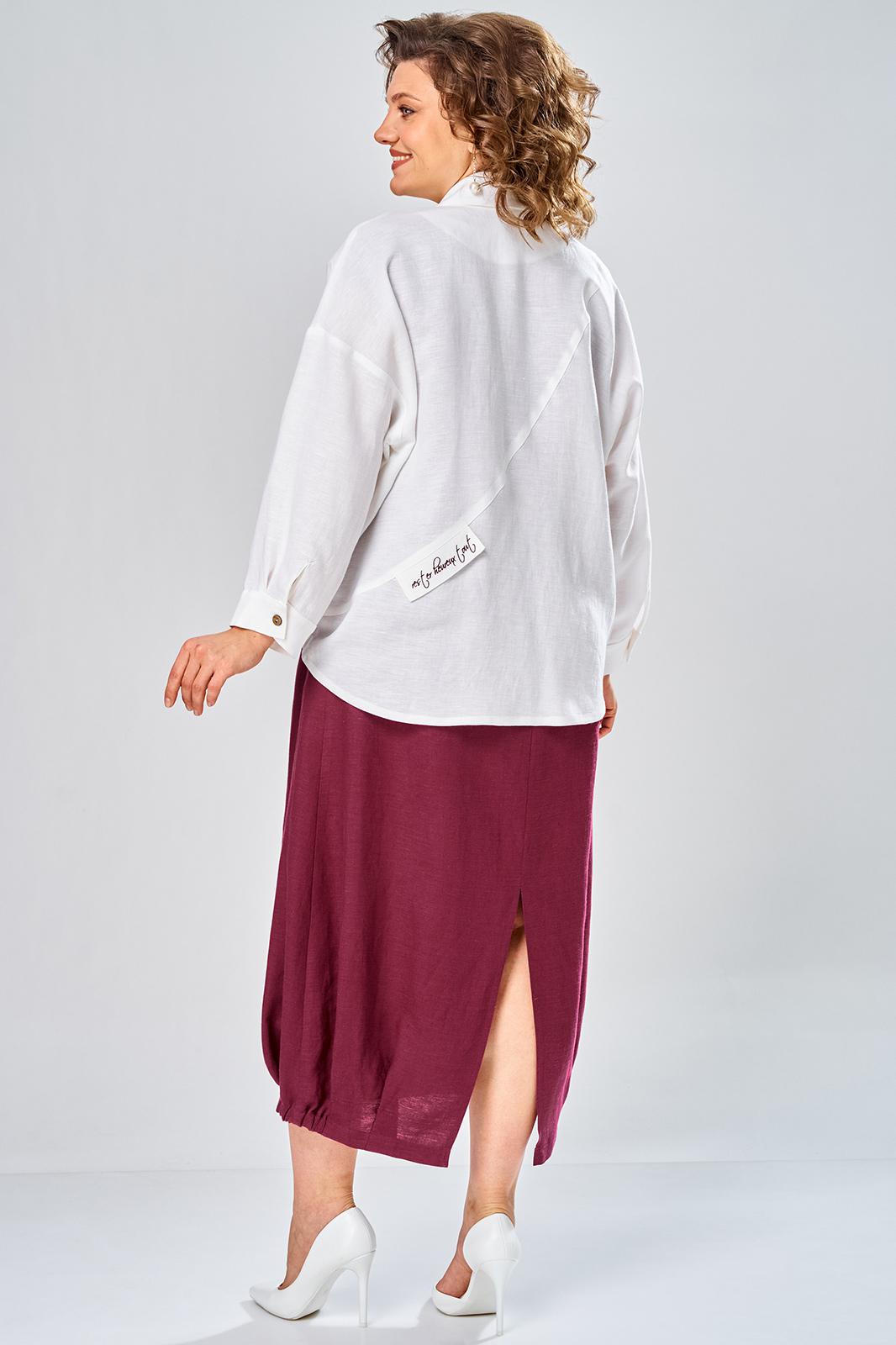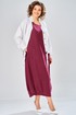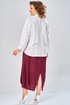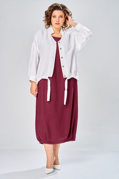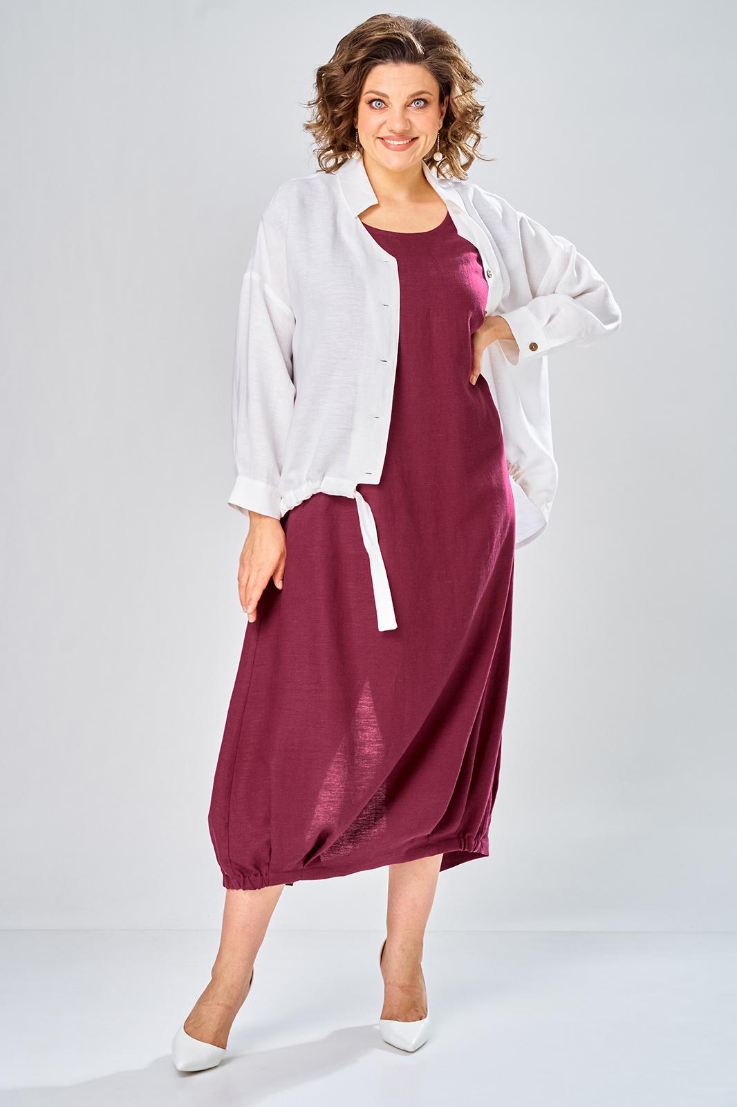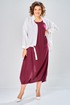 Комплект женский состоит из рубашки и платья. Платье длинное, свободного кроя. Спинка со среднем швом, разрезом, талиевыми вытачками, 2-мя складками по низу. Перед с нагрудными вытачками и складками по низу. Карманы обработаны в боковых швах. Низ платья по бокам собран на резинку. Рубашка совбодного кроя с центральной застежкой на 5 петель и пуговиц. Спинка с округлым подрезом и отделкой в ивде надписи. Перед по низу фиксируется кулисой и завязками. Воротник на стойке с обработанной горловиной . Рукав втачной, одношовный со спущенной линией плеча. По низу рукава манжет с застежкой. Длина платья по спинке 125 см. Длитна рубашки по спинке 70 см, длина рукава 40 см.
